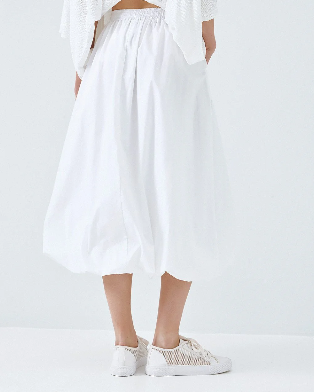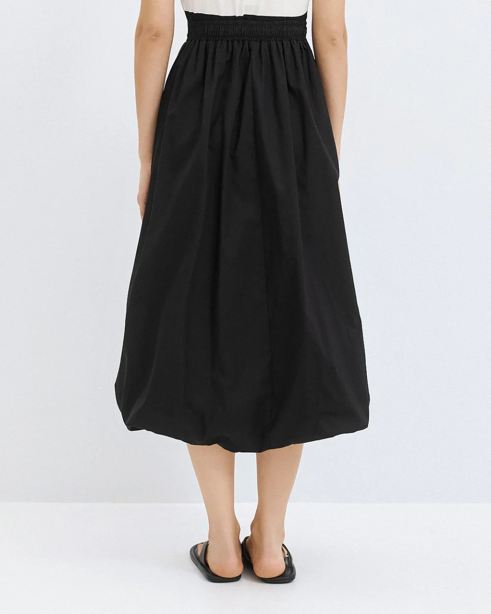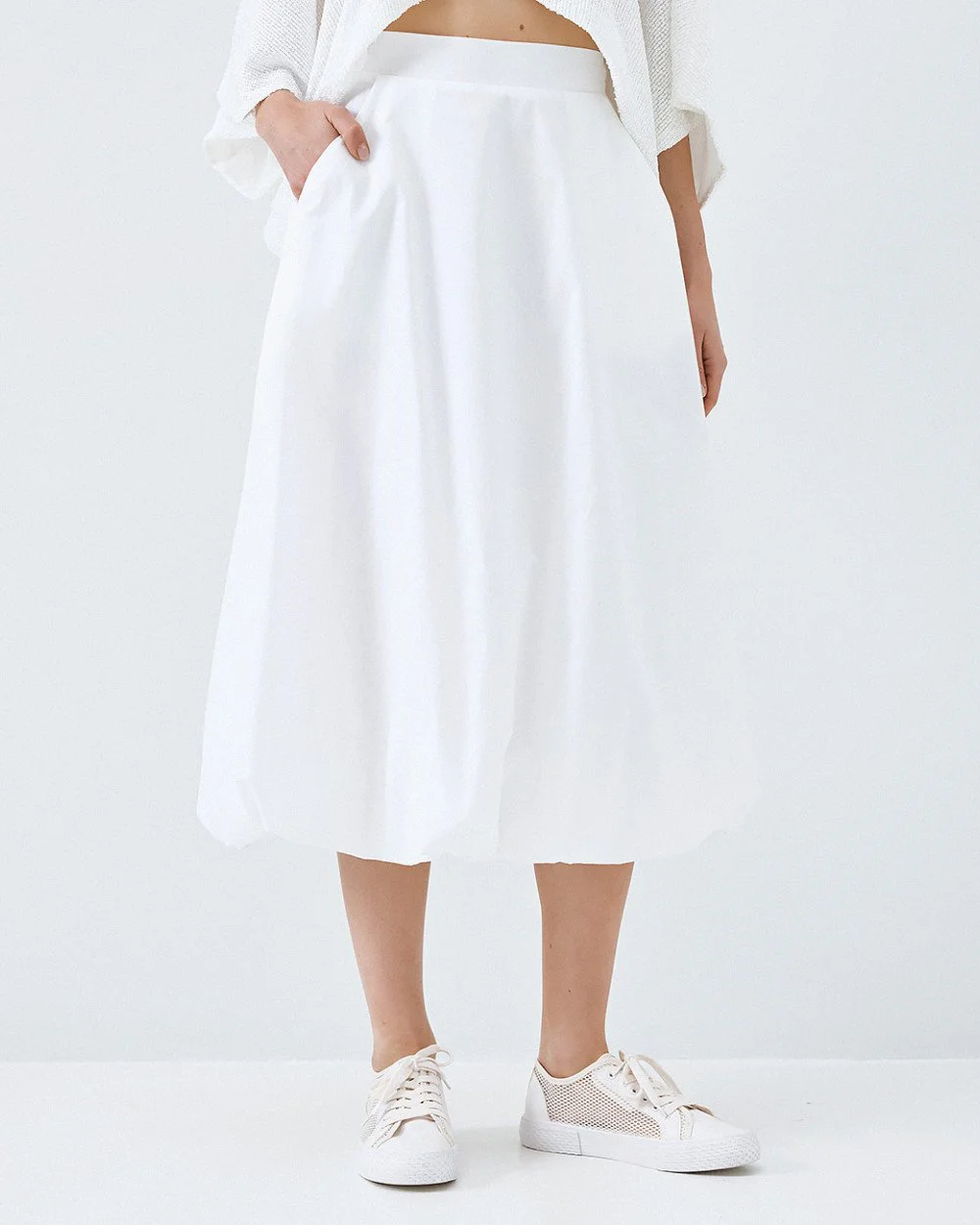 Midi balloon skirt with an elastic waistband, side pockets and an inner lining.