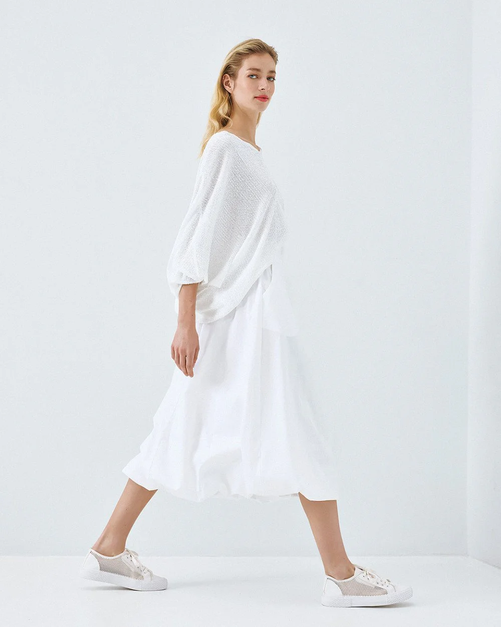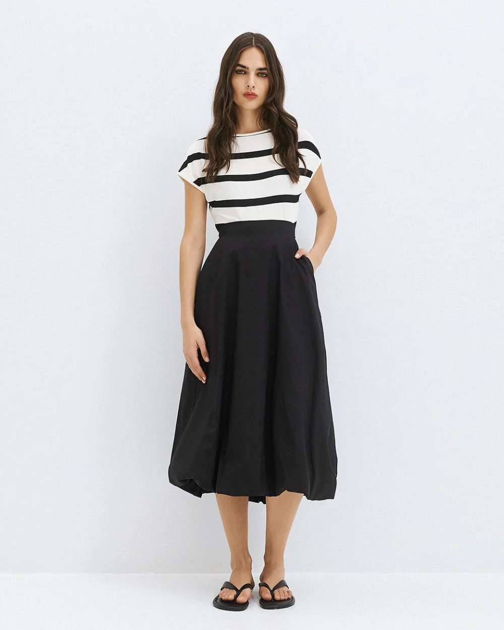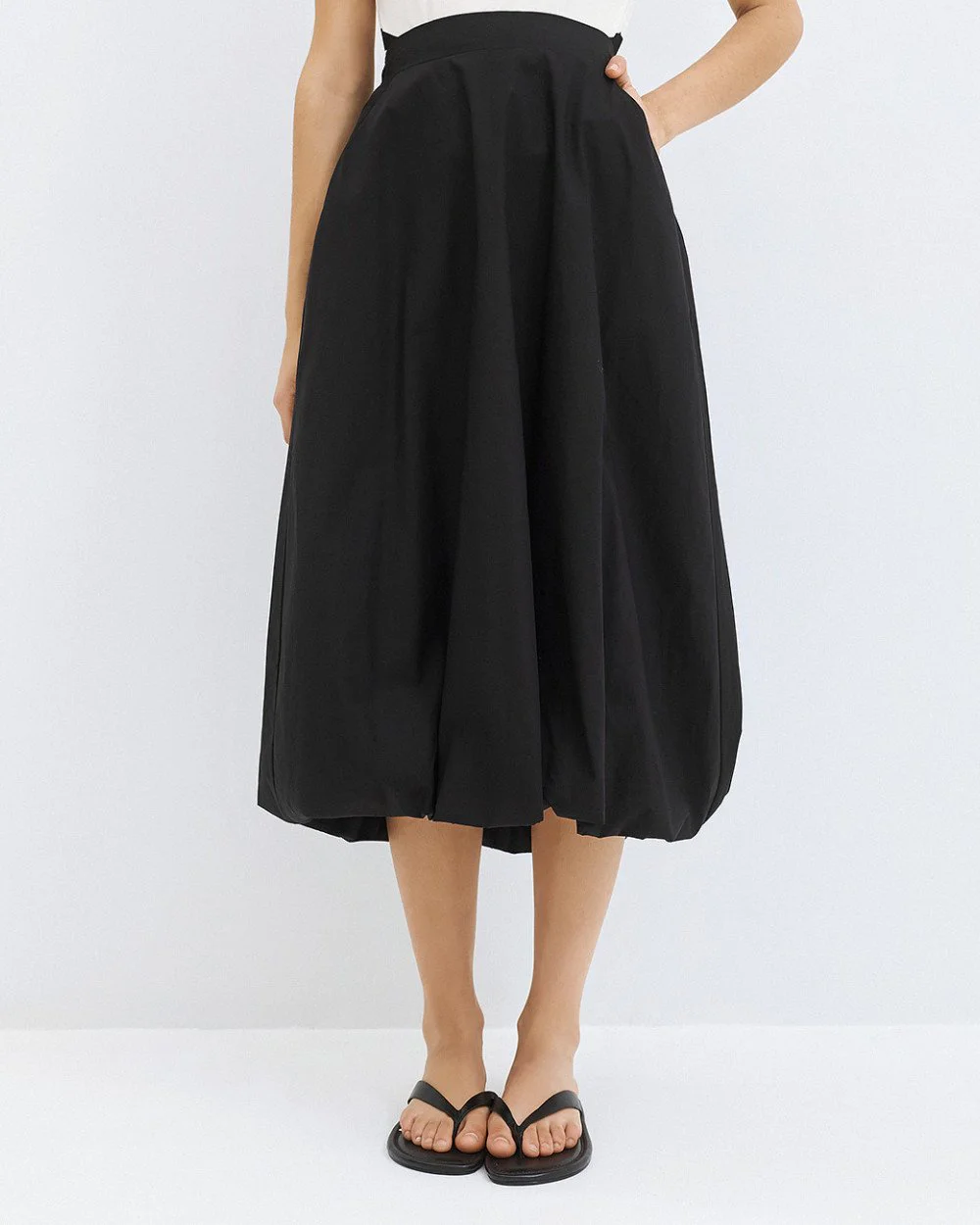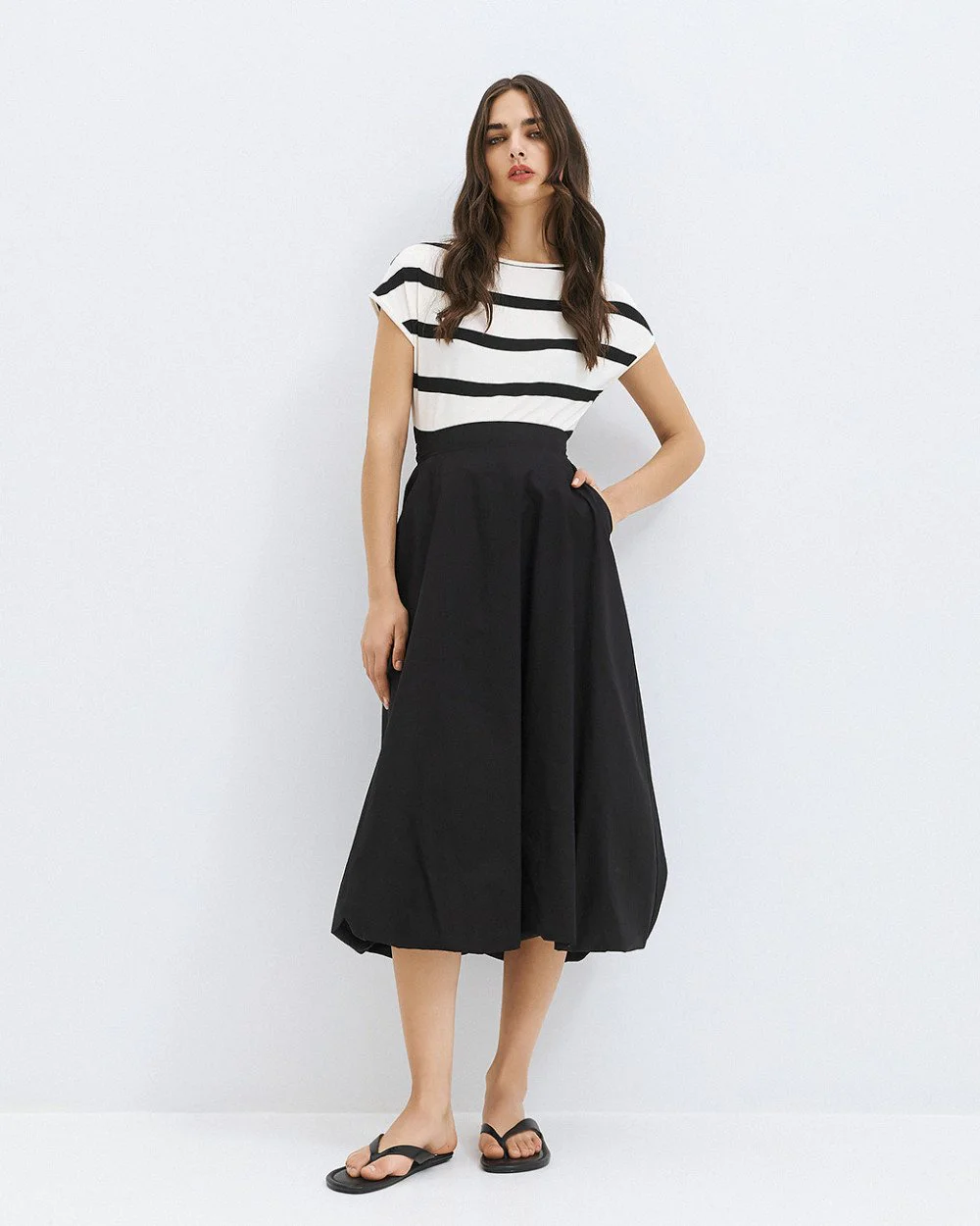 Midi balloon skirt with an elastic waistband, side pockets and an inner lining.