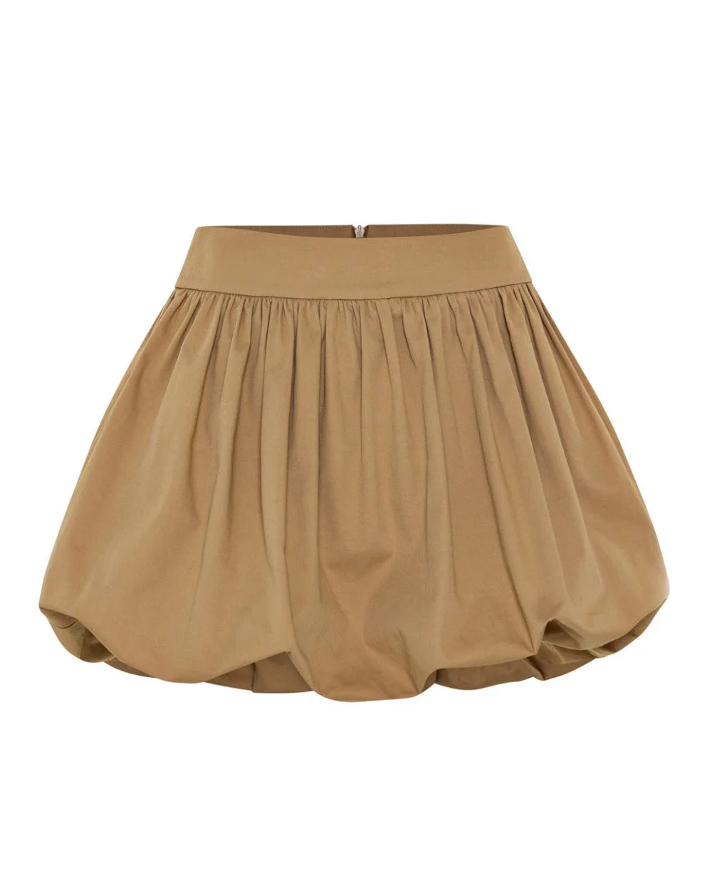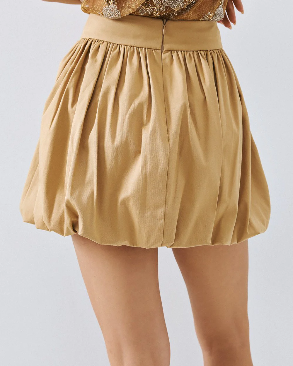 Mini balloon skirt with gathered details, a back zip closure, and an inner lining.