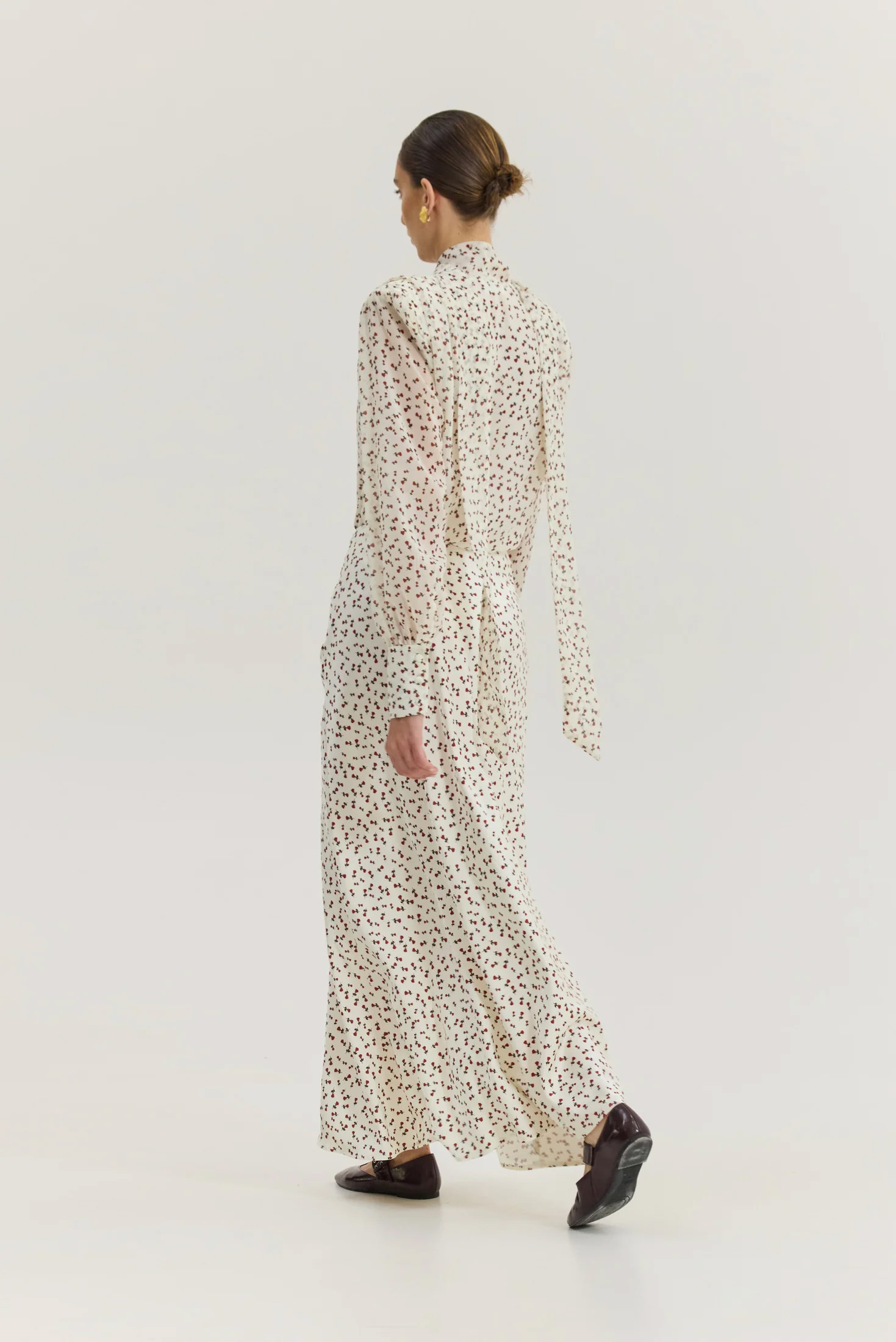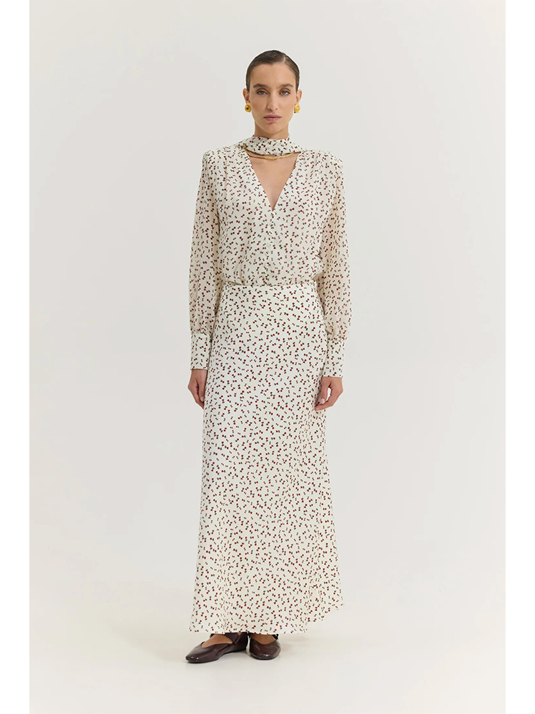 An elegant high-waist maxi skirt featuring a delicate small rose print on a cream background. Designed with a flattering mermaid fit and silky touch fabric.