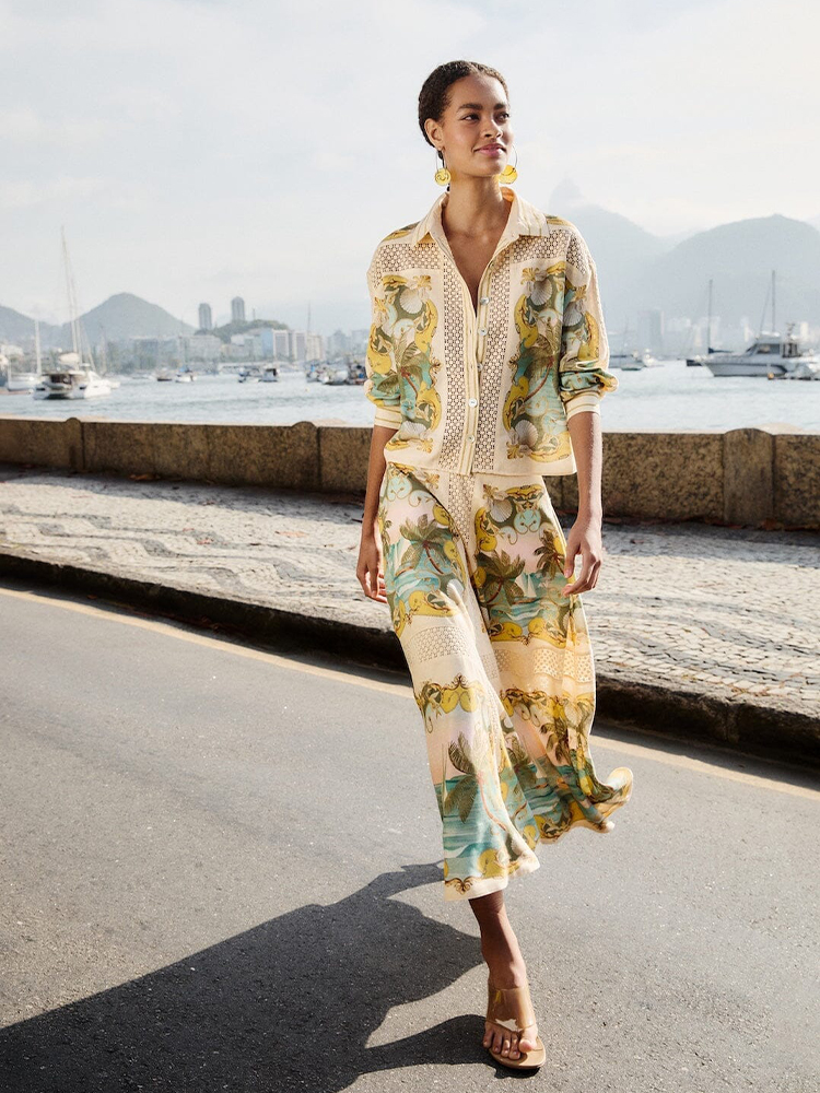 Flowing with the spirit of sunlit beaches, the Sand Royal Sea Crochet Midi Skirt from FARM Rio delights in its intricate crochet pattern, blending soft sandy hues with pops of ocean-inspired blues. Crafted from sustainable Lenzing™ Ecovero™ and Euroflax™ fibers, this knitwear piece embraces a breezy, flattering silhouette that moves effortlessly. Its delicate texture and playful, handcrafted feel invite warmth and joy into every step you take.