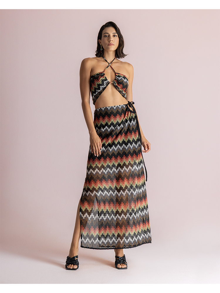 This maxi skirt features a bold multicolor zigzag pattern. Designed with a wrap silhouette,high slit and ties at the waist to create an adjustable fit.