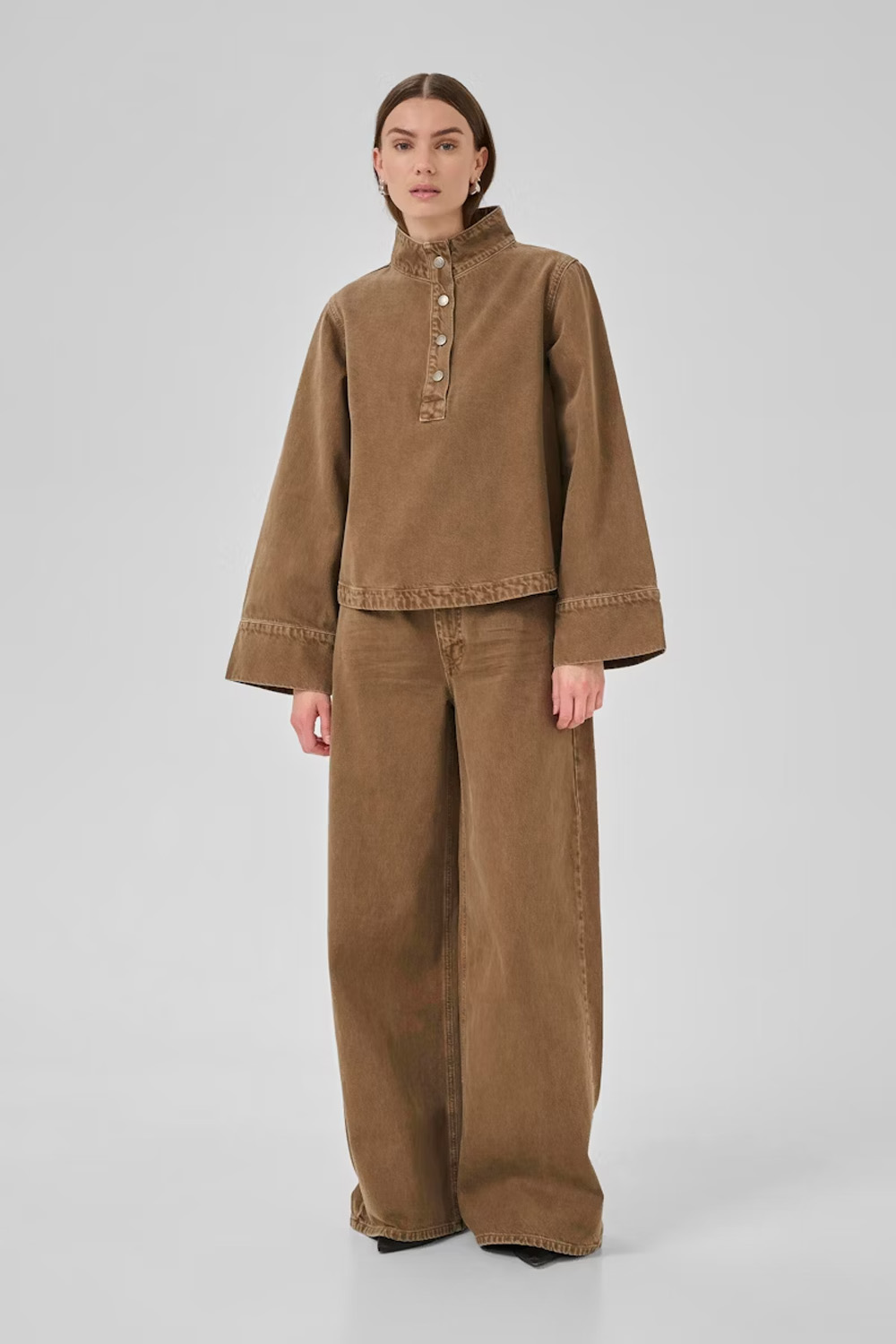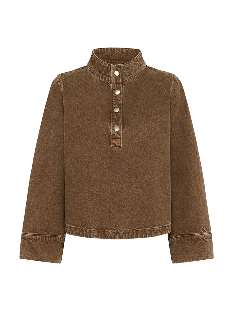 This denim shirt from My Essential Wardrobe is crafted in organic cotton with a relaxed, straight silhouette. Designed with a high collar, button placket, and wide long sleeves, it balances casual ease with versatile styling for everyday wear.