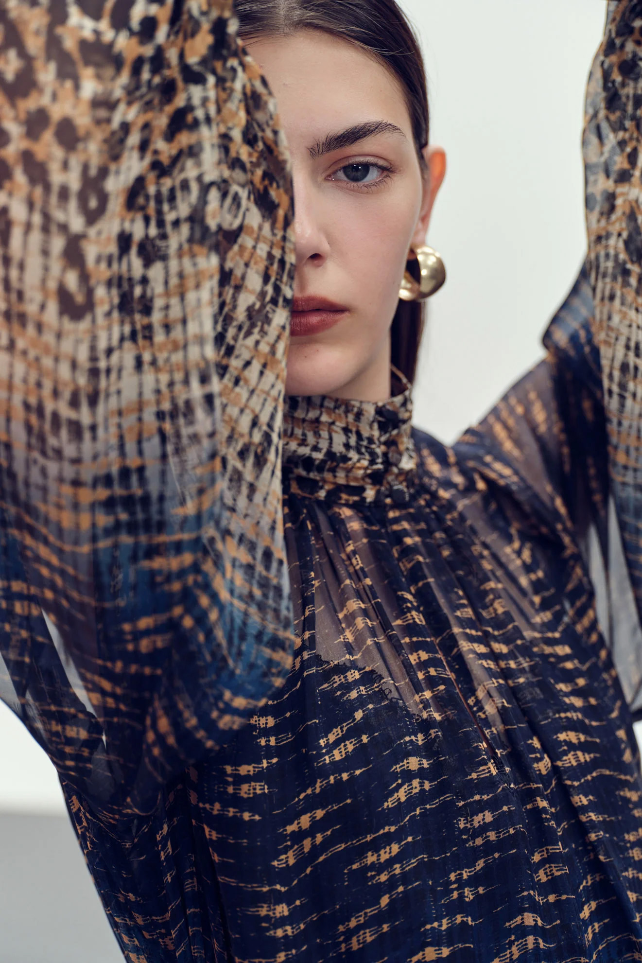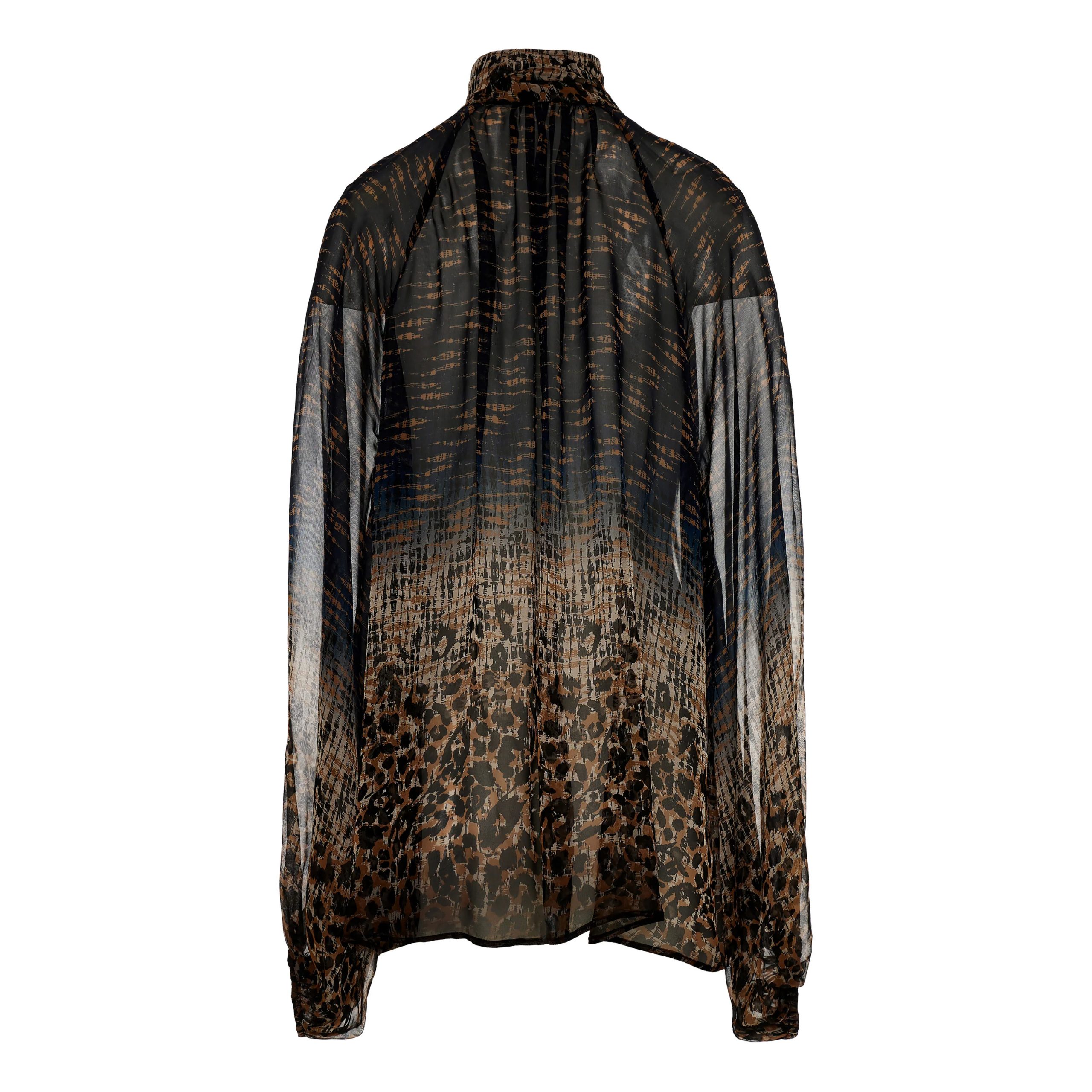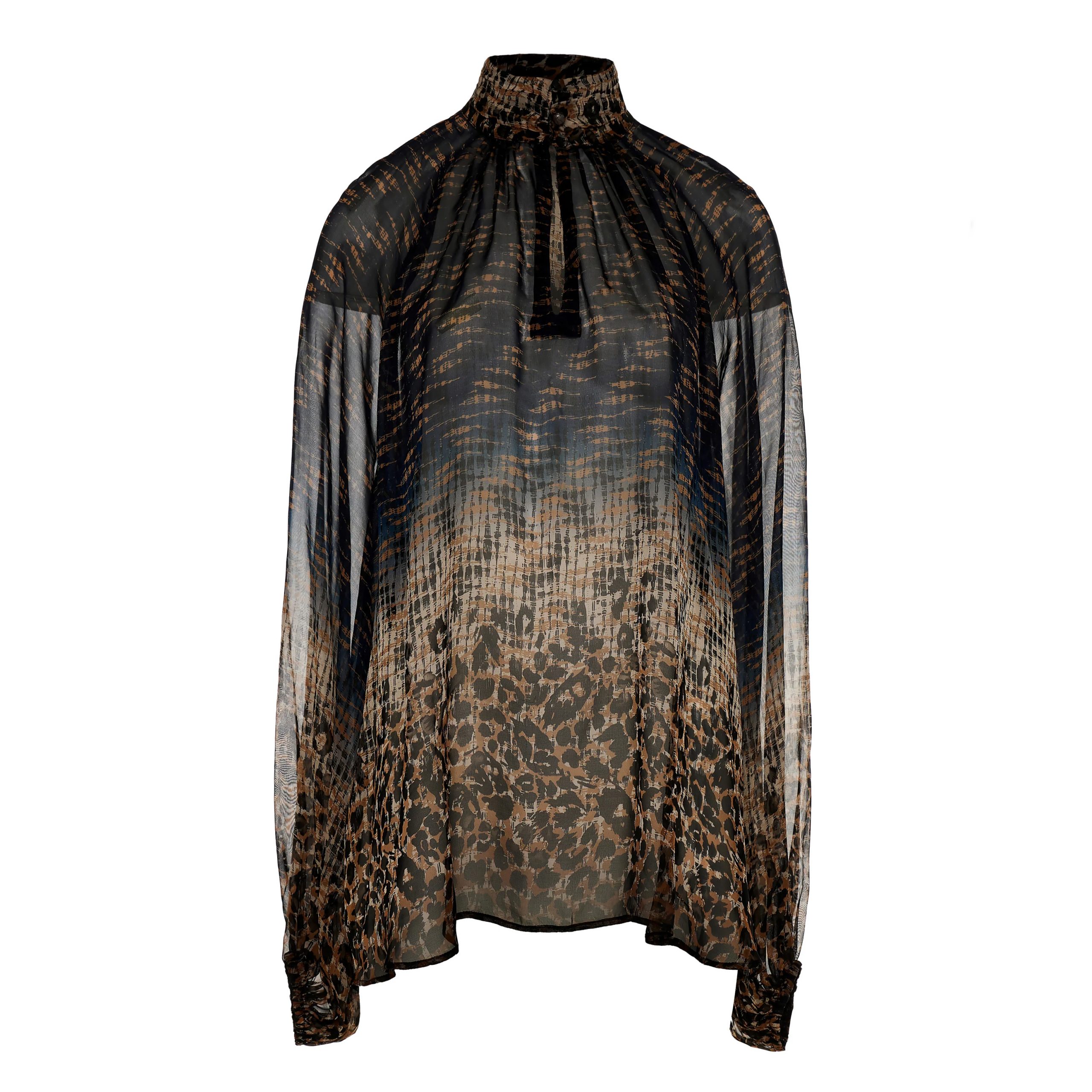 This sheer high-neck blouse combines bold patterning with an effortlessly elegant silhouette. Crafted from lightweight fabric, it features a gradient animal-inspired print that transitions from deep black and earthy browns to soft neutral tones. The gathered neckline with an opening adds refinement, while the voluminous long sleeves with elastic cuffs bring soft movement and flow.