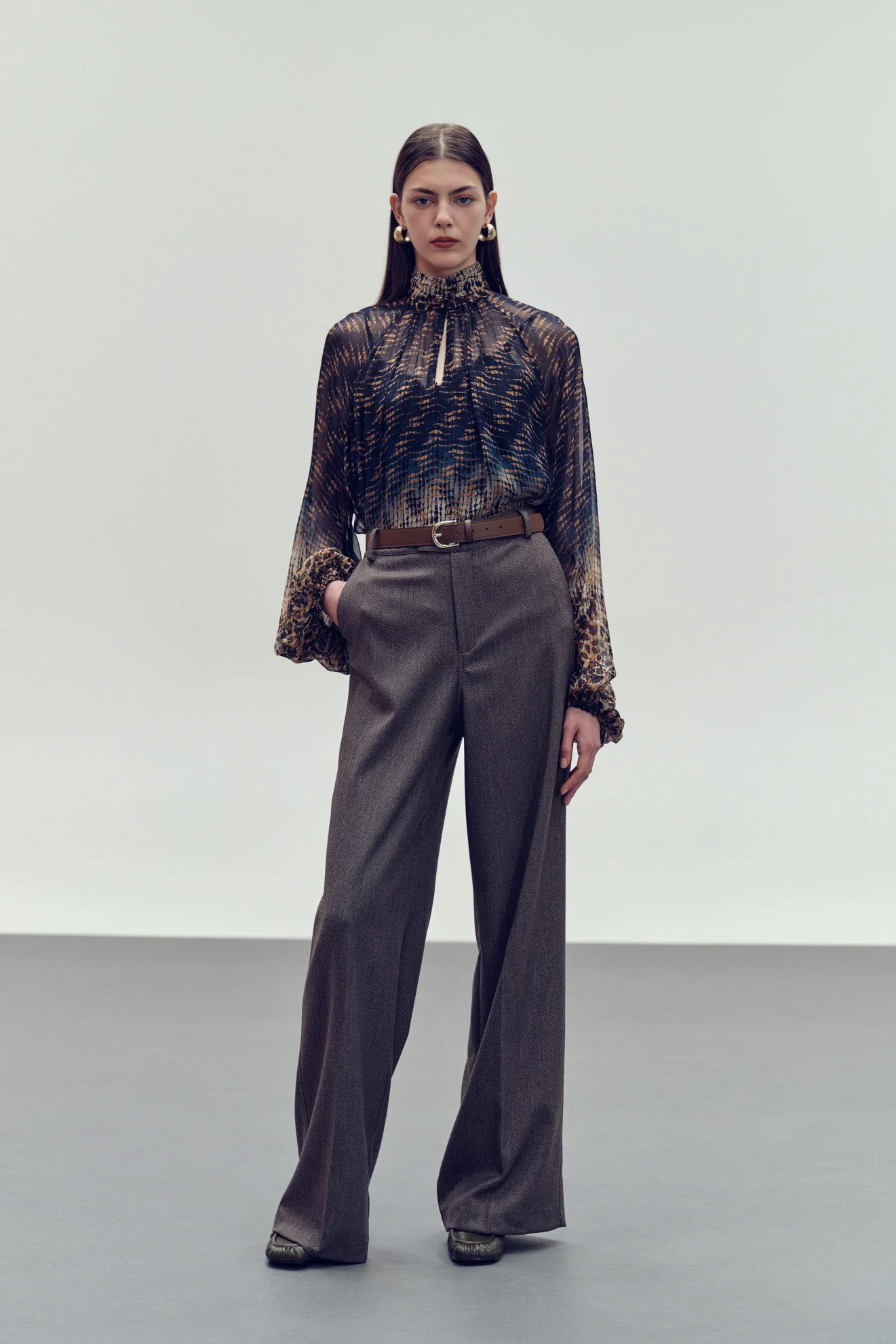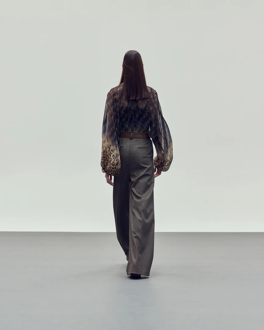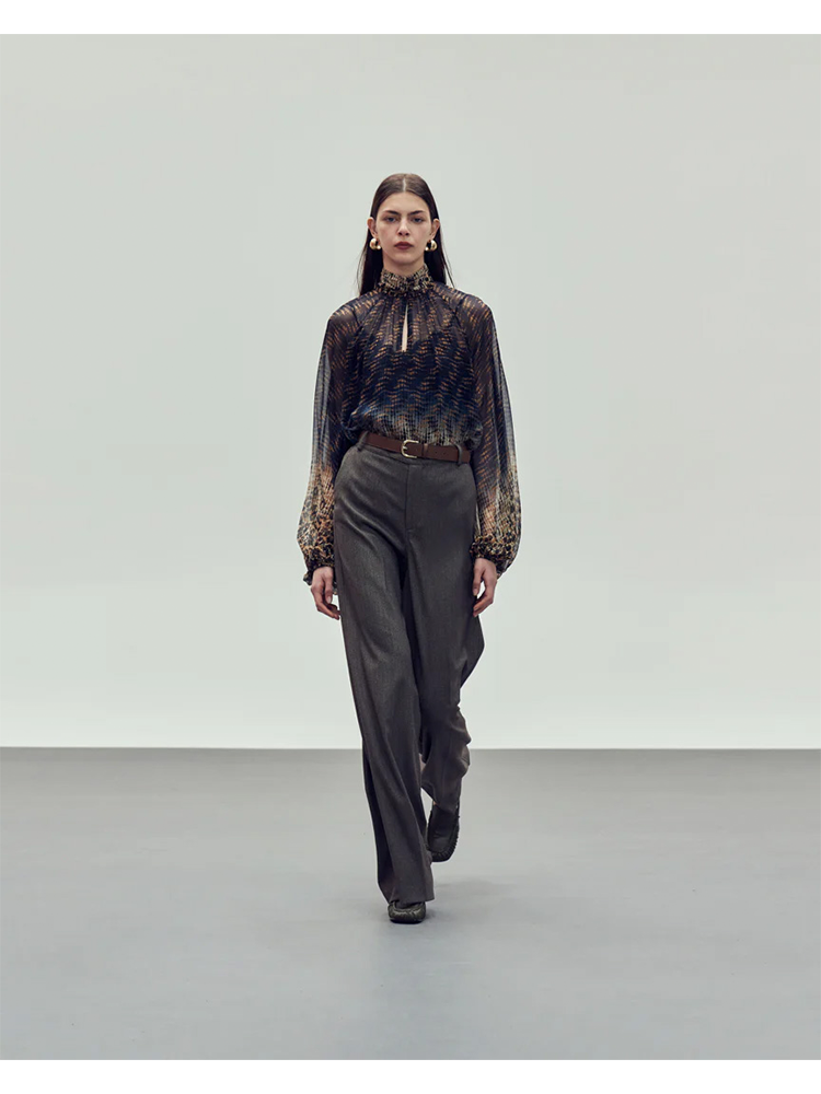 This sheer high-neck blouse combines bold patterning with an effortlessly elegant silhouette. Crafted from lightweight fabric, it features a gradient animal-inspired print that transitions from deep black and earthy browns to soft neutral tones. The gathered neckline with an opening adds refinement, while the voluminous long sleeves with elastic cuffs bring soft movement and flow.