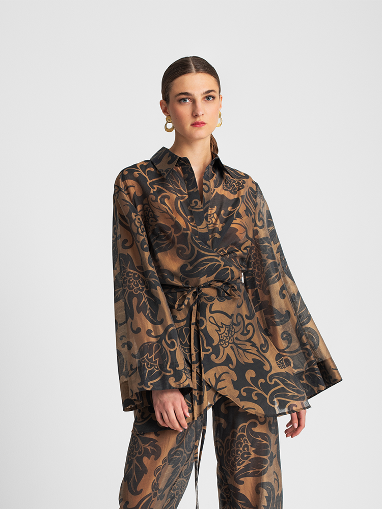 Baroque print belted blouse is a statement piece designed for bold sophistication. Crafted in a lightweight fabric with a flowing silhouette, it features wide sleeves, a classic collar, and a self-tie belt that cinches the waist for a flattering shape. The intricate black-on-bronze baroque pattern adds richness and depth, making it perfect for both coordinated looks and standout separates.