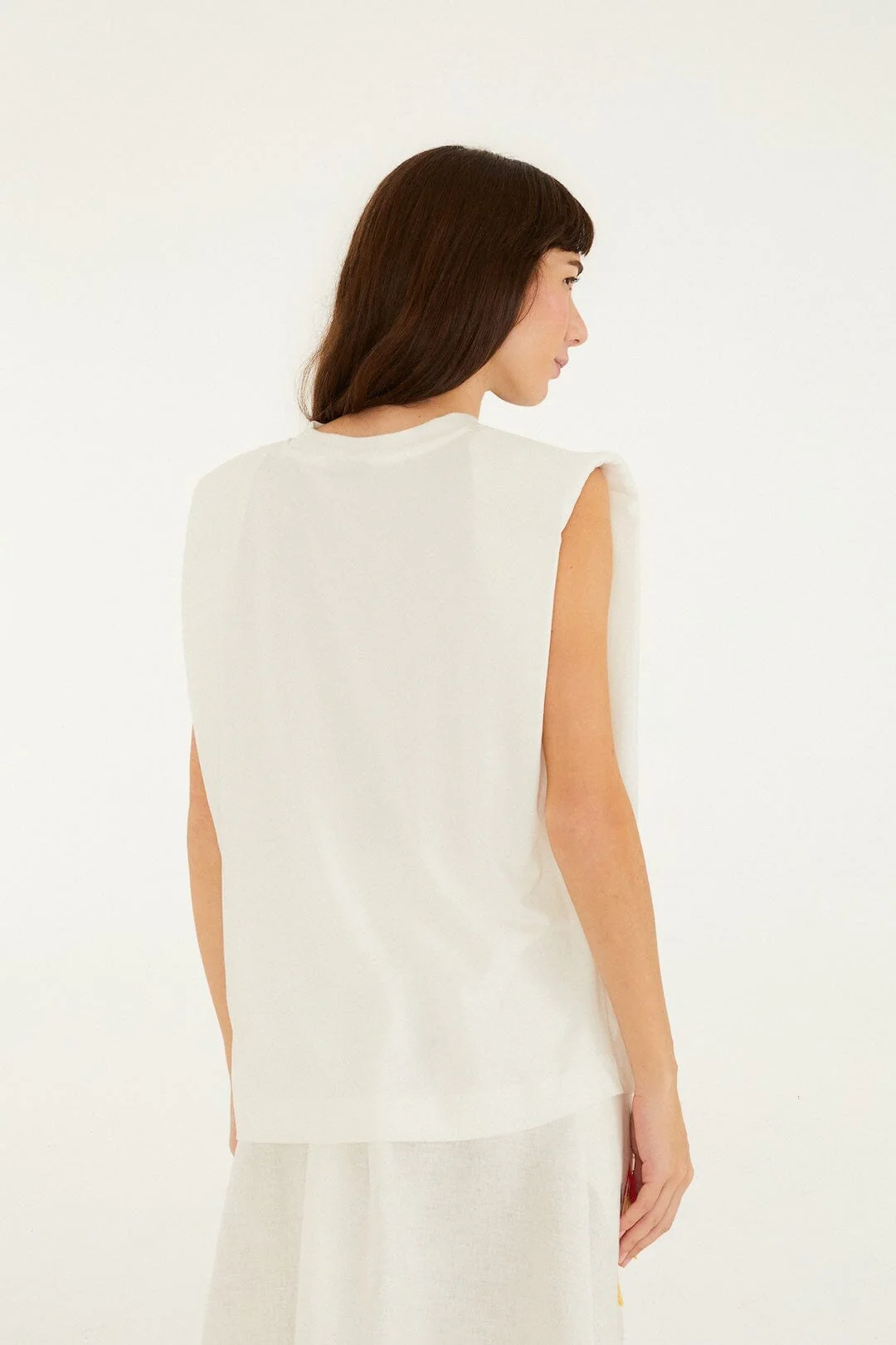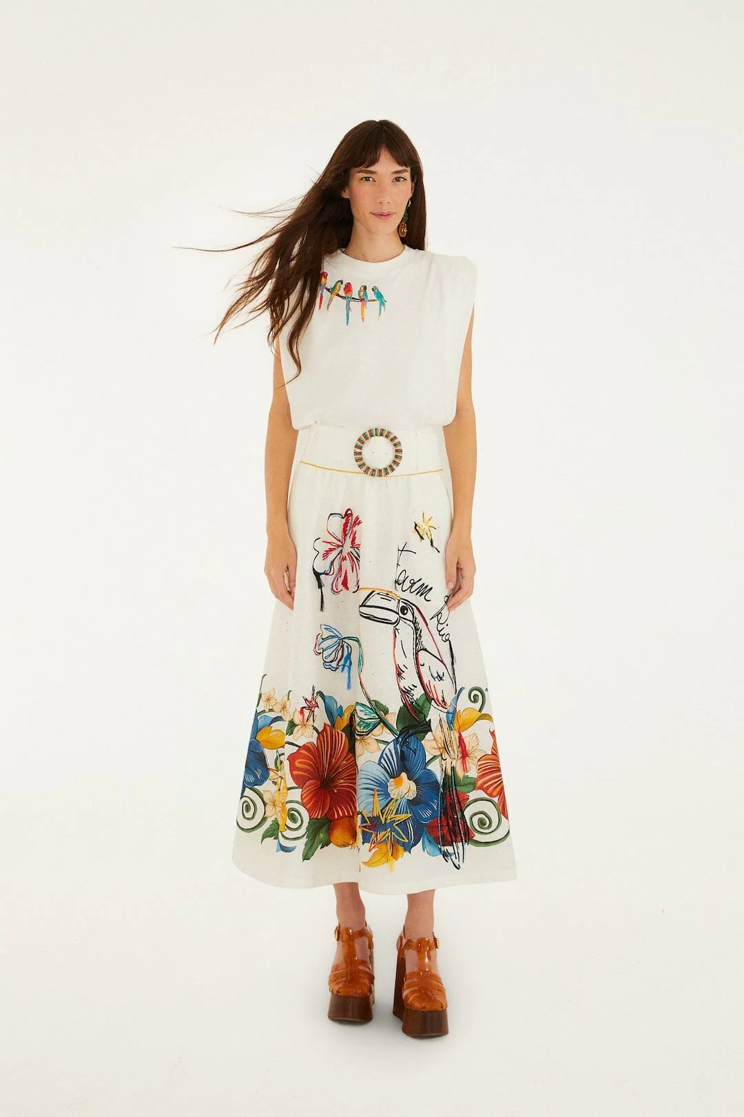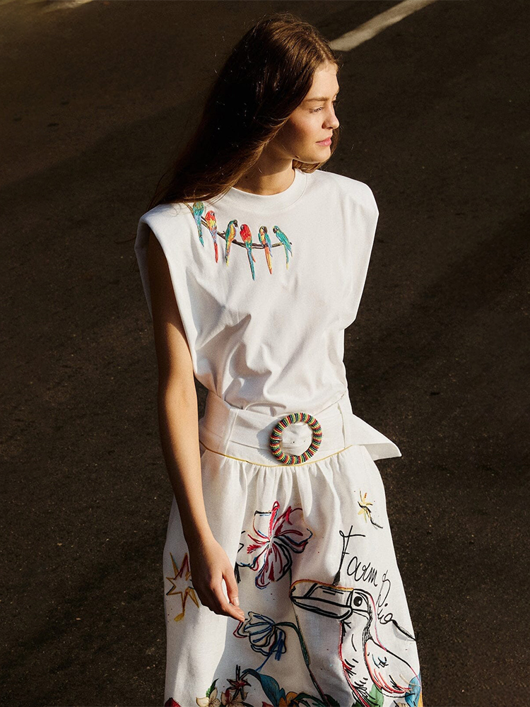 Embrace effortless charm with the Off-White Birds On Branch Embroidered Organic Cotton T-Shirt by FARM Rio. Crafted from 100% GOTS-certified organic cotton, this top features a soft off-white canvas adorned with delicate, colorful bird embroidery resting on delicate branches. The relaxed silhouette and classic round neckline create a comfortable, breathable fit, while the handmade embroidery adds a playful touch of nature-inspired artistry. A perfect blend of sustainability and joyful design.