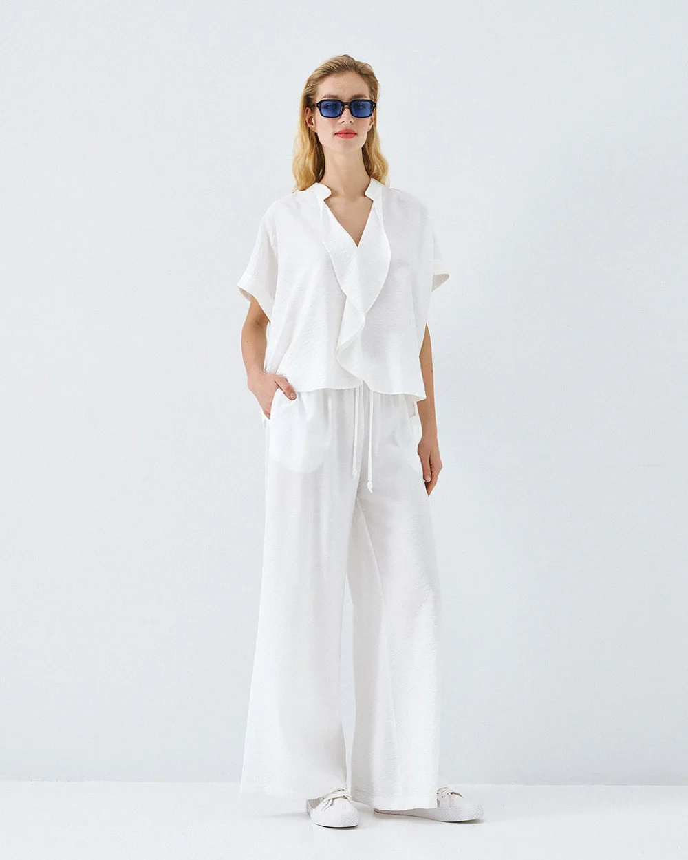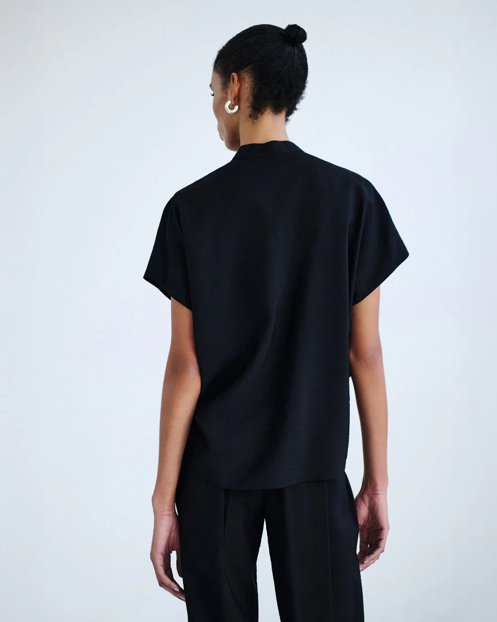 Blouse with short sleeves and a crinkled texture. Features a band collar, a v-neckline and a ruffled front detail.