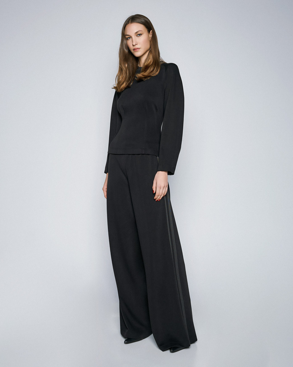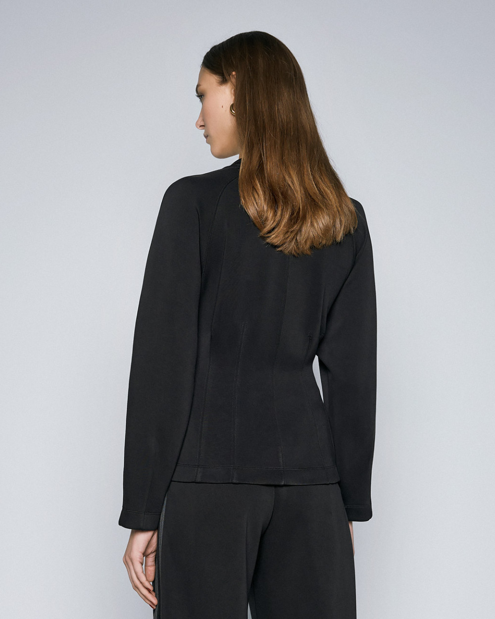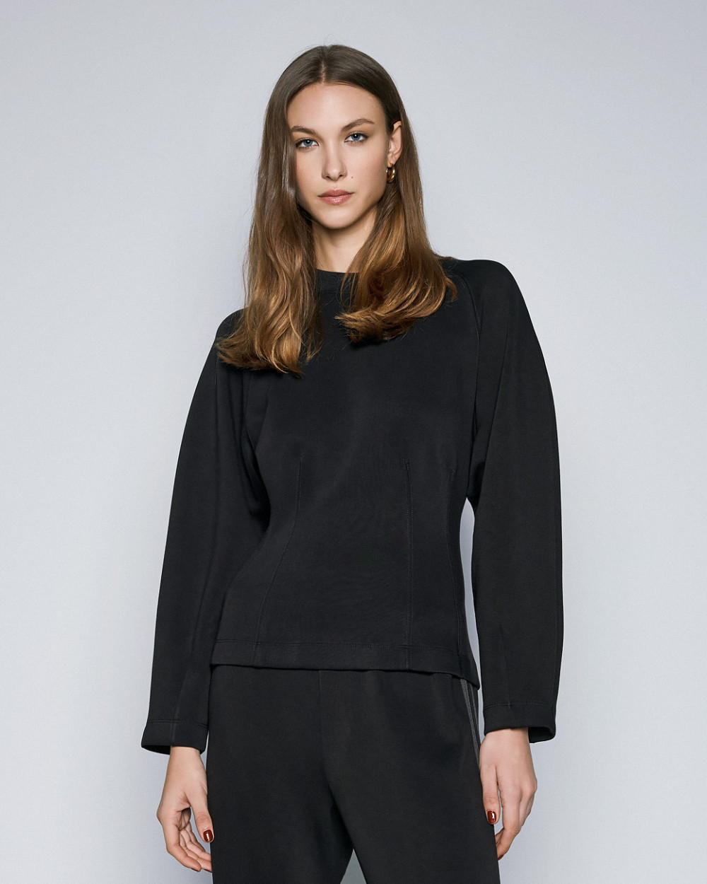 Long-sleeved blouse with round ribbed neckline and decorative seams. Pair it with the matching pants from our collection for stylish and comfortable looks.