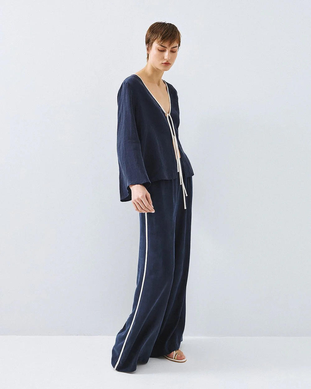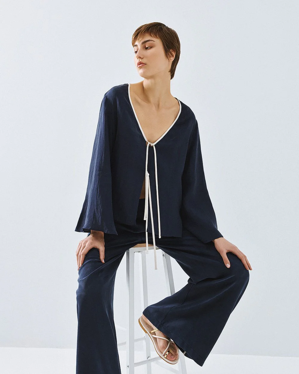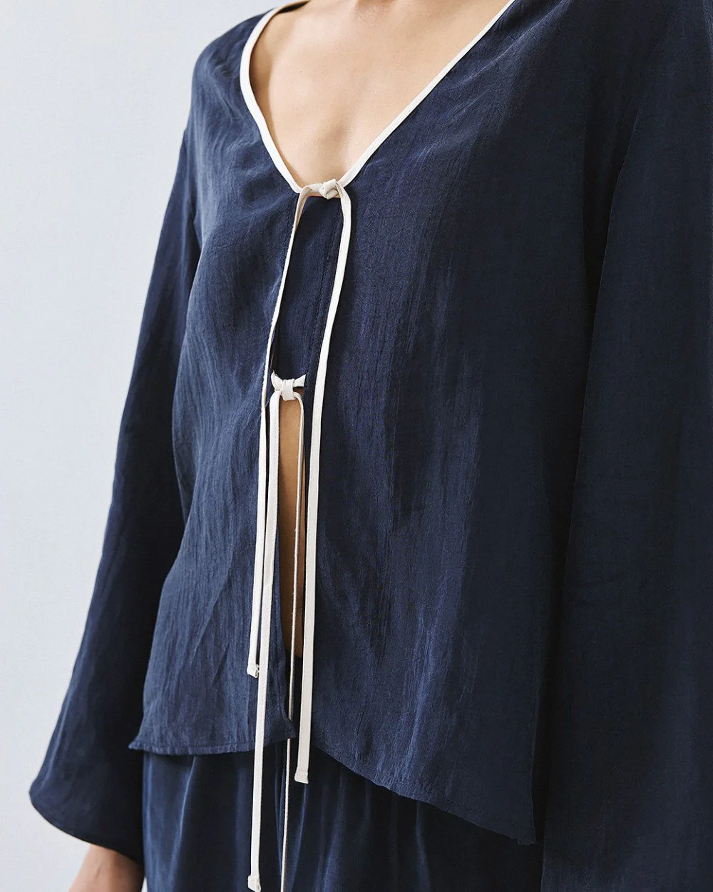Blouse with long wide sleeves and a v-neckline. Features side slits, trim detailing and a front tie fastening.