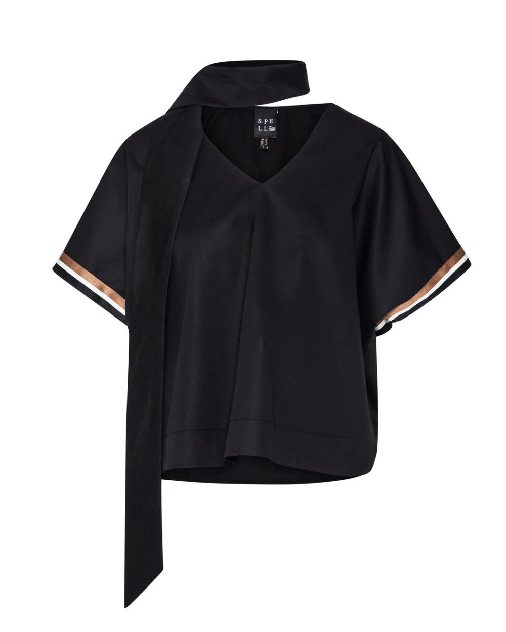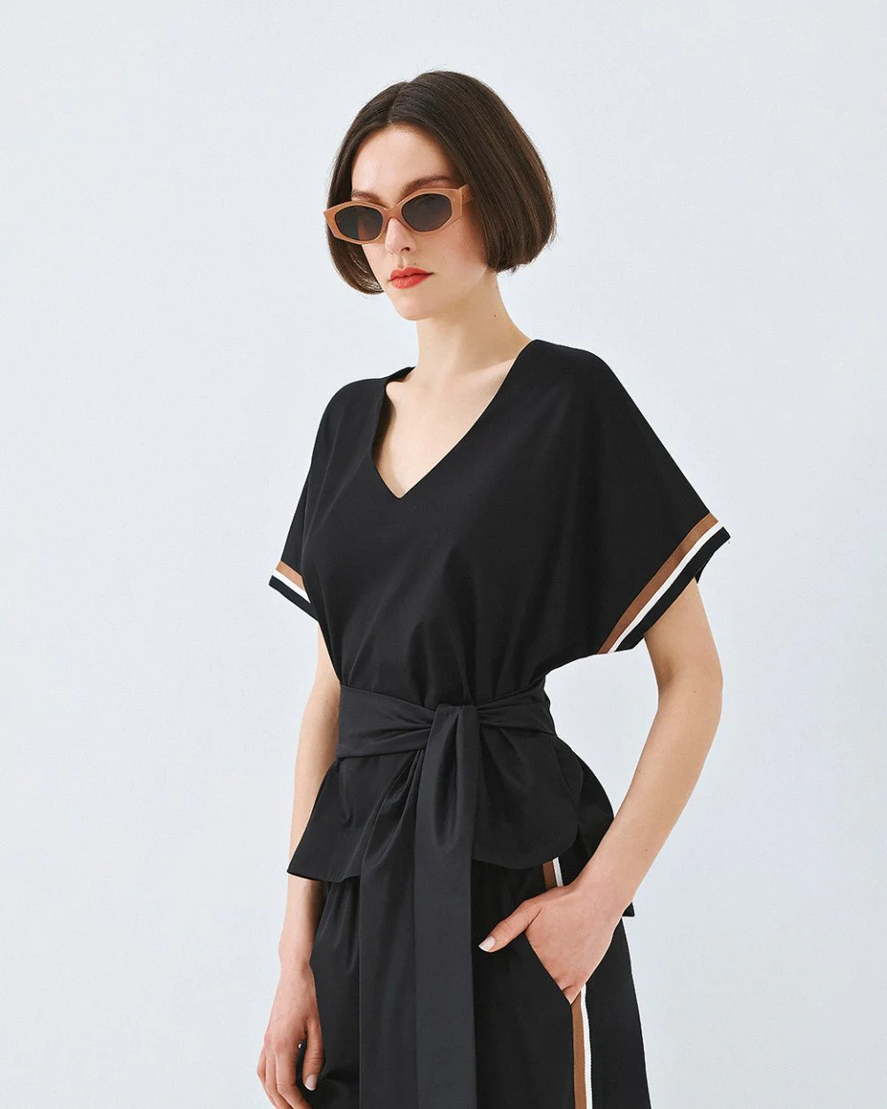 Cotton blouse with a v-neckline, short sleeves with striped detail at the hem and a removable tie belt.