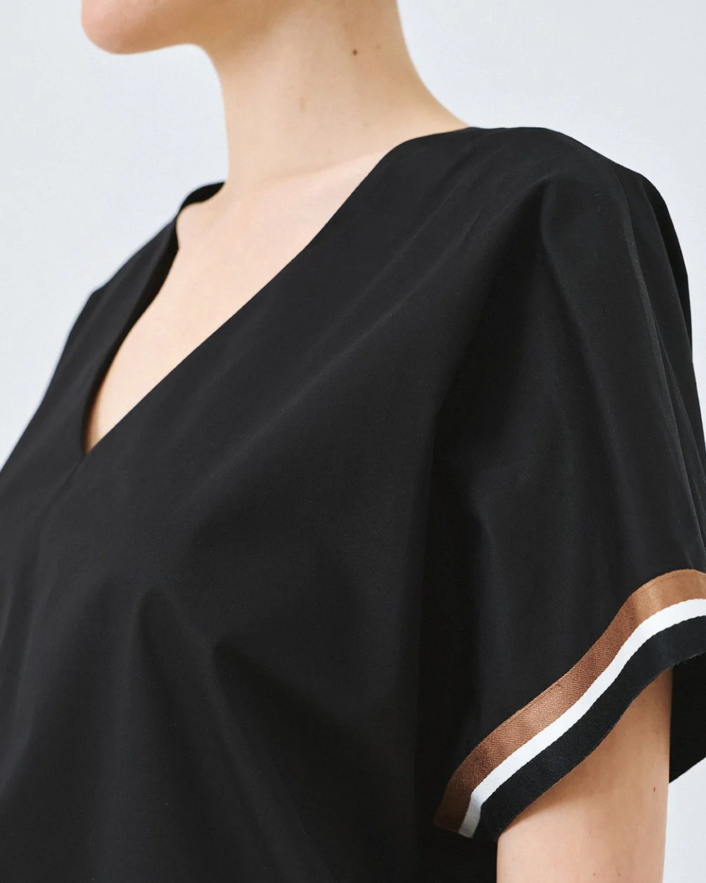 – Short sleeves with striped bands at the hem