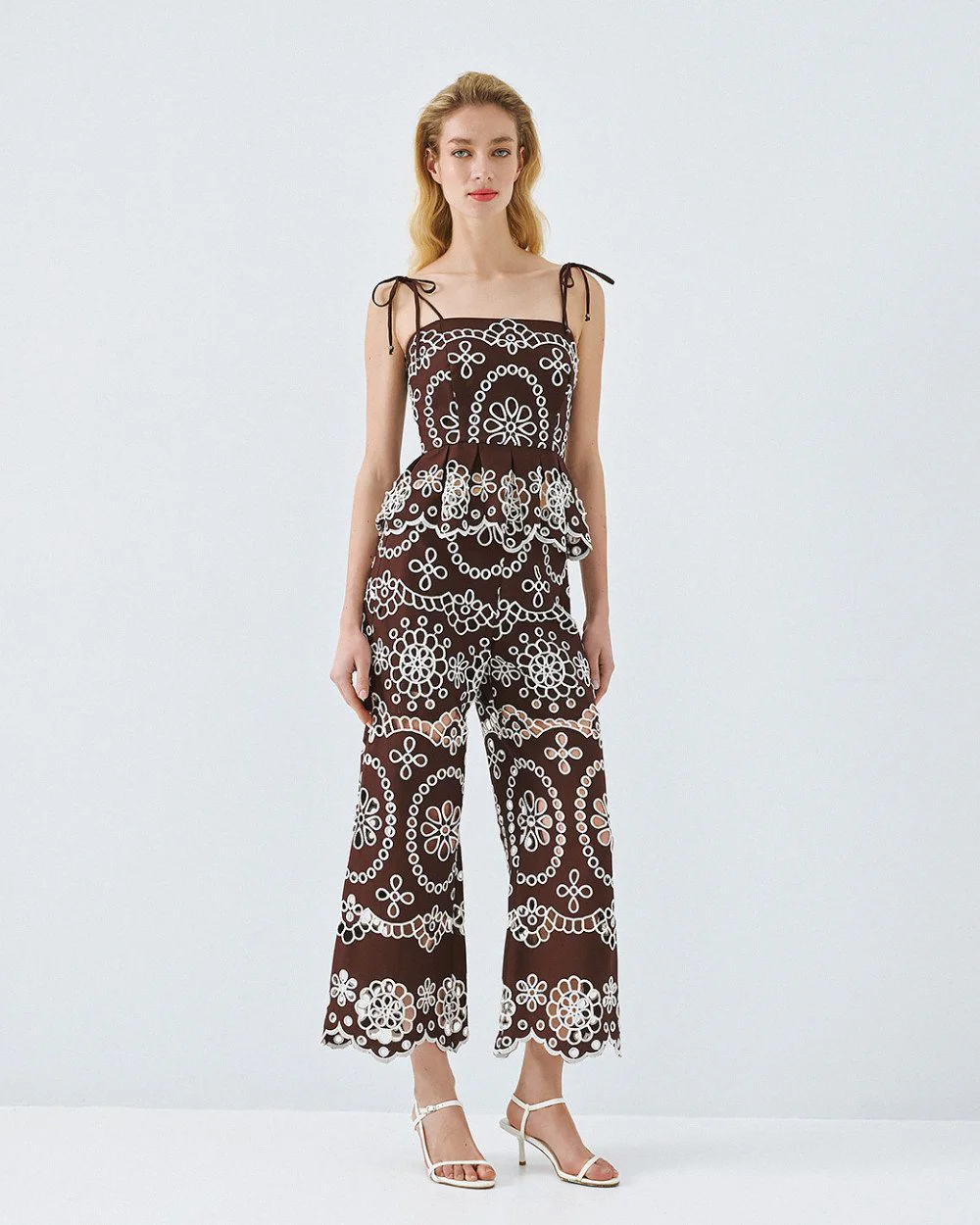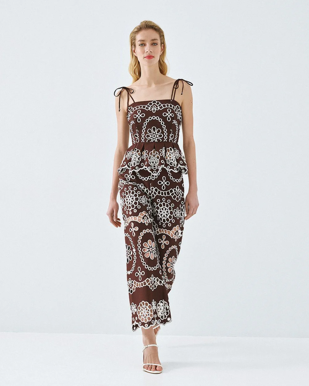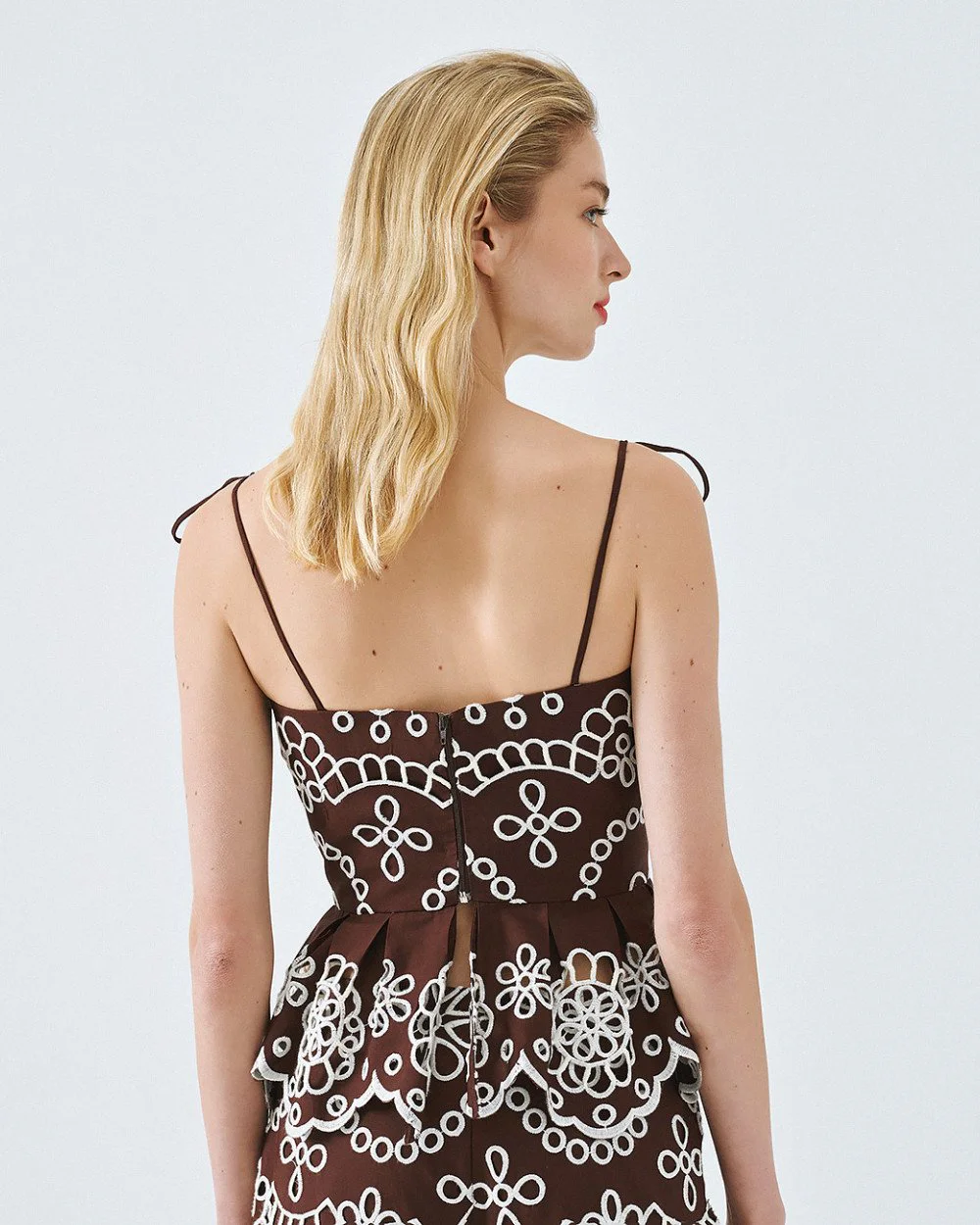 Short broderie top with thin tie straps. Features ruffle detailing at the hem and a back zip closure.