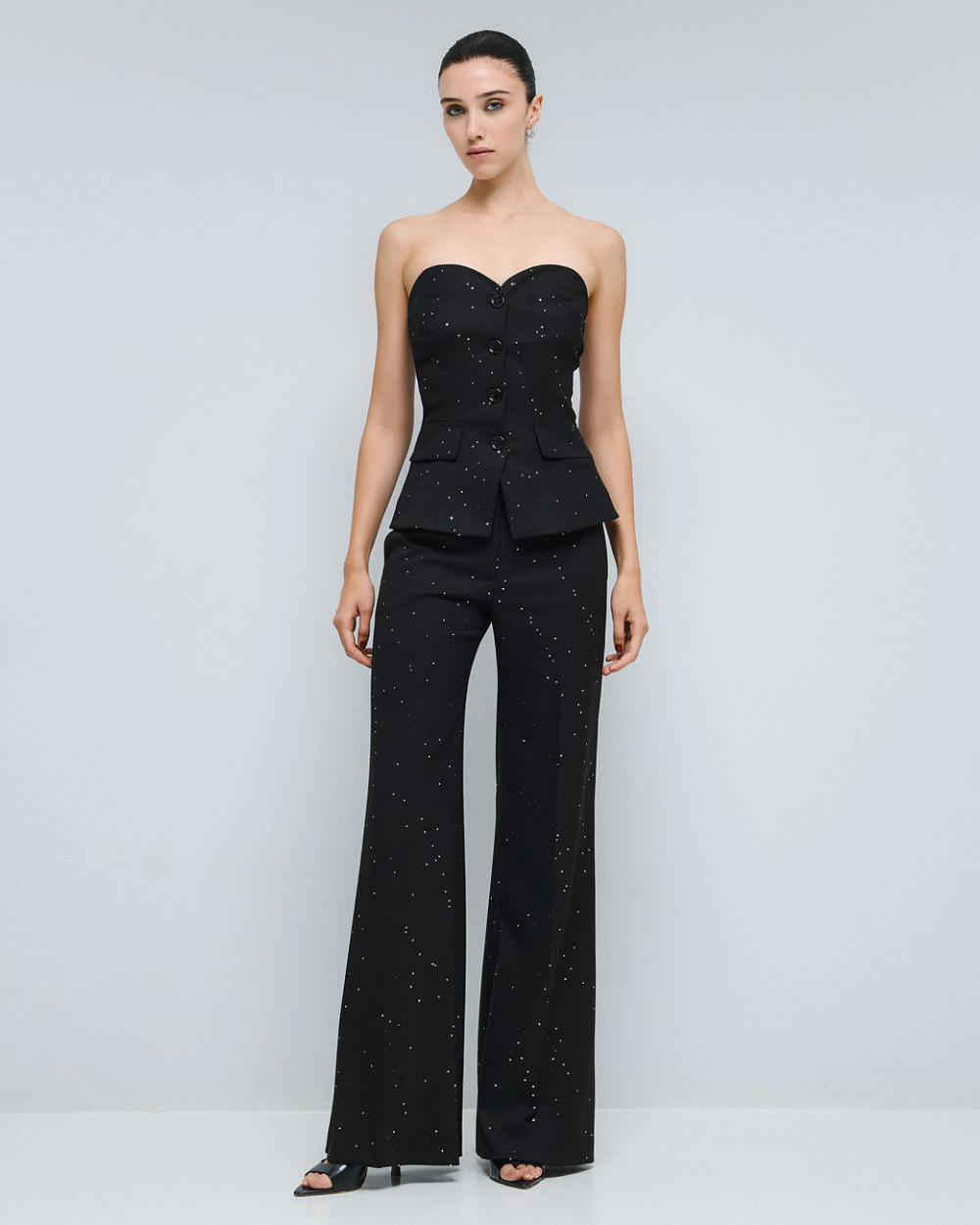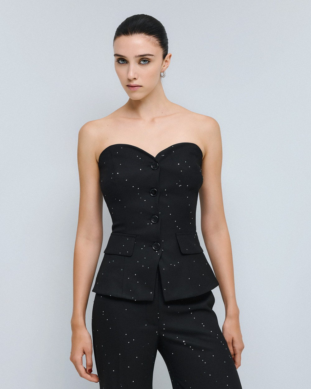 Strapless tailored bustier with sequin details and front button closure. It features decorative flap pockets and an elastic at the upper back. Pair it with the matching pants from our collection for glamorous formal looks.