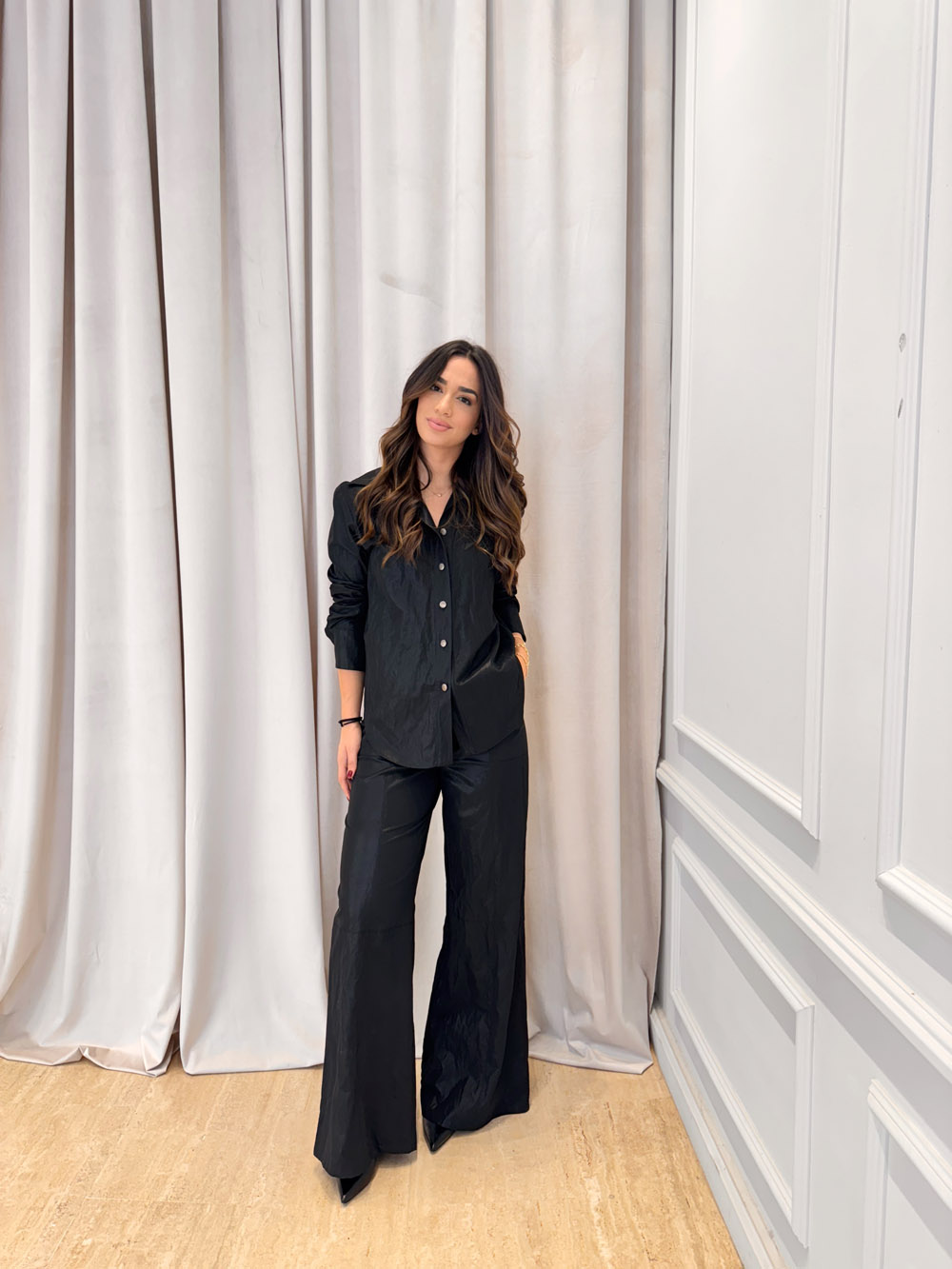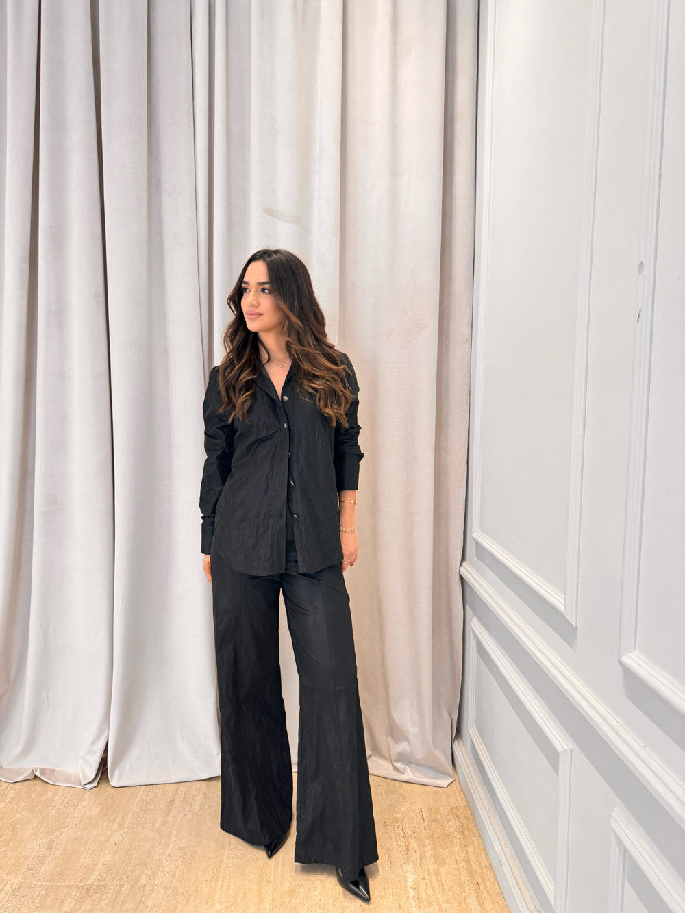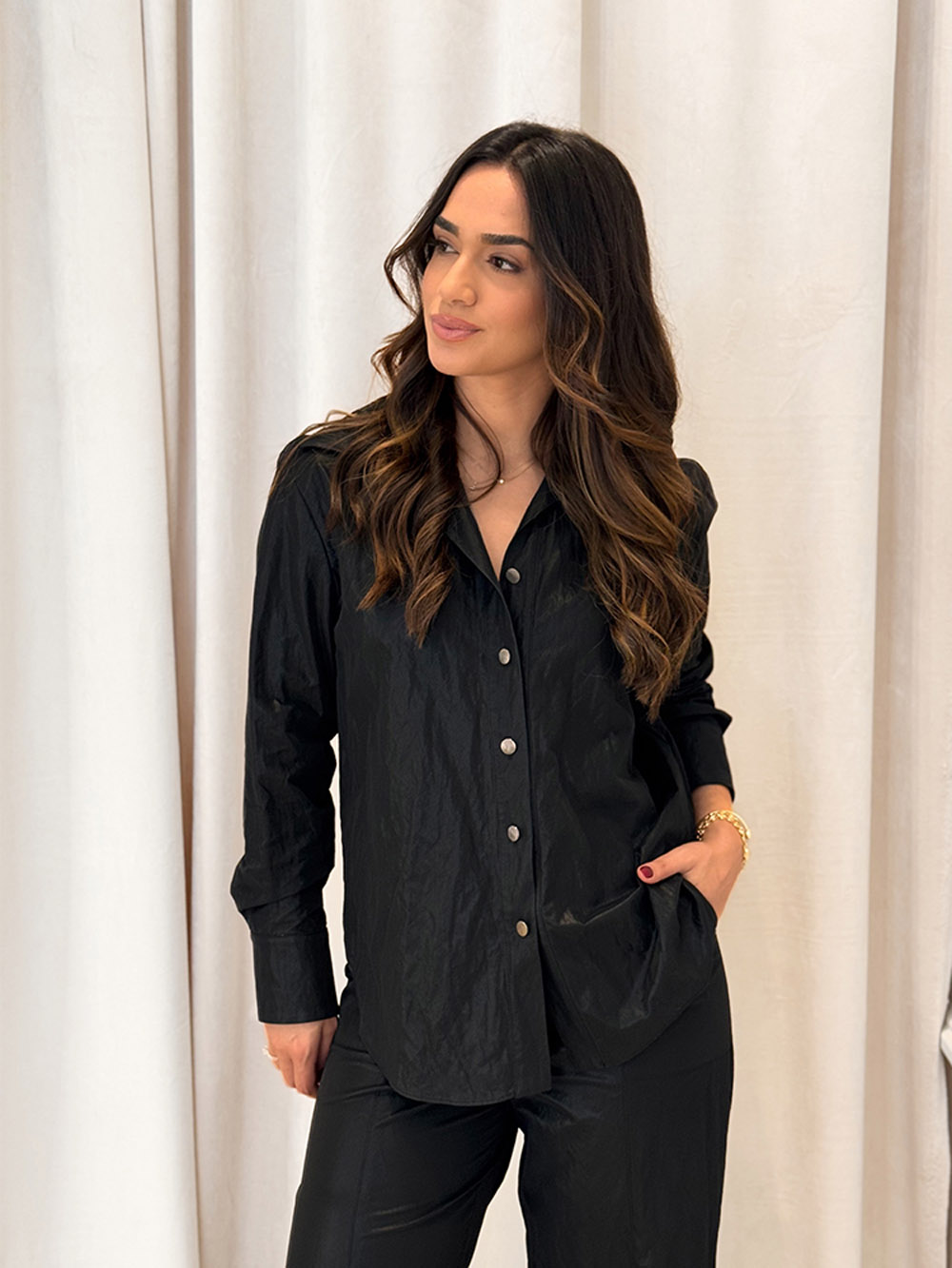 Black relaxed fit button-up textured shirt crafted from a lightweight fabric with a subtle crinkled finish. The shirt features a structured collar, full button-down front, and long sleeves with buttoned cuffs.