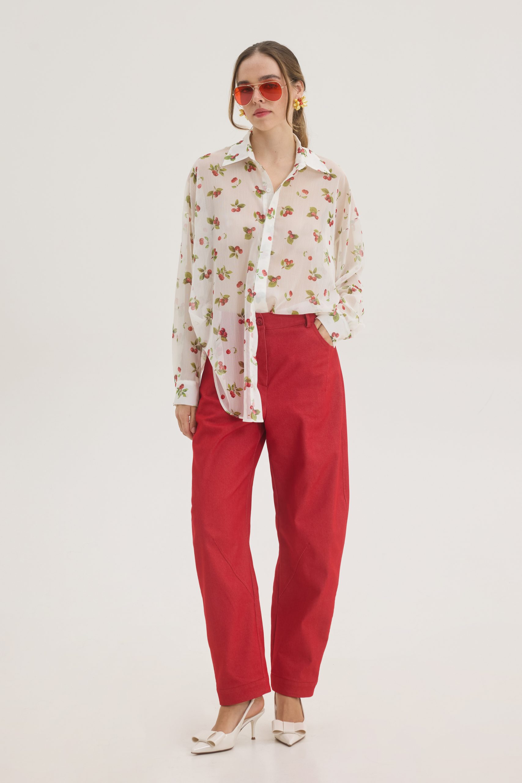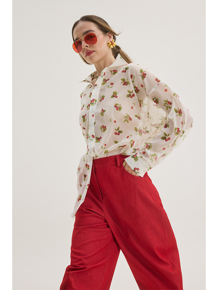 Playful this sheer button-down shirt designed in a lightweight, semi-transparent fabric, it features a delicate white base with a cherry and leaf print. The relaxed silhouette drapes effortlessly, while the classic pointed collar and full button-down front maintain timeless structure. Long sleeves with soft cuffs enhance its fluid movement.