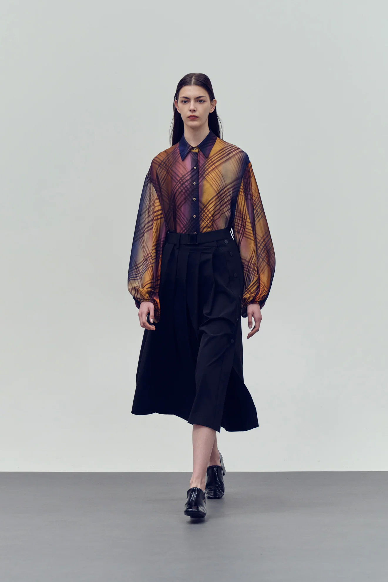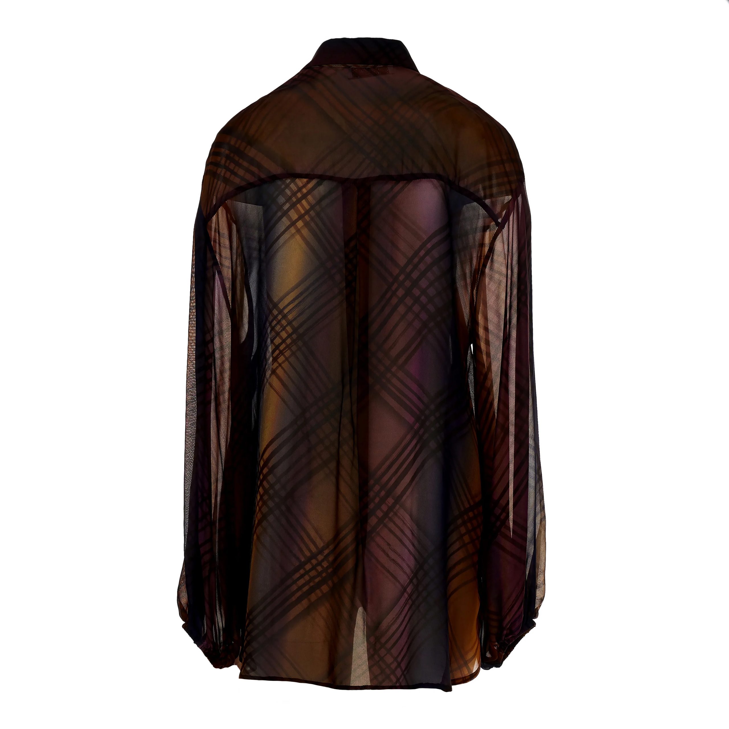 This sheer button-down shirt crafted from lightweight, semi-transparent fabric, it features a striking abstract plaid design in warm autumnal tones of amber, plum, and charcoal. The relaxed fit is balanced with a structured point collar and classic button placket, while voluminous long sleeves with gathered cuffs add effortless elegance.