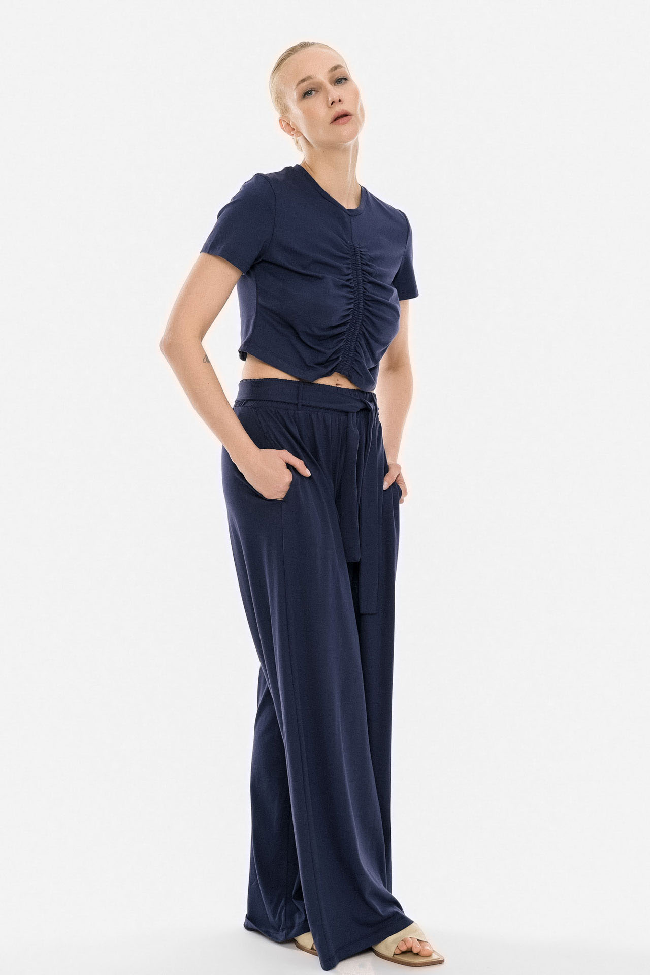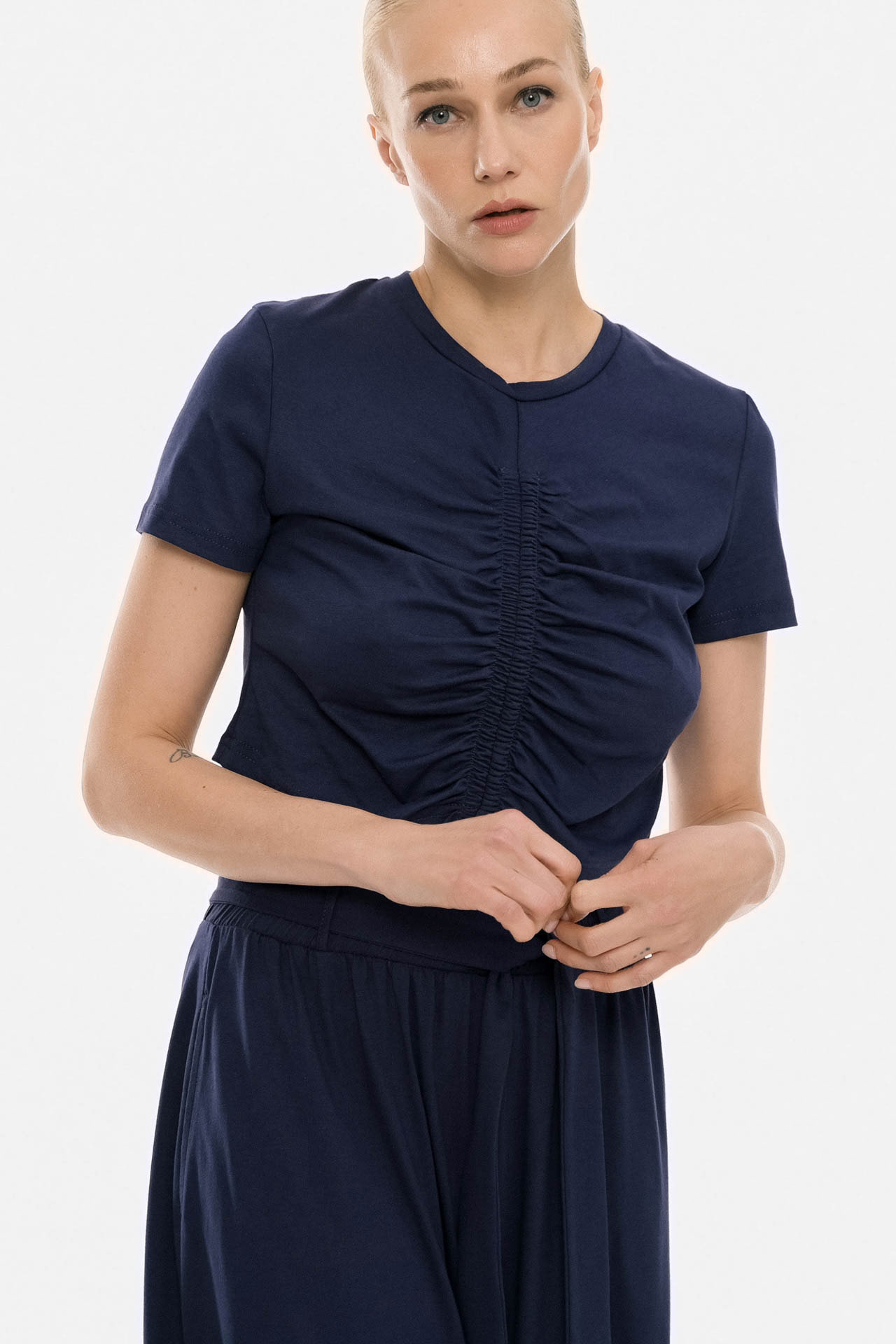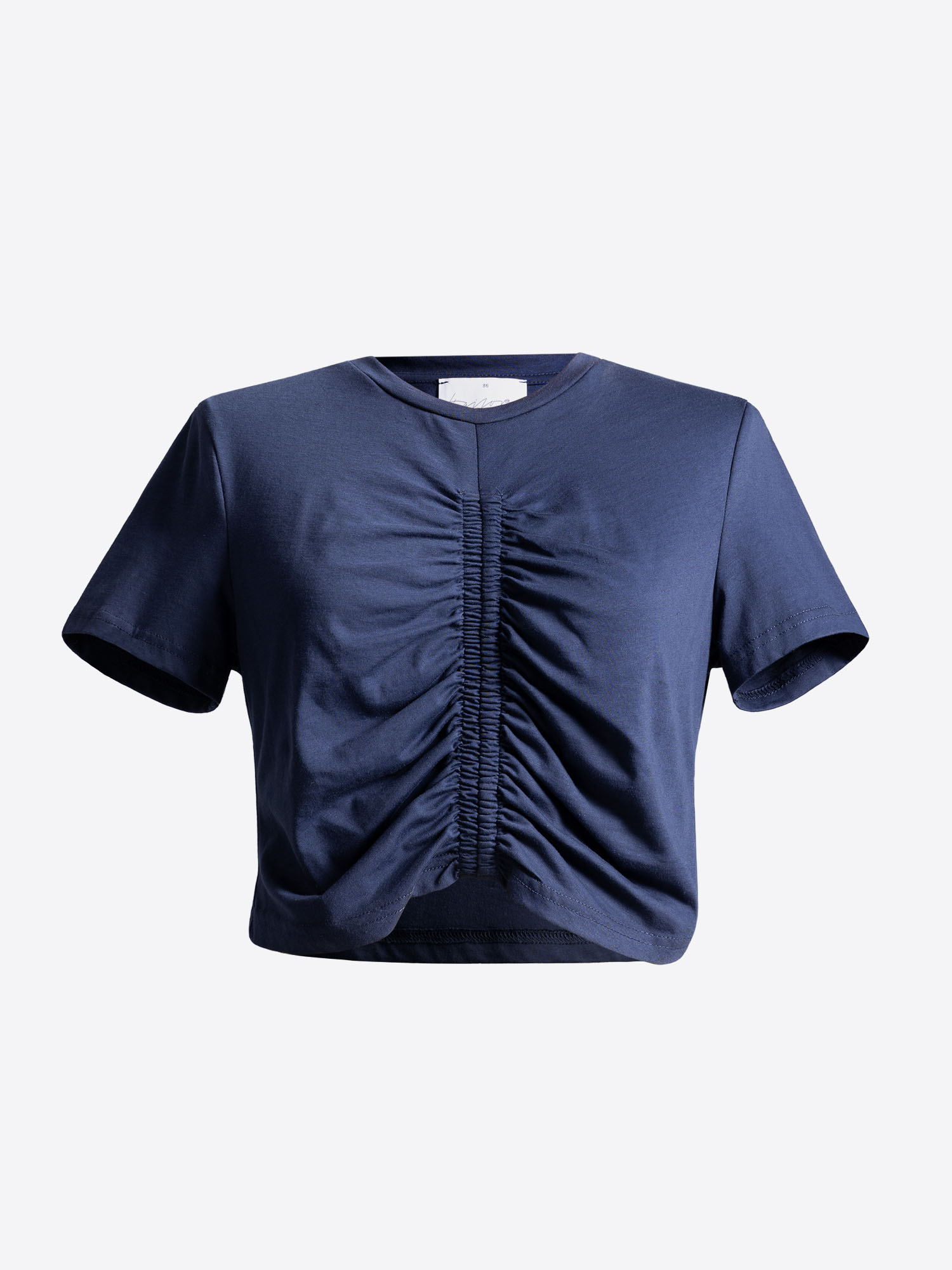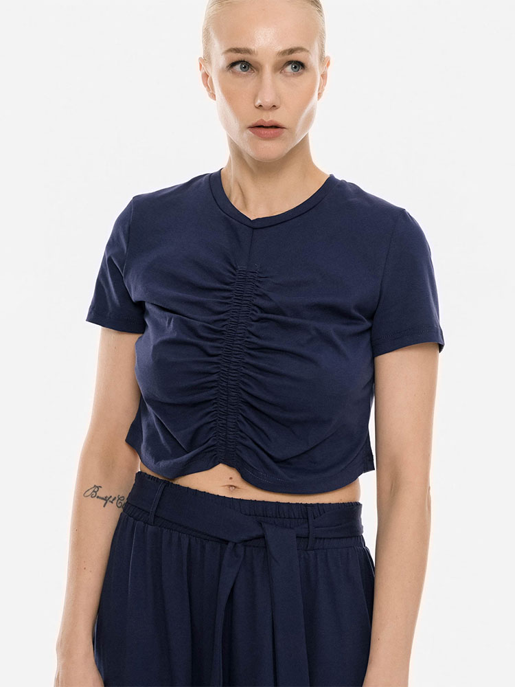 This cropped top crafted from soft, stretchable fabric, it offers a comfortable fit. The standout feature is the ruched detailing at the front, designed with a classic round neckline and short sleeves.