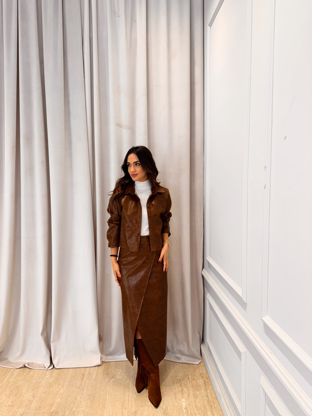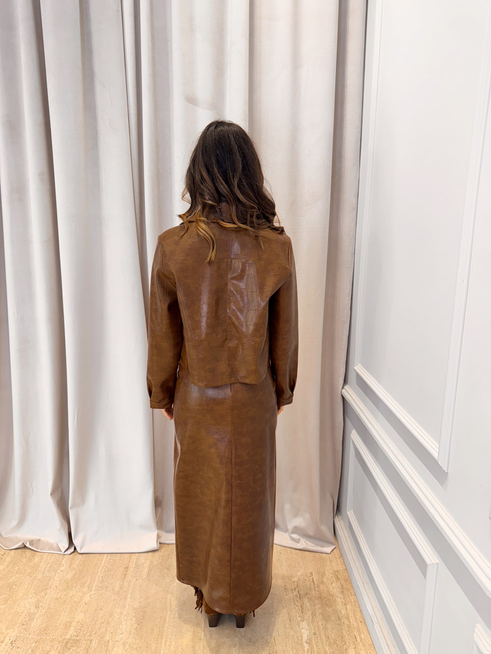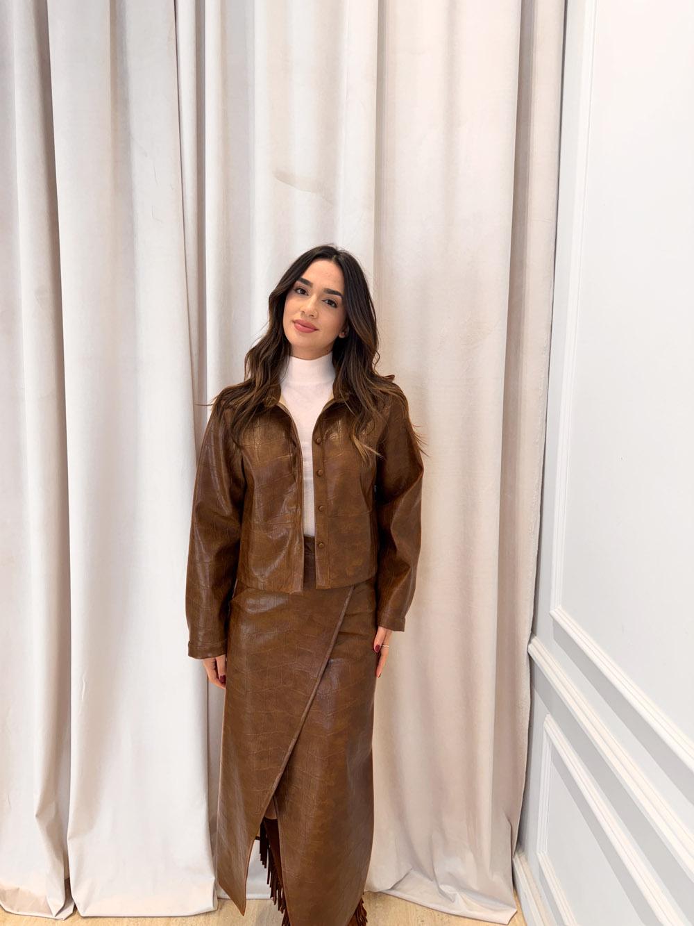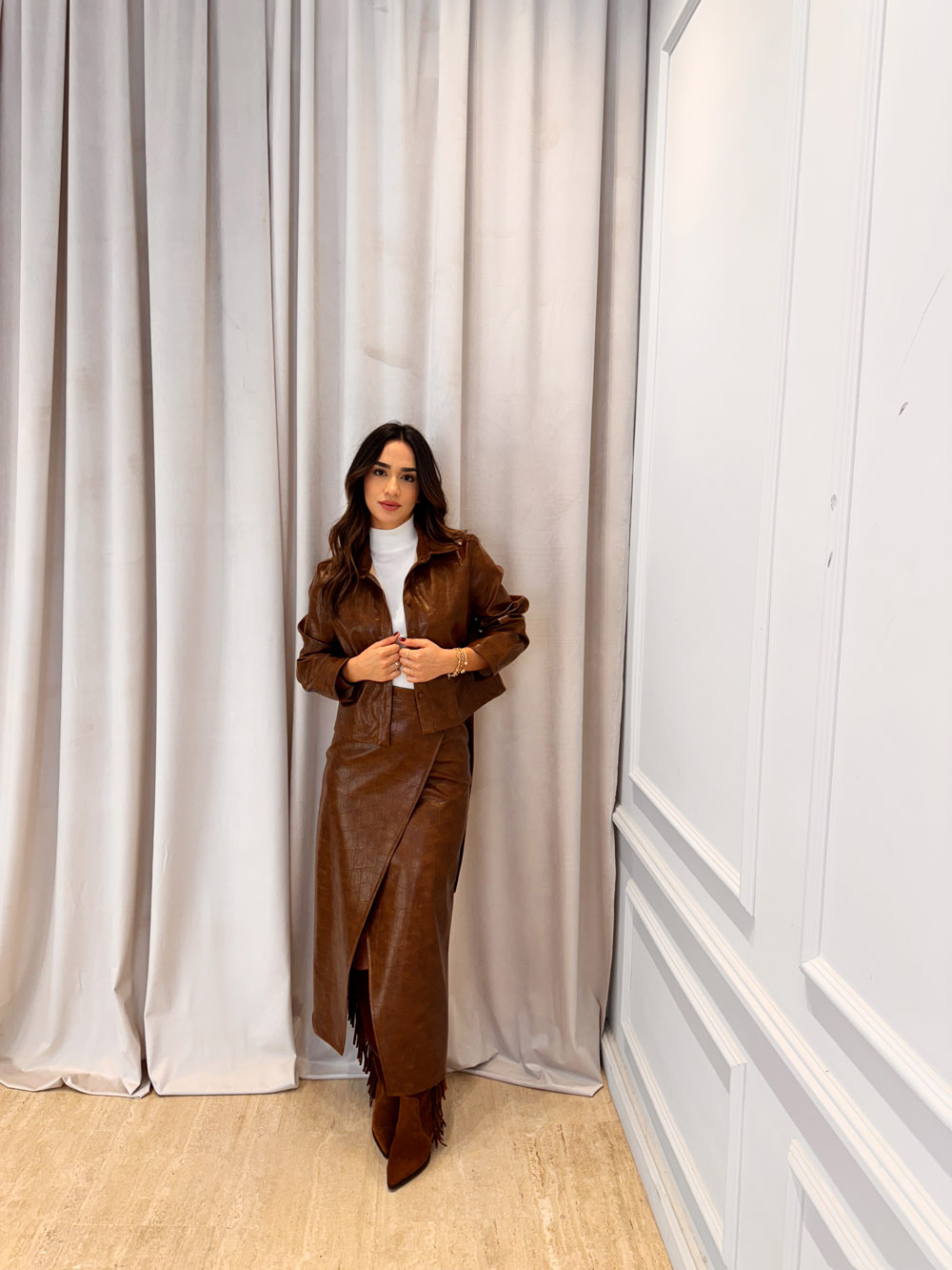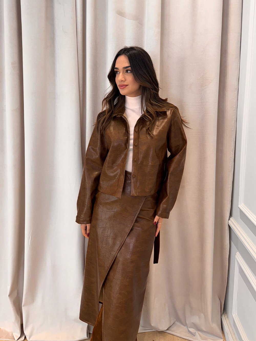 Croco eco-leather boxy shirt designed in relaxed silhouette, the crocodile-textured finish adds depth and dimension, while the boxy cut provides effortless style whether worn as a shirt or lightweight jacket. A clean front button closure and soft drape enhance its versatility.