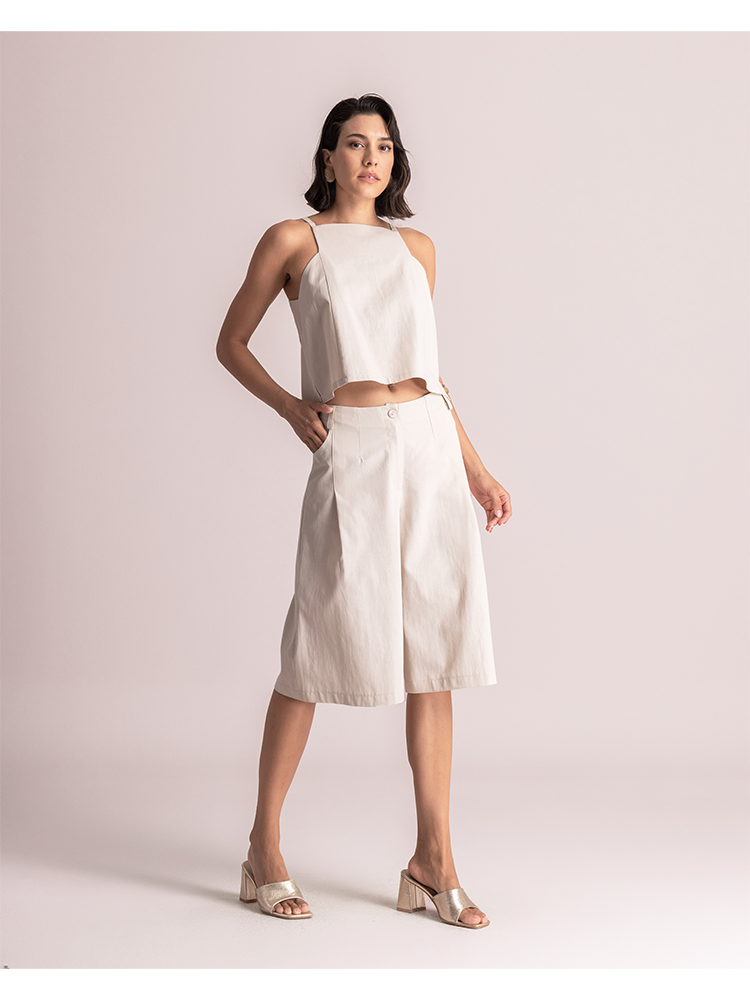 This modern sleeveless blouse is designed in a cropped silhouette. The minimalist front is complemented by a subtle open-back feel with delicate button detailing.