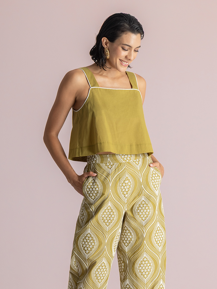 This cropped top is crafted from a breathable fabric. Featuring a structured square neckline highlighted by subtle contrast piping, it is supported by slim shoulder straps. The relaxed, slightly flared shape and cropped length create an airy feel.