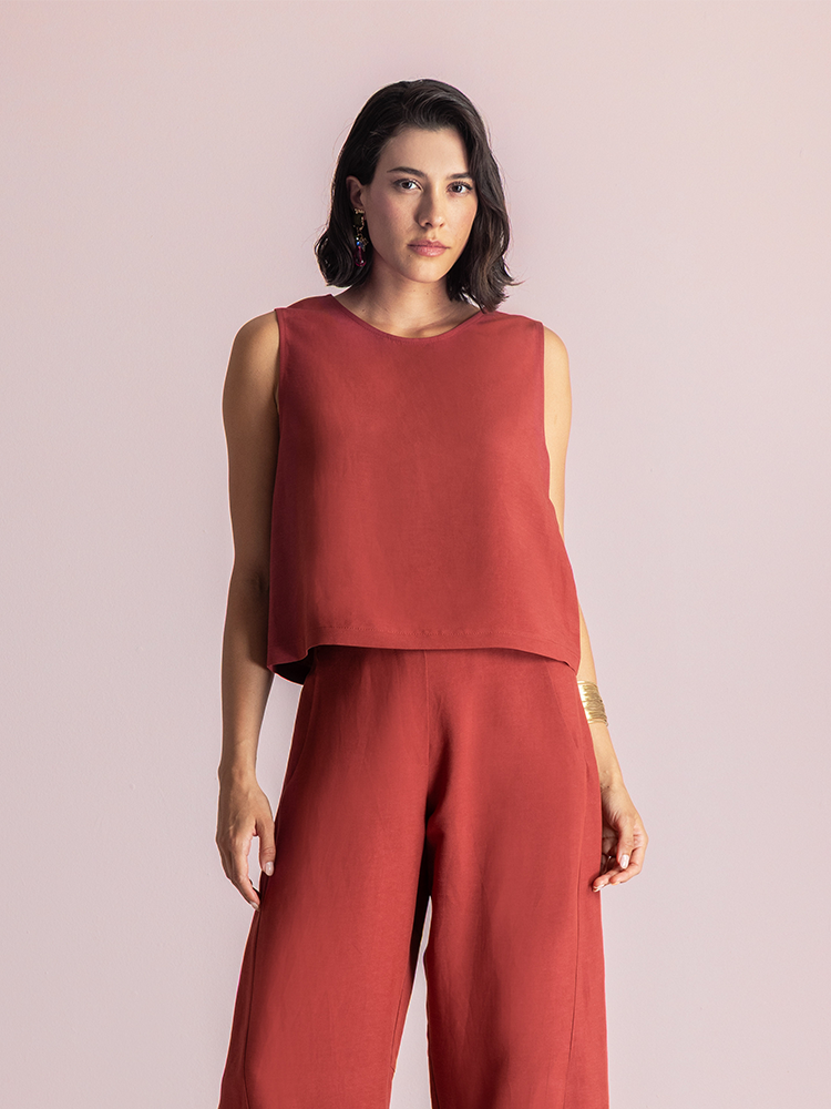 Sleeveless cropped top crafted from a lightweight, smooth fabric. Featuring a sleeveless cut and a clean round neckline, the cropped length making it ideal for pairing with high-waisted trousers. At the back, a subtle v-shaped detail.