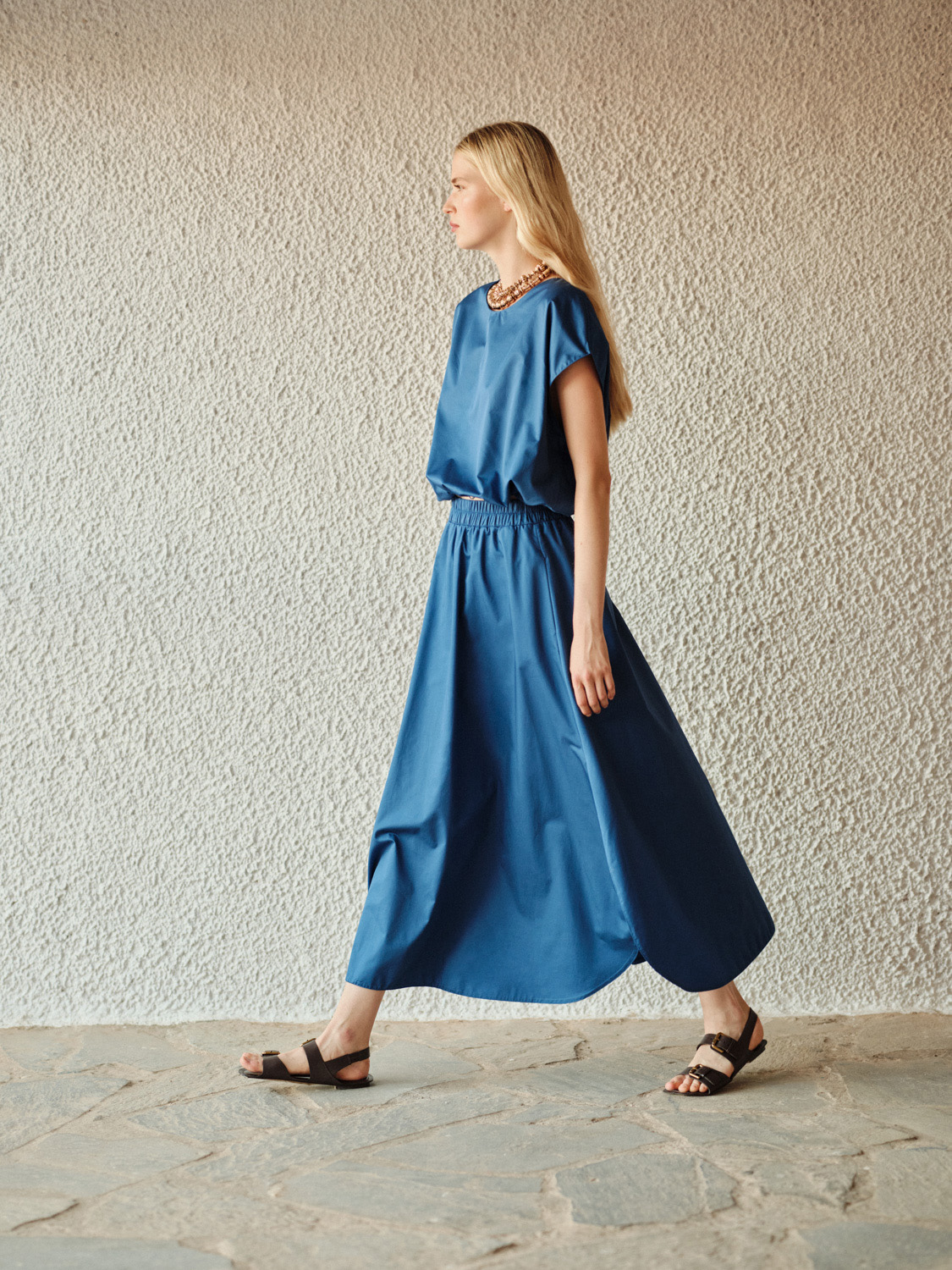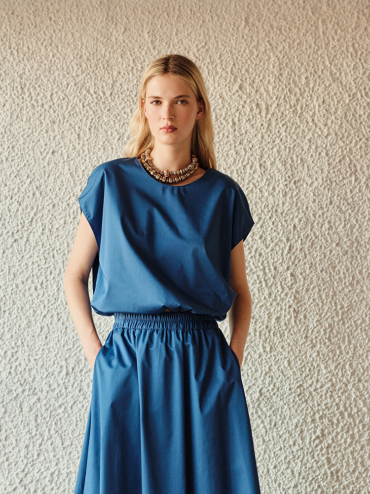 This blouse featuring a relaxed, oversized silhouette with softly structured shoulders. The elasticated hem creates a subtle blouson effect, adding shape. Finished with a clean round neckline and a delicate back keyhole closure.