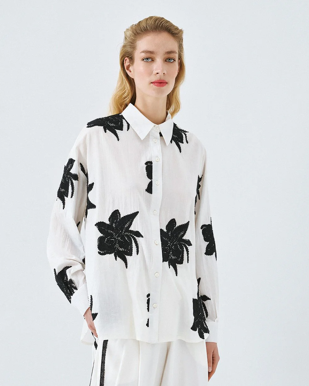 Shirt with a collar and embroidered details with beads. Features a rounded hem and front and cuff button closure.
