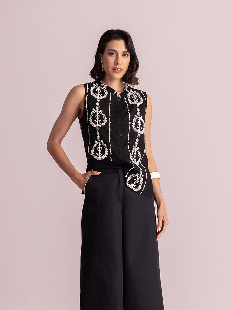 This sleeveless shirt is crafted from a lightweight, breathable fabric and features intricate white embroidery. Designed with a structured silhouette, it includes a classic stand collar and a full button-down front.