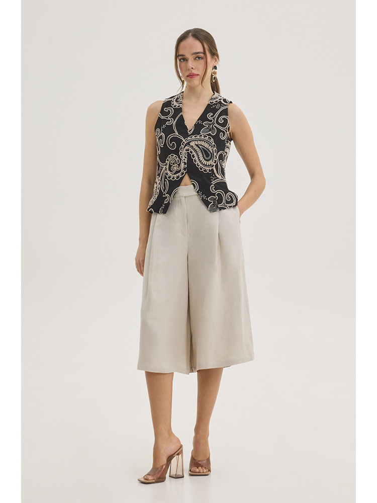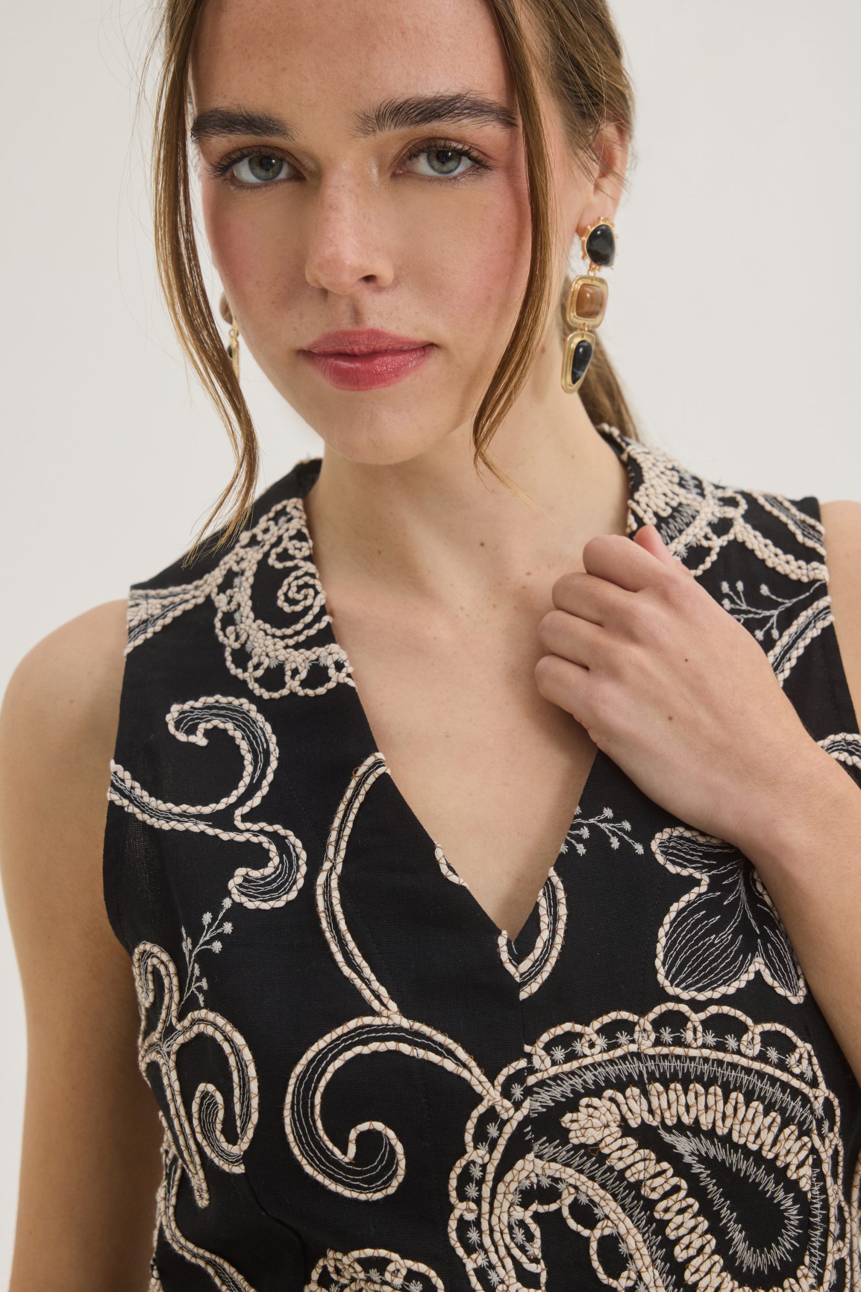 This sleeveless blouse designed in a rich black base, it features an all-over cream ornamental embroidery pattern. The soft v-neckline enhances the neckline while the tailored bodice gently contours the waist before flaring into a refined peplum hem. Crafted from a structured yet breathable fabric.