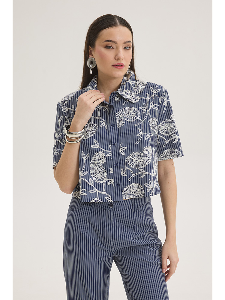 Cropped shirt from Innocent, featuring short sleeves, striped pattern and embroidered design.