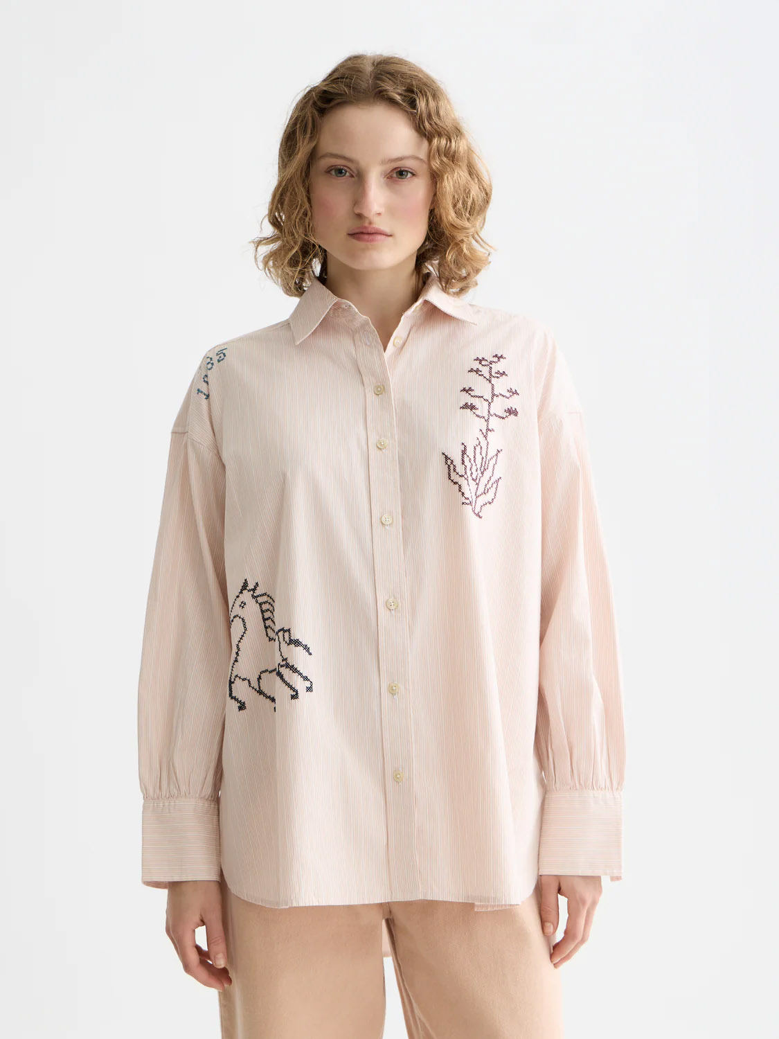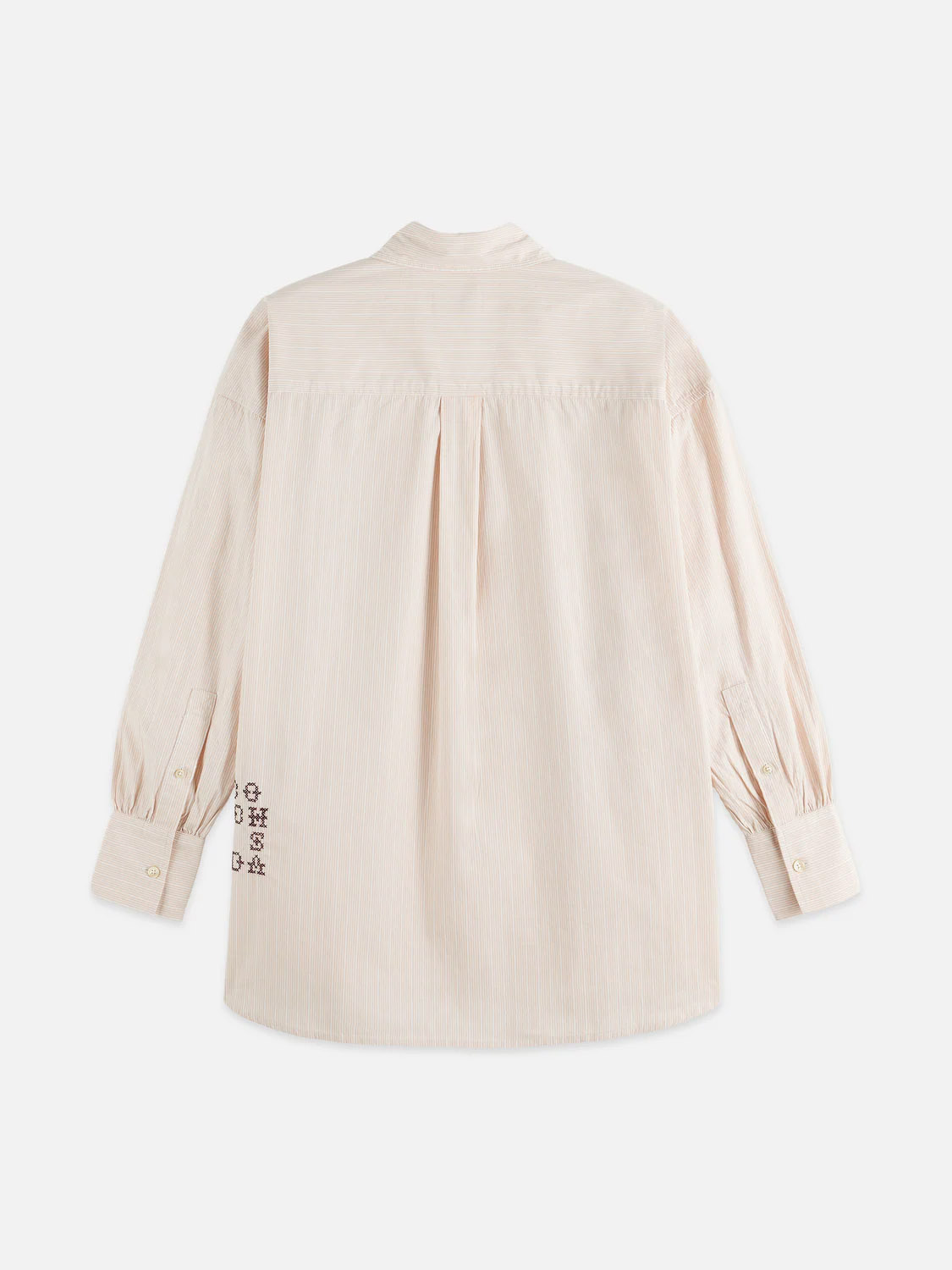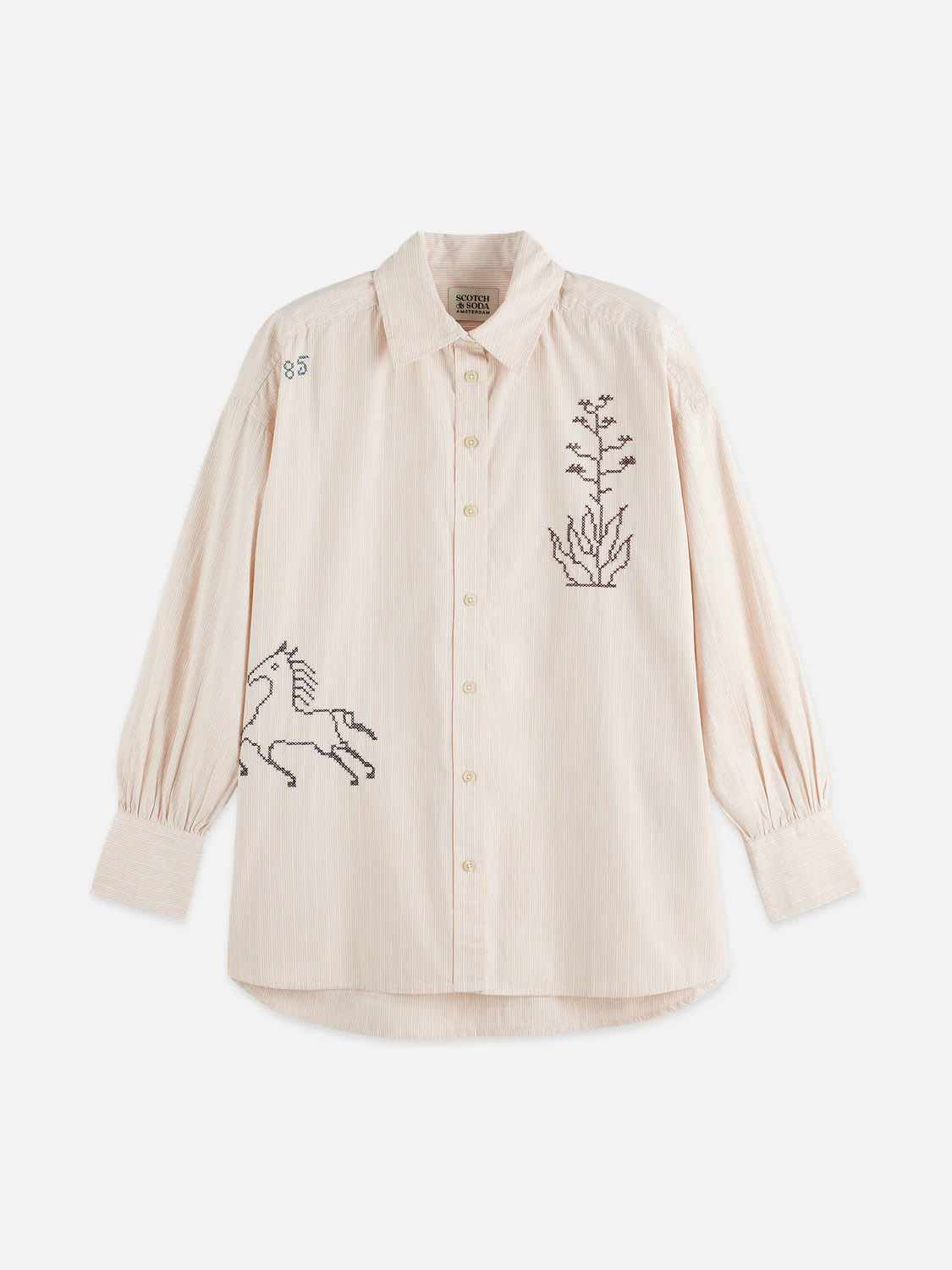 An effortless, oversized shirt from Scotch & Soda with striking embroidered artwork details and subtle balloon sleeves.