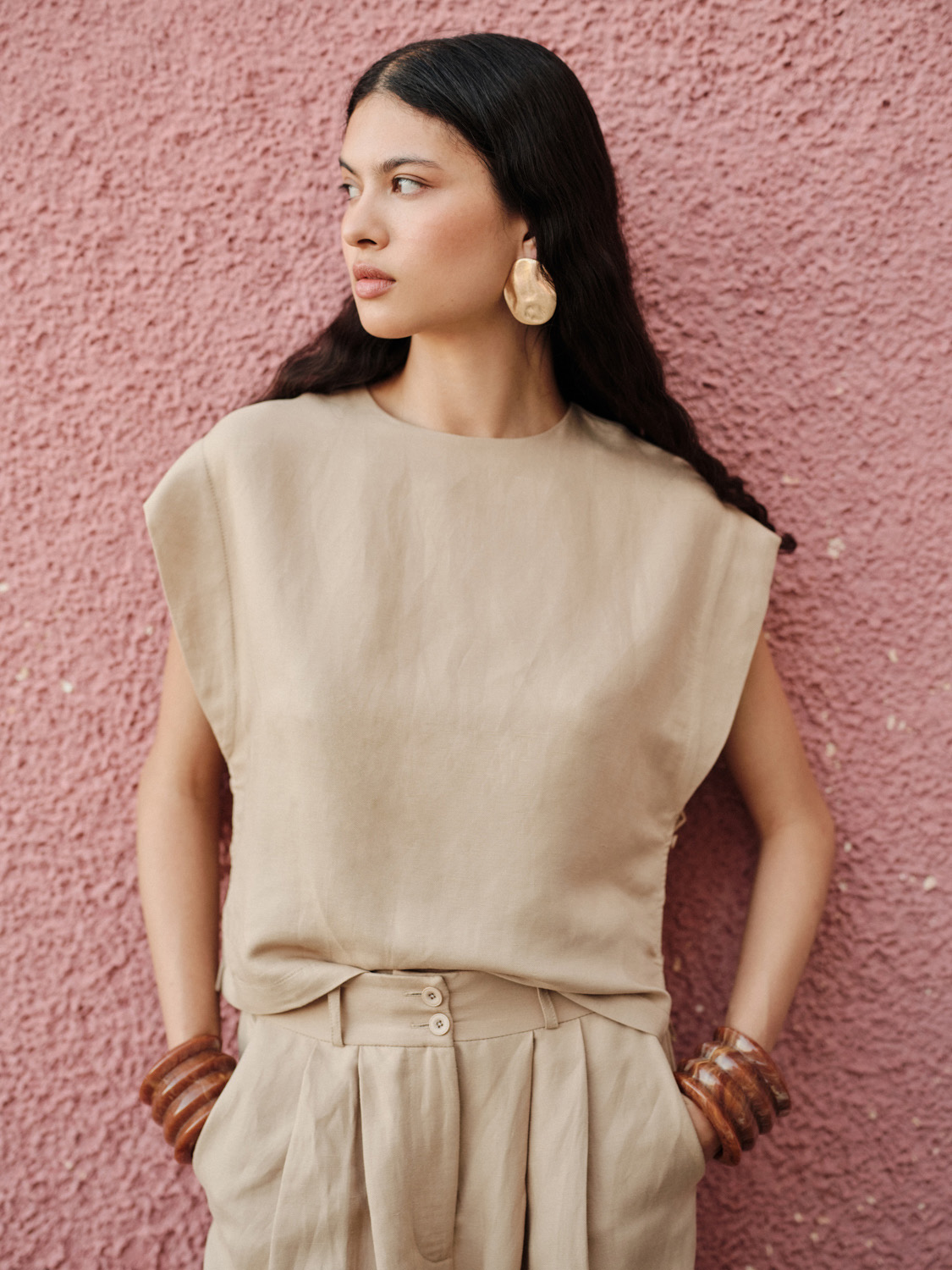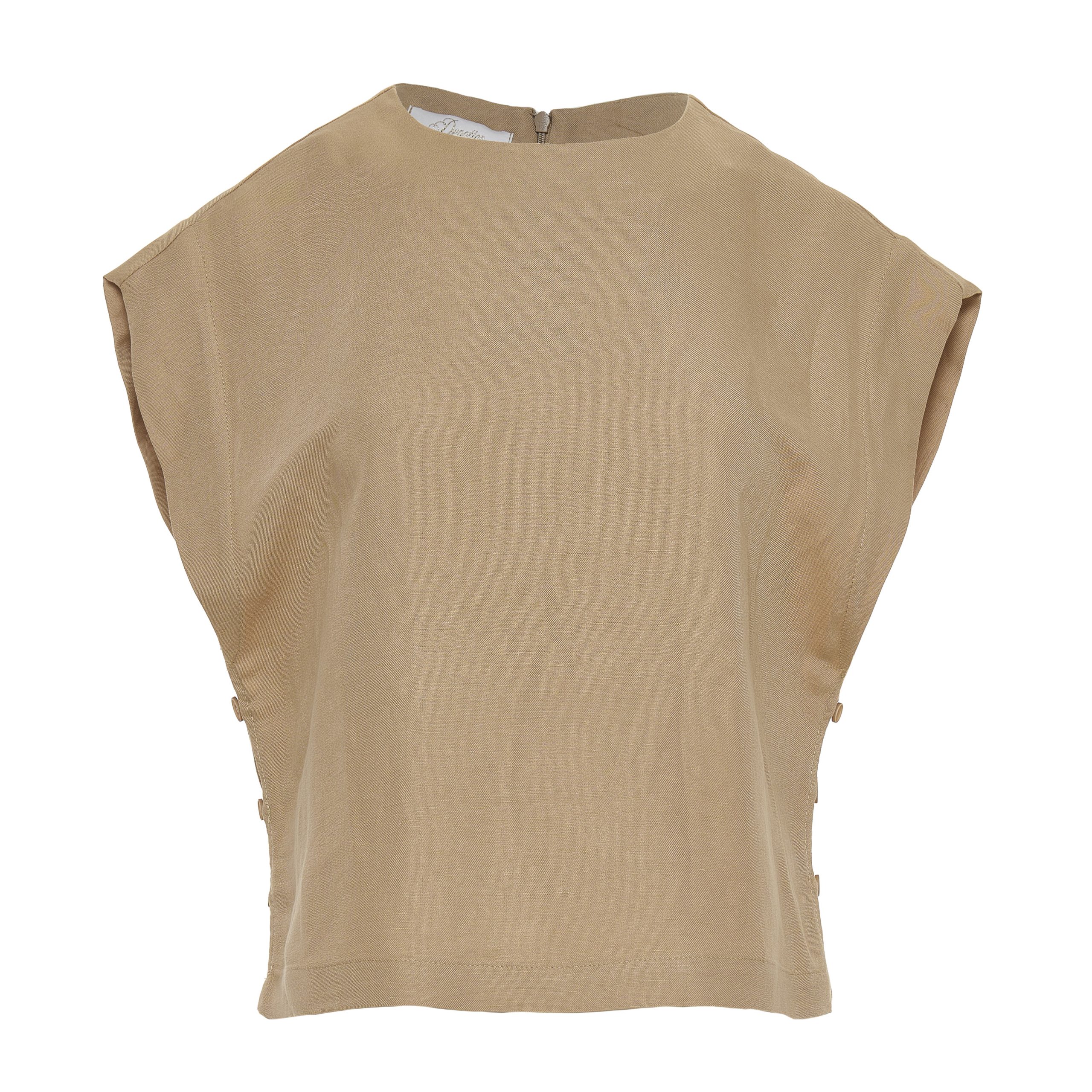 This blouse designed in a warm beige tone, it features a round neckline and wide, cap-style sleeves that create a softly sculpted shape. The lightweight fabric provides a smooth feel, while subtle side button details add a refined, contemporary touch.