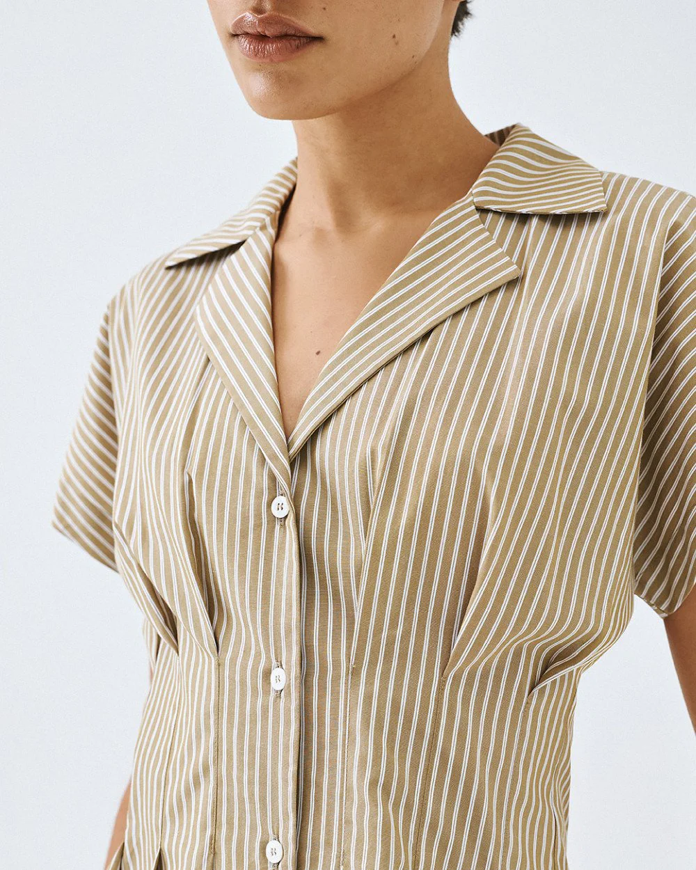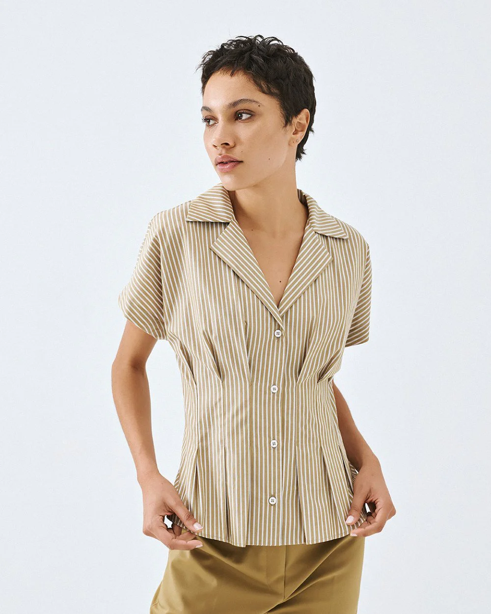 Striped fitted shirt with a lapel collar and short sleeves. Features pleated details and button fastening at the front.