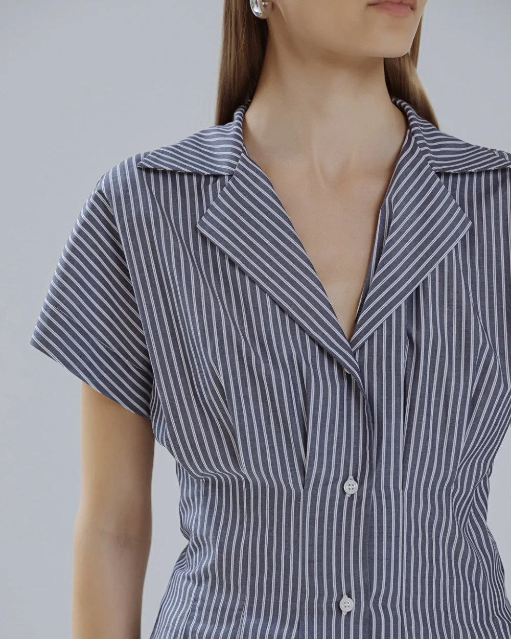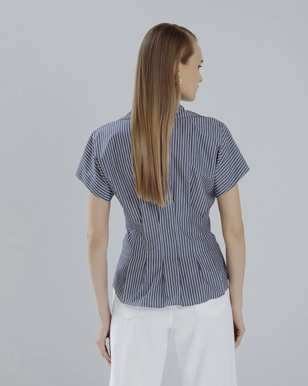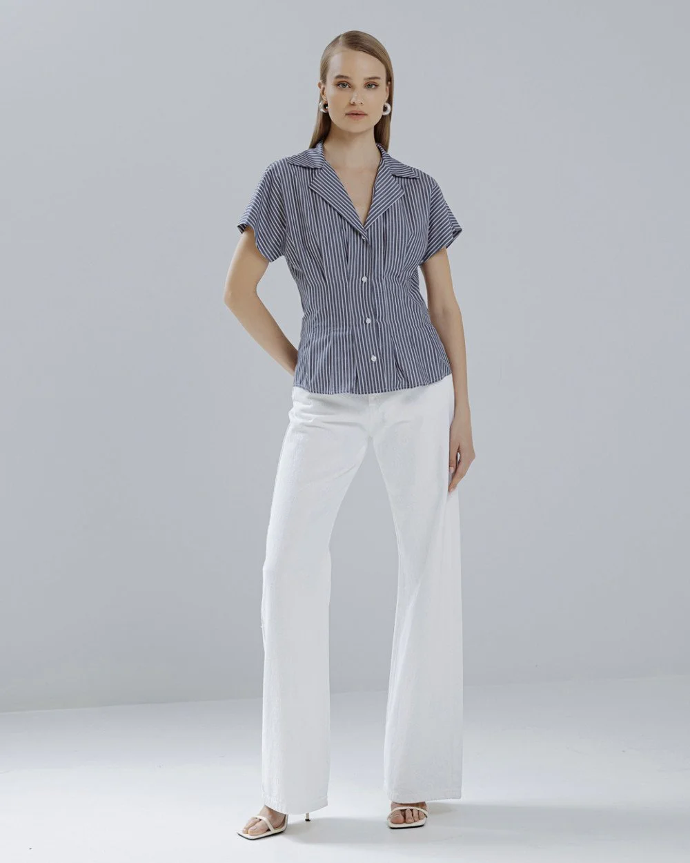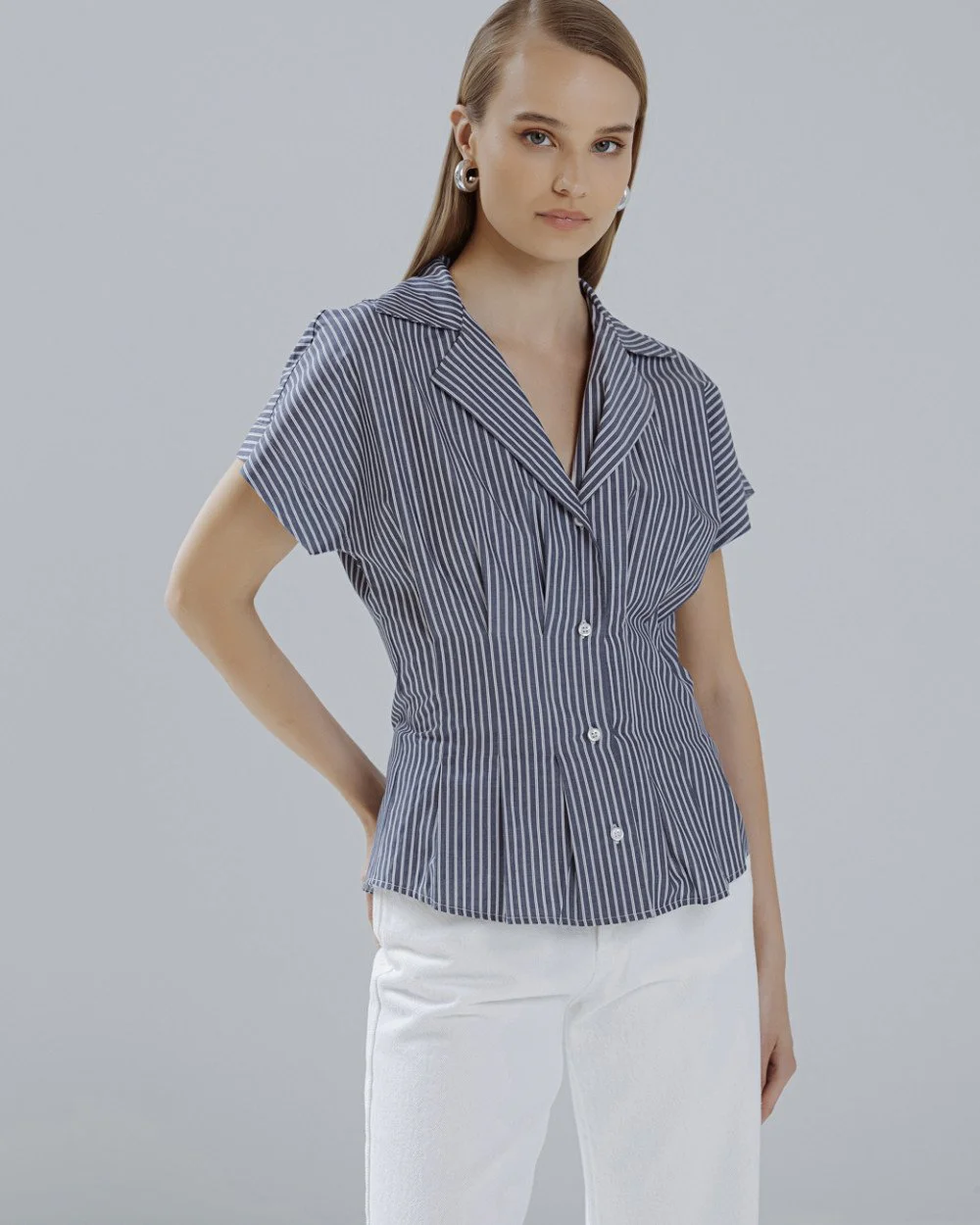 Striped fitted shirt from Access Fashion with a lapel collar and short sleeves. Features pleated details and button fastening at the front.