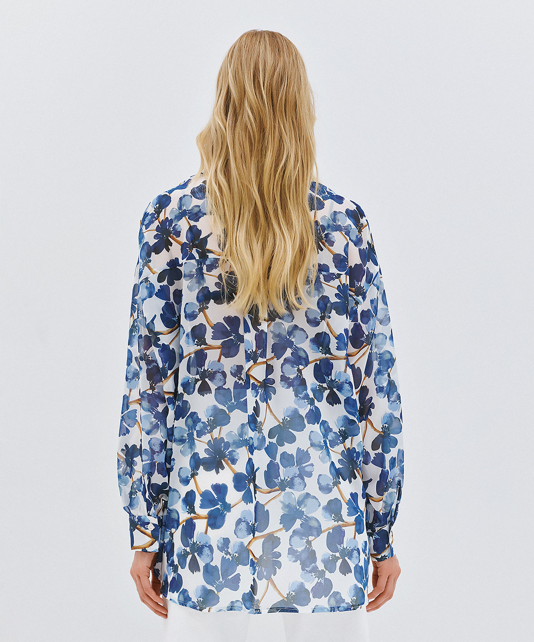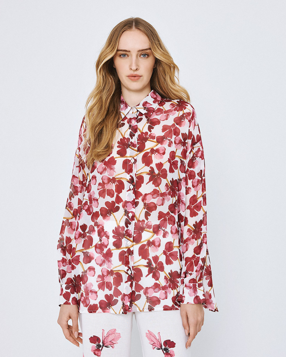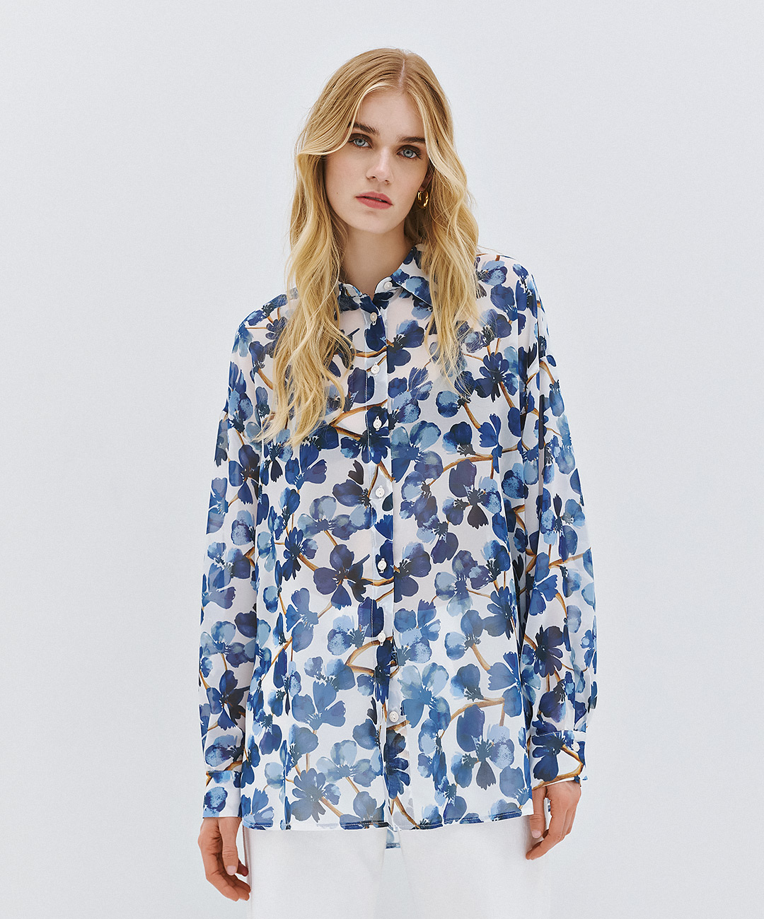 A lightweight, flowy shirt featuring an all-over floral print on a soft white base. Designed with a classic collar and front button closure. The relaxed fit and long sleeves with buttoned cuffs add comfort.