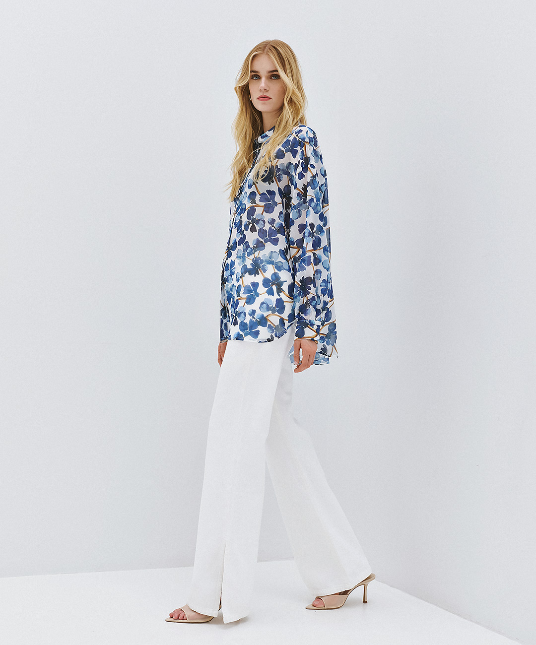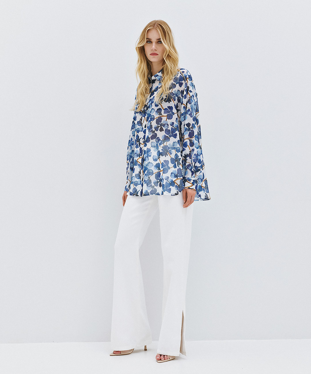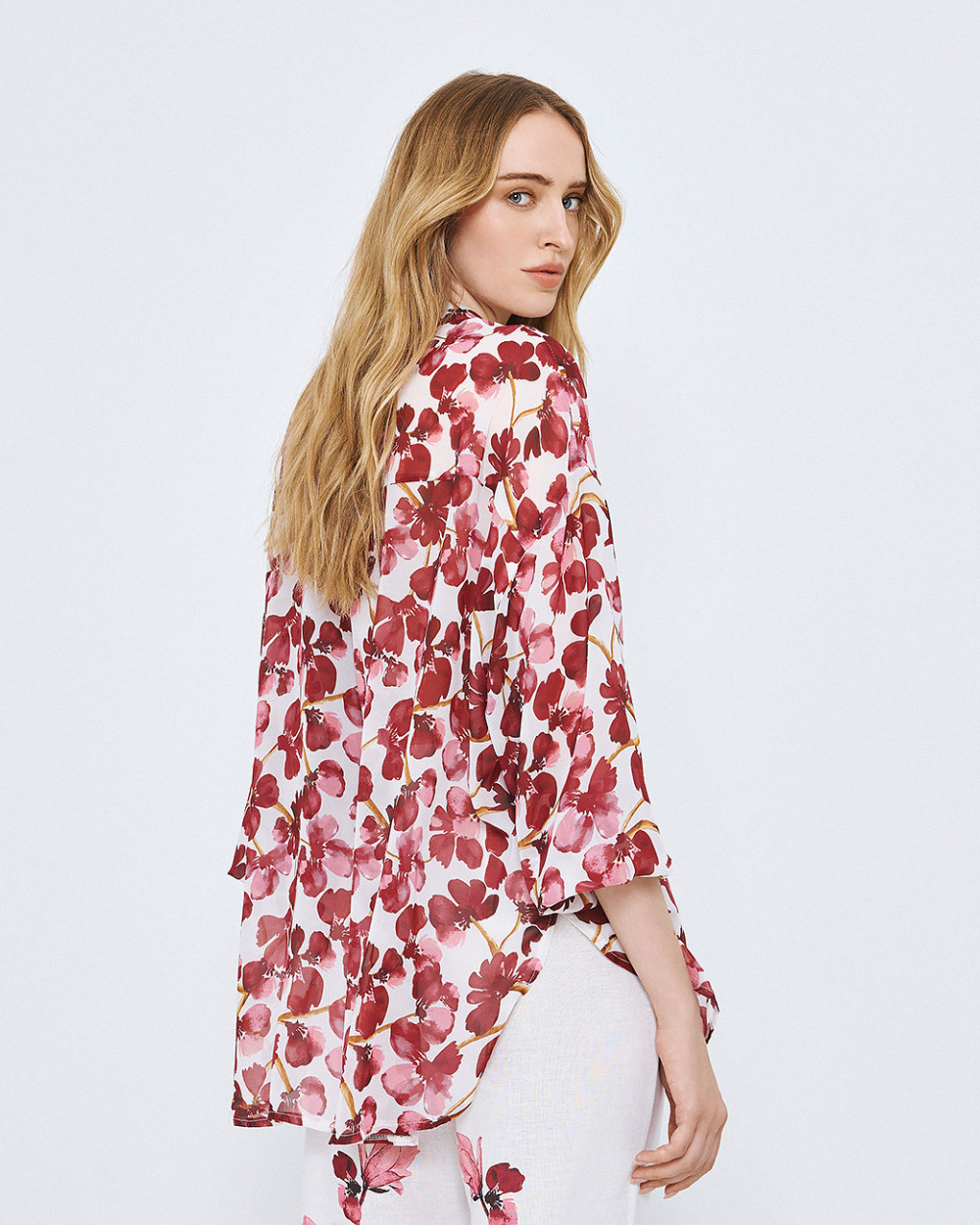 A lightweight, flowy shirt featuring an all-over floral print on a soft white base. Designed with a classic collar and front button closure. The relaxed fit and long sleeves with buttoned cuffs add comfort.