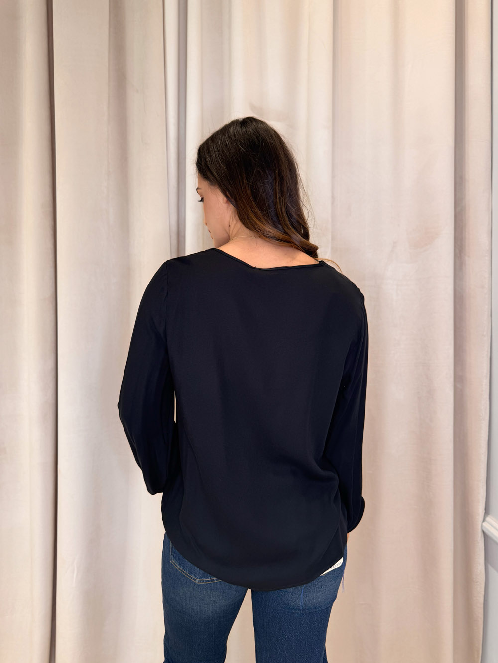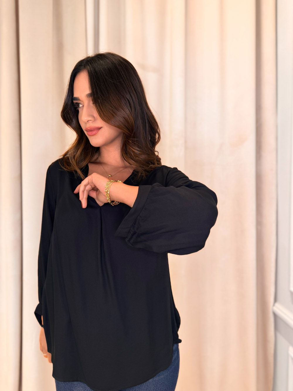 Flowy blouse designed with a relaxed silhouette, it drapes beautifully over the body. The soft v-neckline adds a subtle feminine touch, while a delicate pleat at the front and the long sleeves give it versatility for both casual and polished looks.