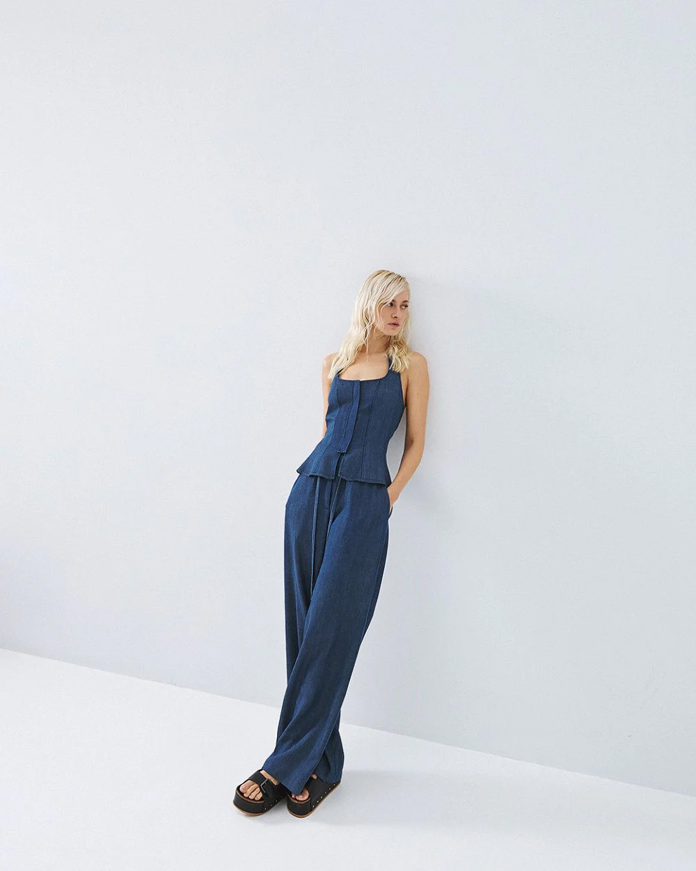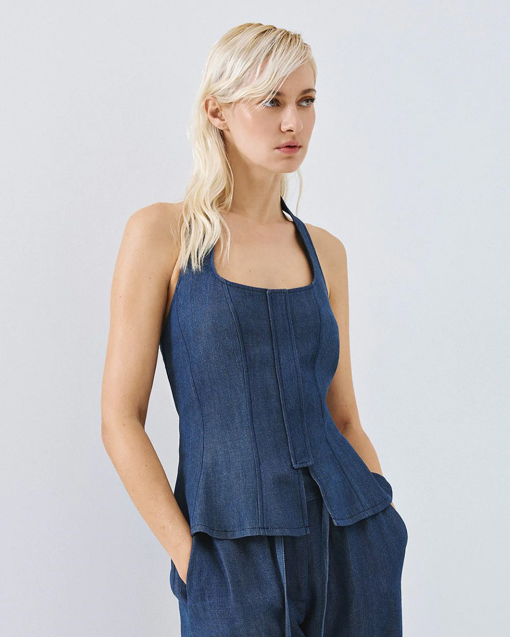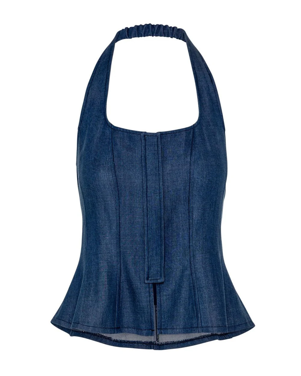 Halter corset-inspired top with a denim look and a peplum hem. Features an open back, an elasticated strap at the back of the neck and a front zip closure.