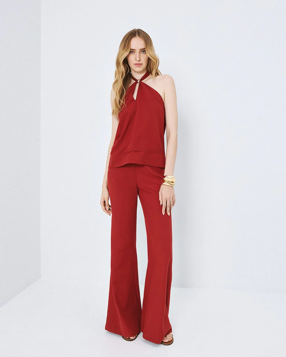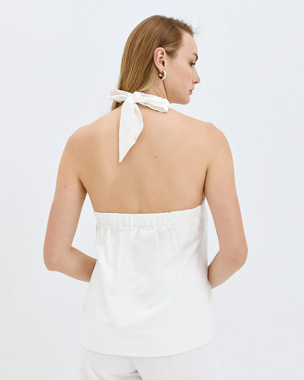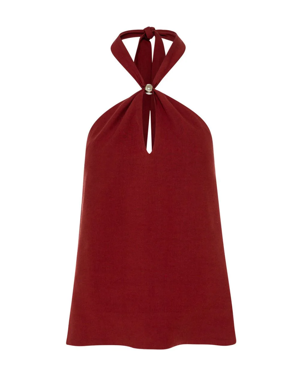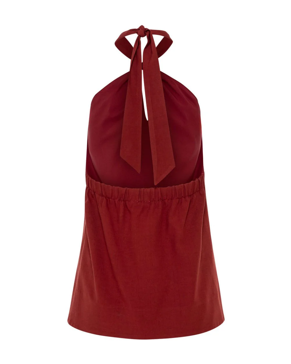 Halter top with front opening and metallic detail. Features tie fastening at the back of the neck and an open back with elastic.