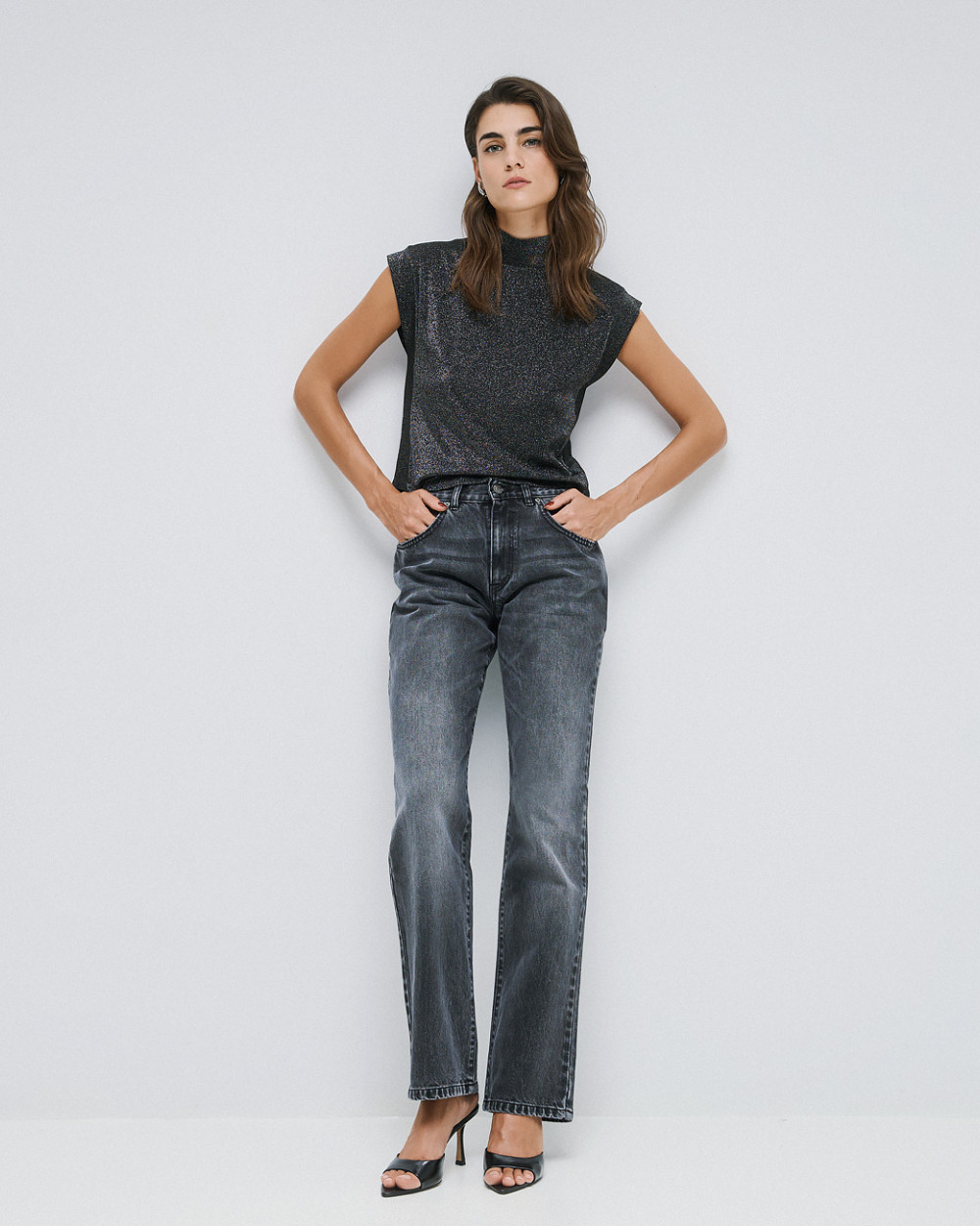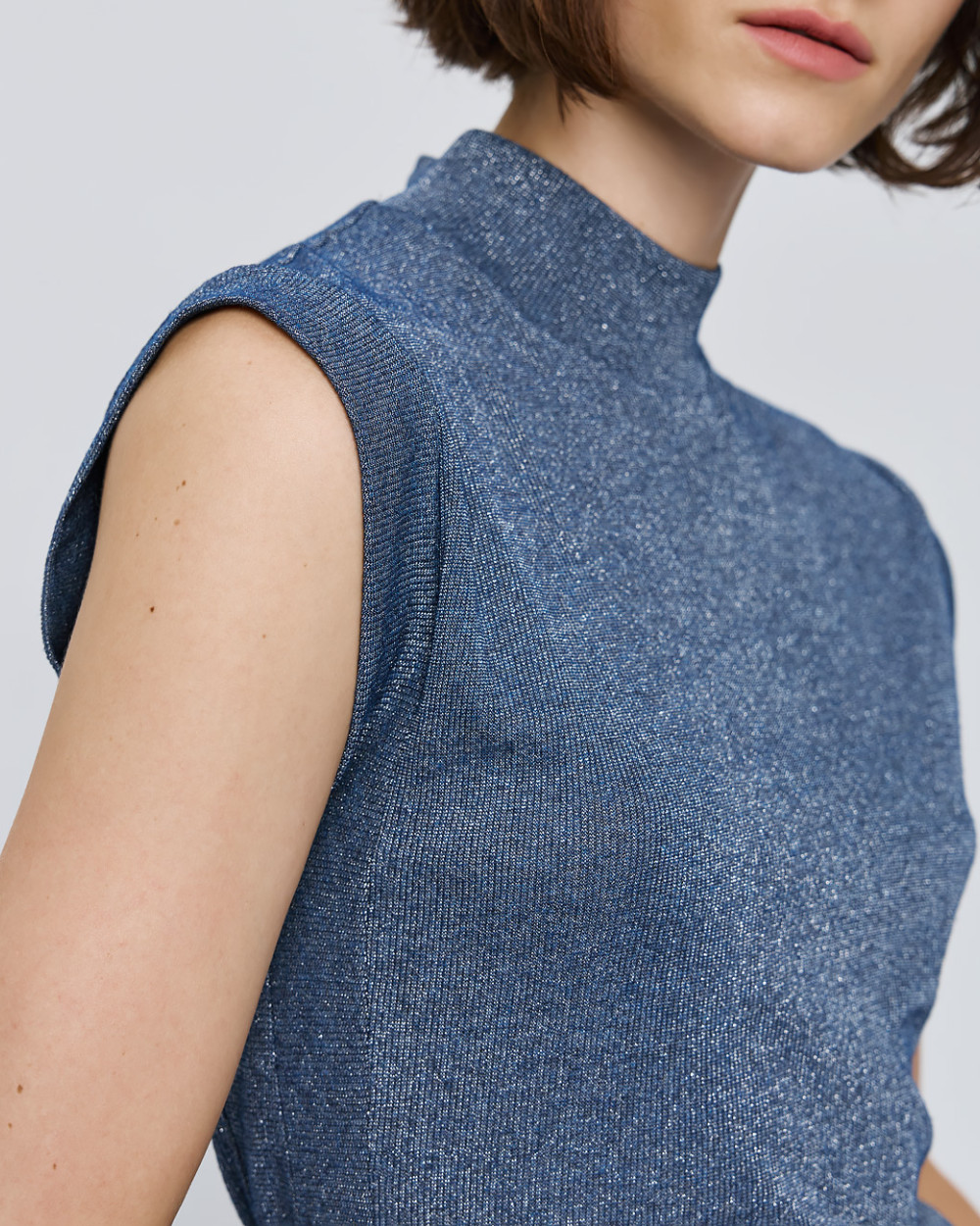 A sleeveless ribbed top crafted from shimmering lurex, designed with a sophisticated high neckline. A versatile staple that adds a touch of elegance and modernity to any wardrobe.