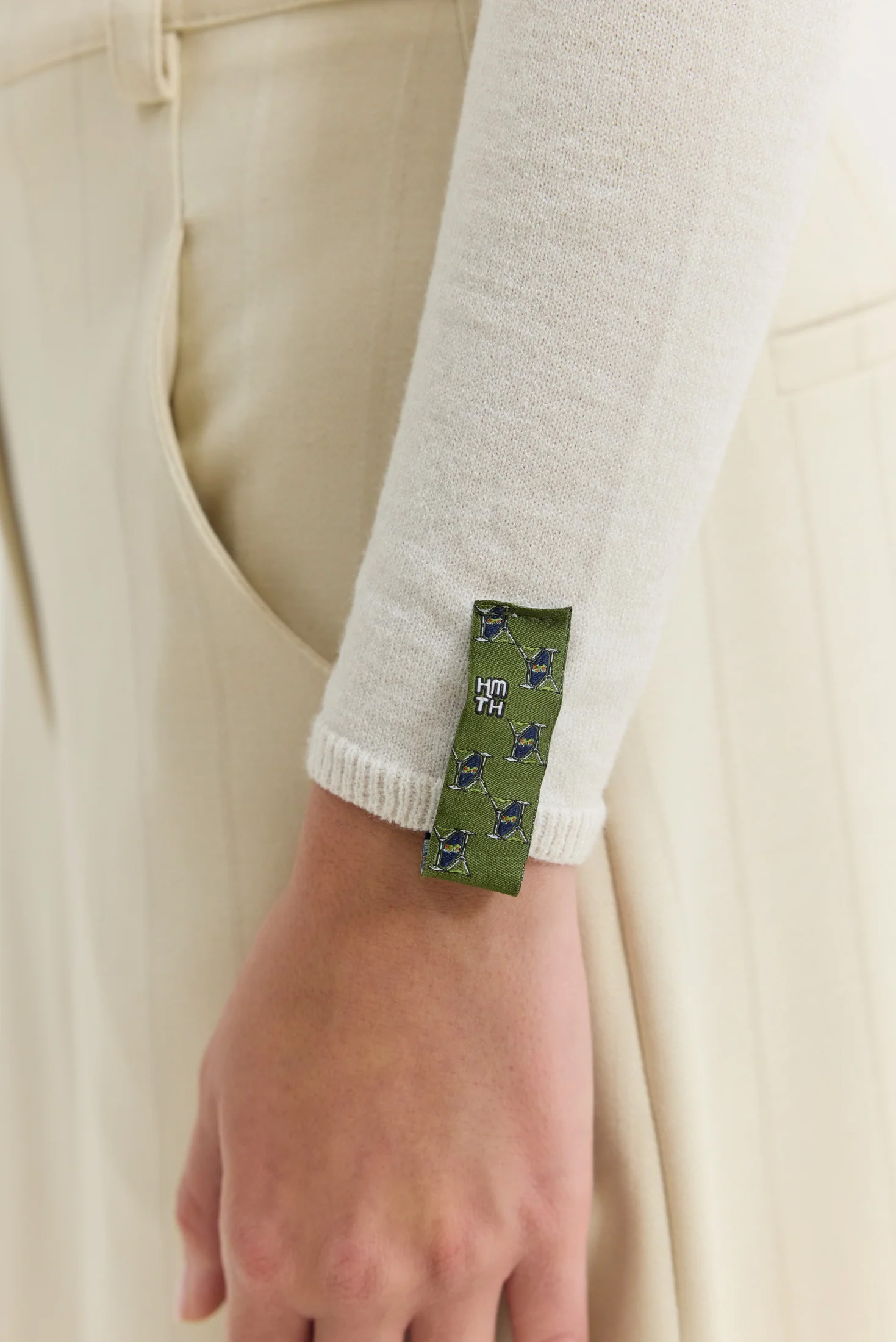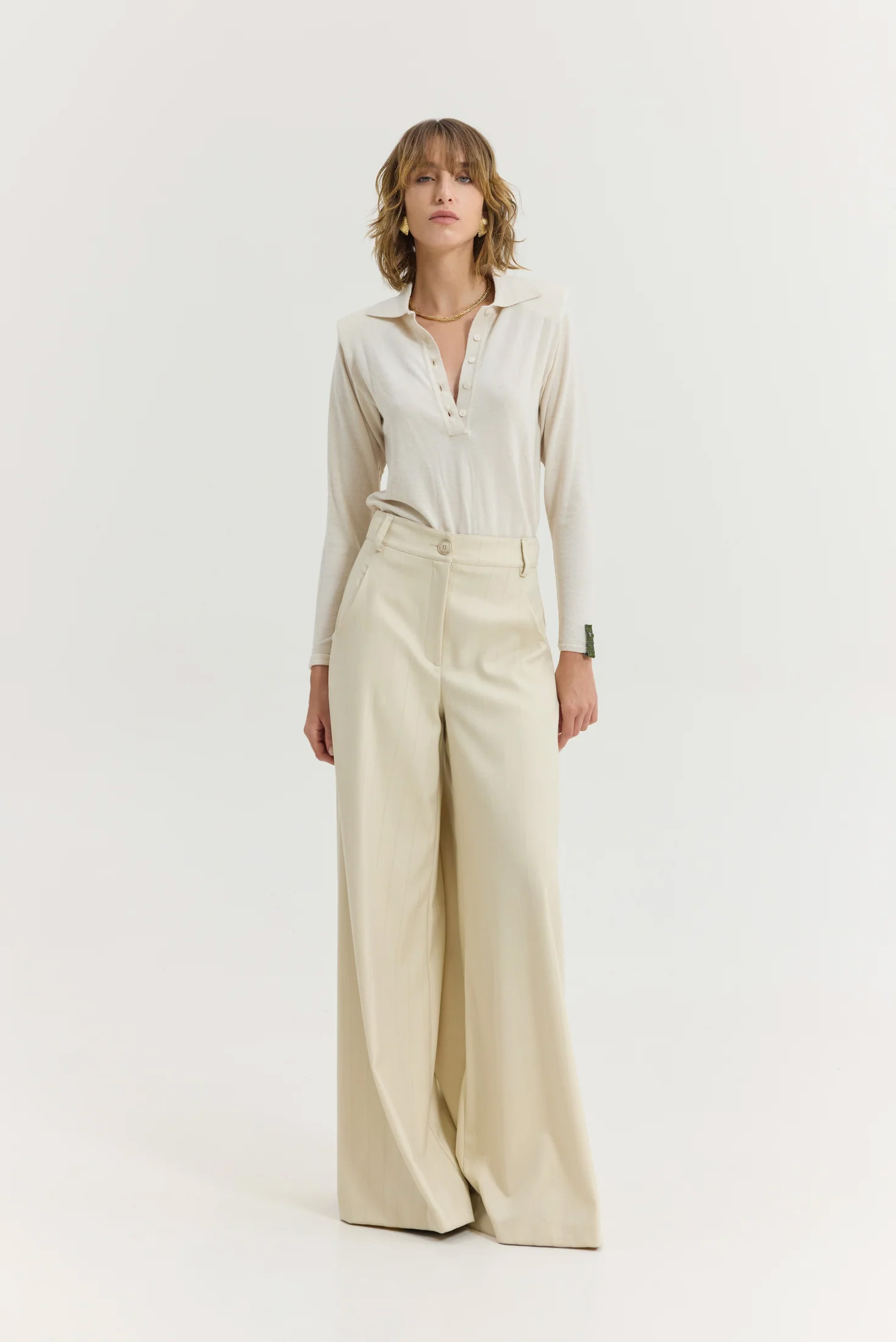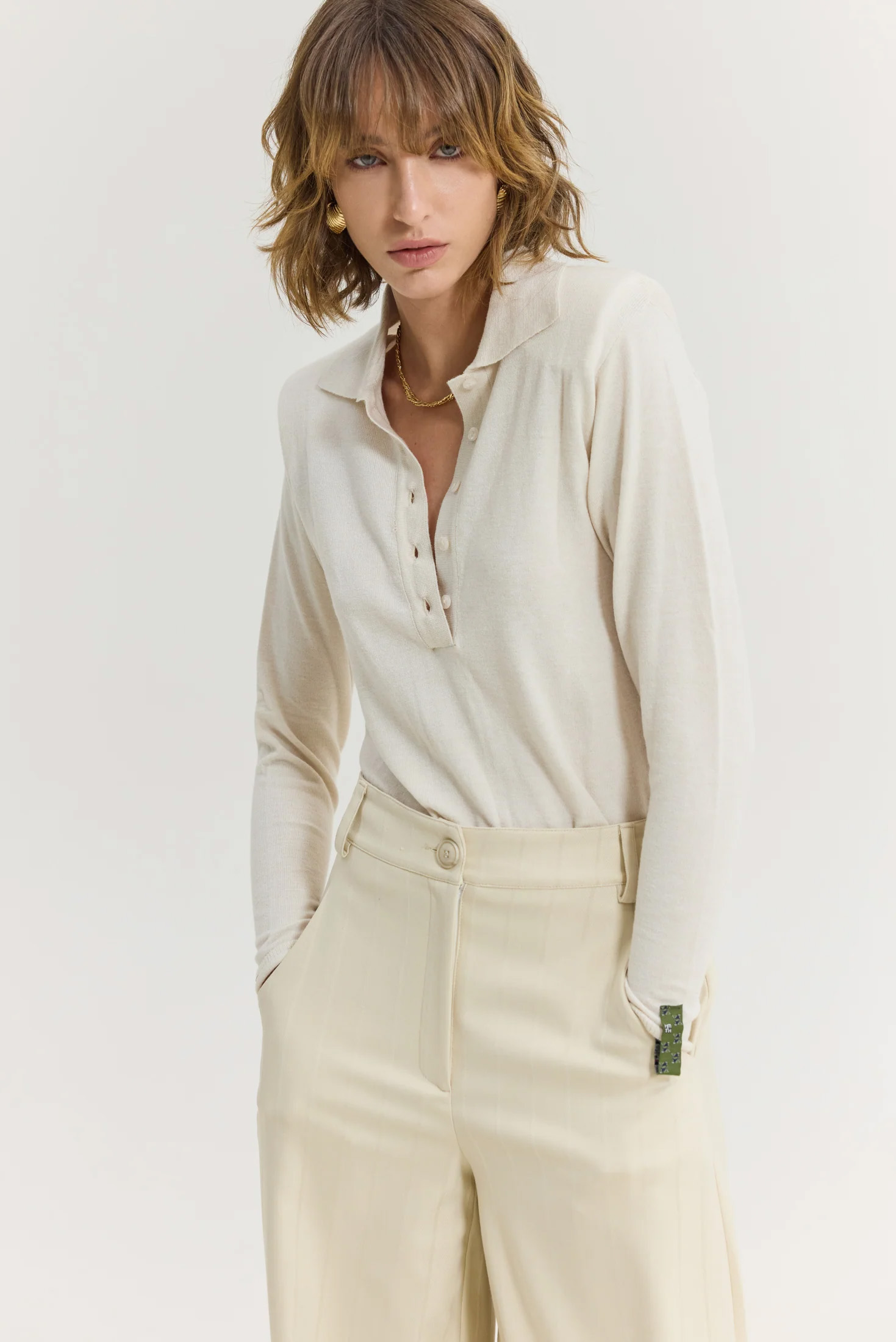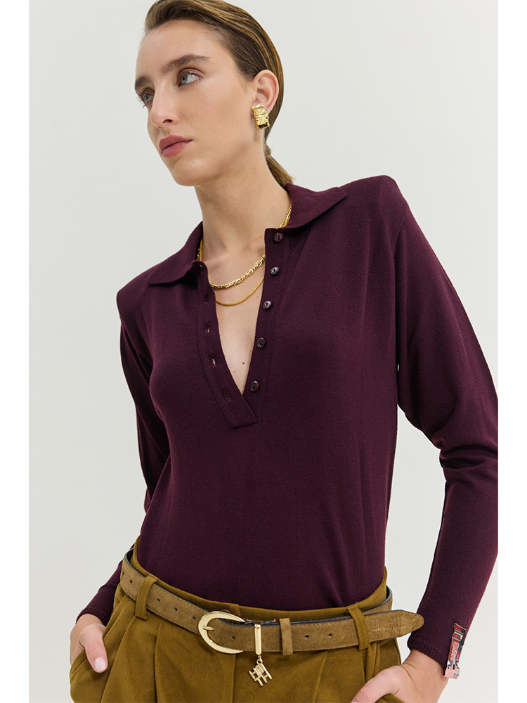 This top crafted from a smooth, lightweight knit fabric, it offers both comfort and elegance. The design features a deep v-neckline with a partial button placket. Its long sleeves and structured collar create a tailored silhouette, ideal for transitioning seamlessly from day to evening wear.