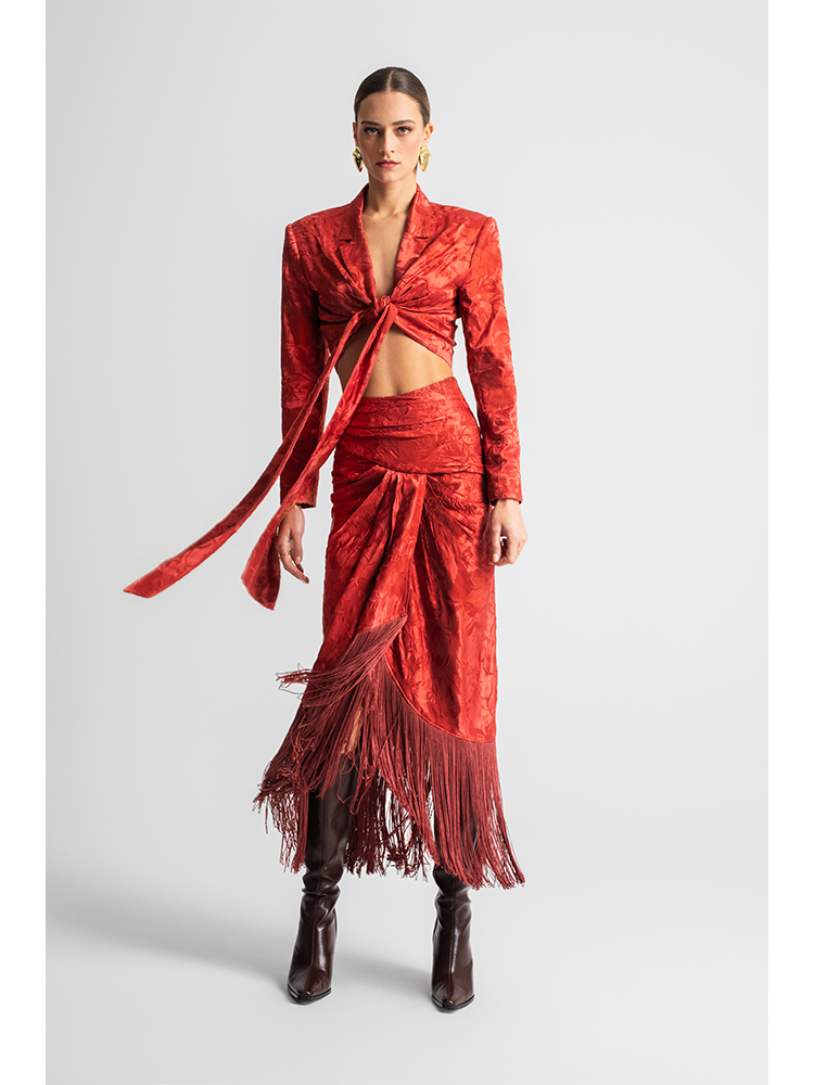 This coral jacquard wrap blouse is crafted from luxurious jacquard fabric with an intricate tonal pattern, it features a deep v-neckline, structured shoulders, and a front tie closure and long sleeves. Perfect for pairing with the matching jacquard trousers for an unforgettable evening look.