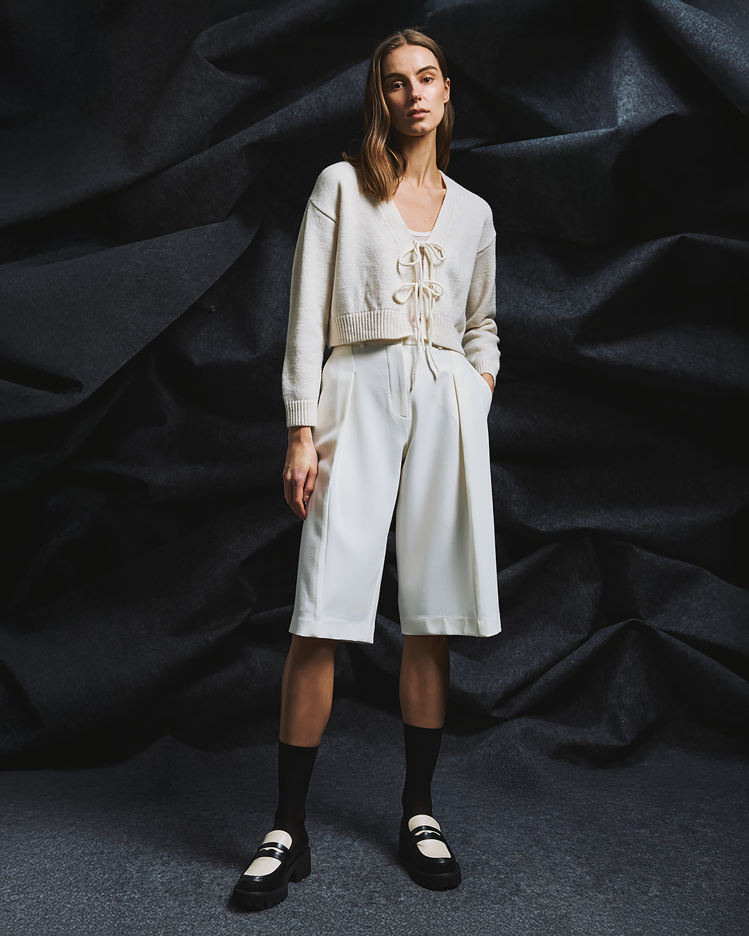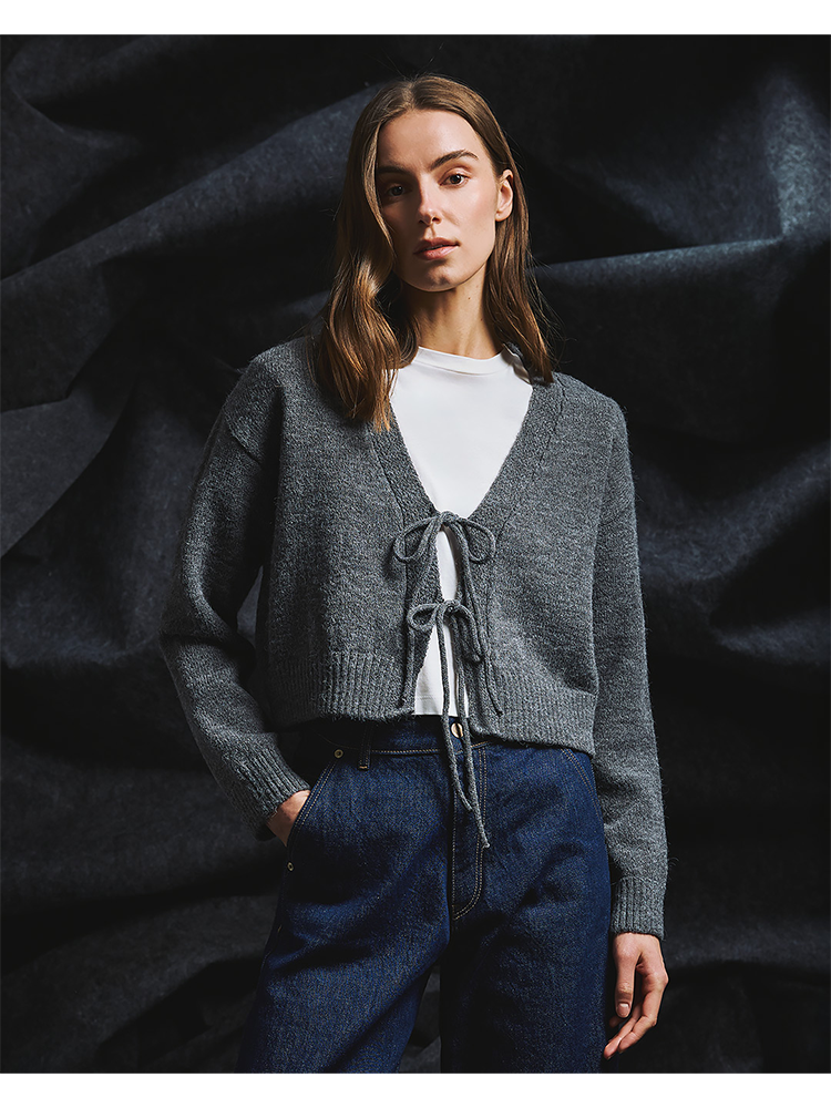 Knit cardigan with a relaxed silhouette with a v-neckline and playful front tie closures, it brings effortless charm to any outfit. Crafted from soft knit fabric, this cardigan is perfect for wearing over a simple tee or styling with tailored trousers and denim.