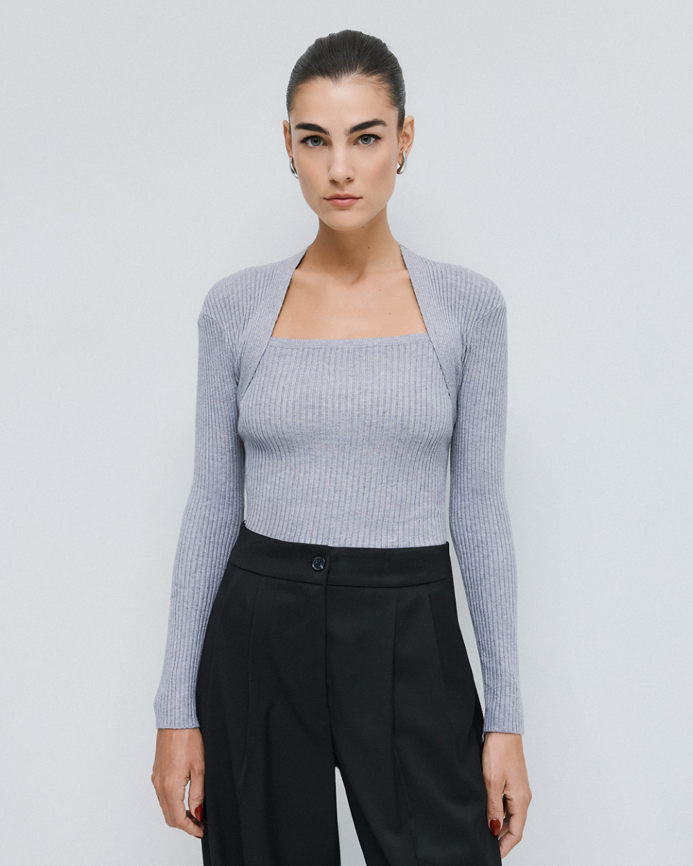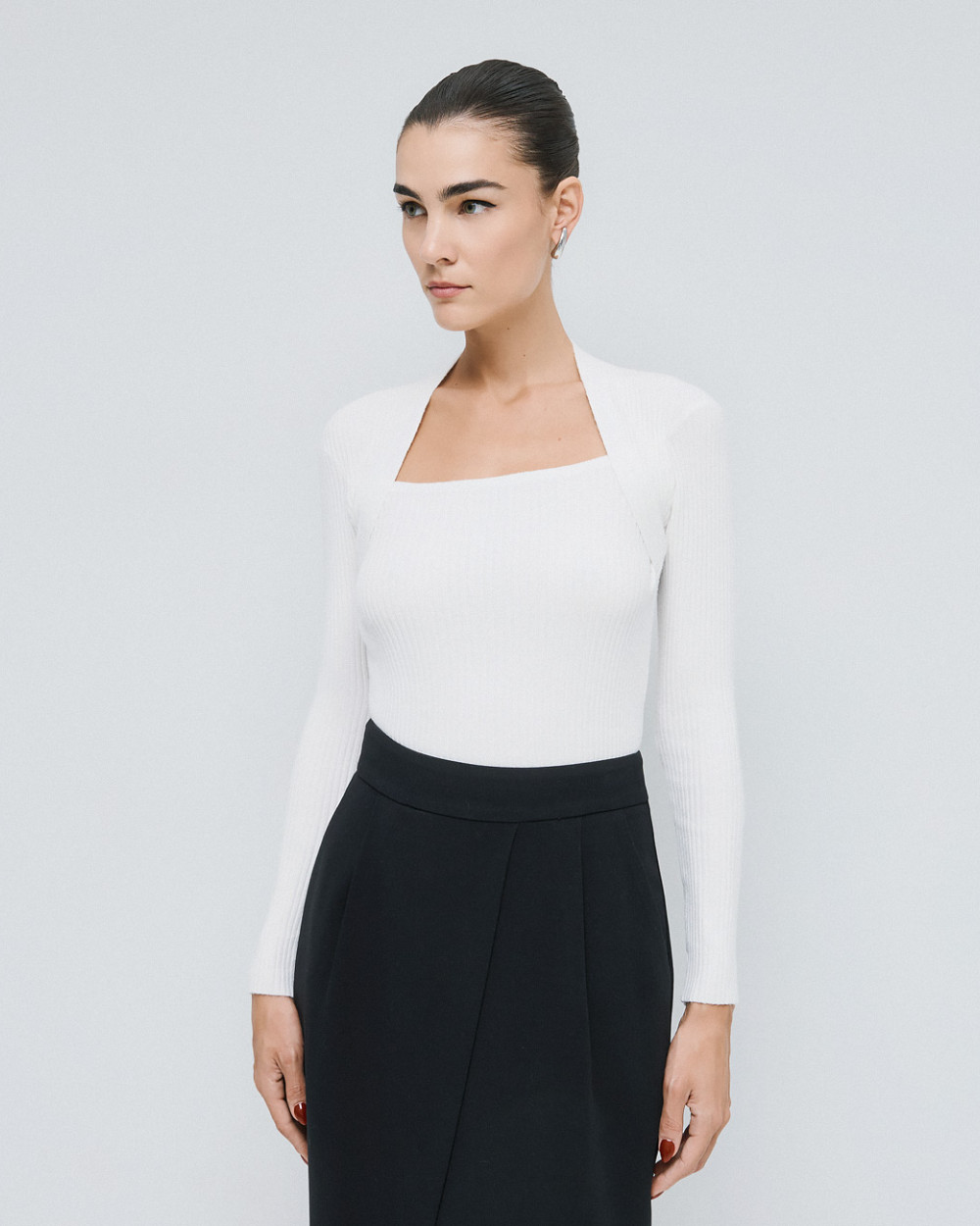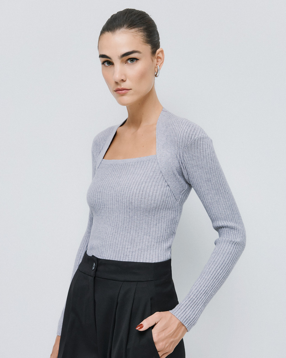 Knitted rib blouse with long sleeves and a distinctive square neckline. A chic and stylish choice for warm, everyday looks.