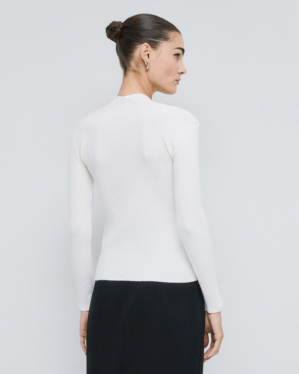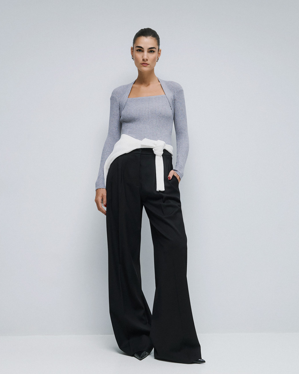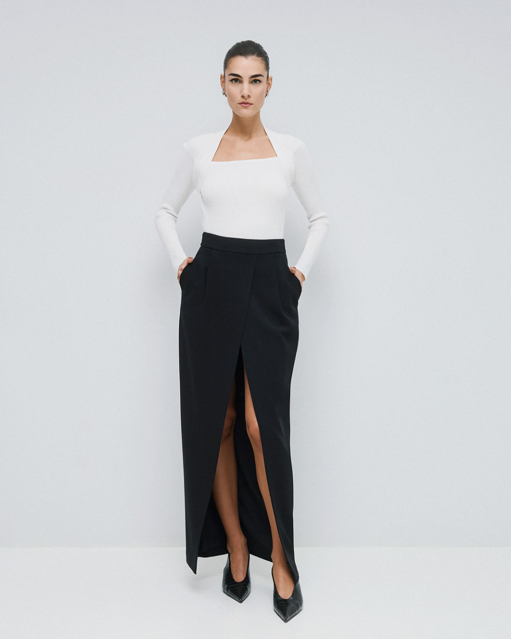 Knitted rib blouse with long sleeves and a distinctive square neckline. A chic and stylish choice for warm, everyday looks.