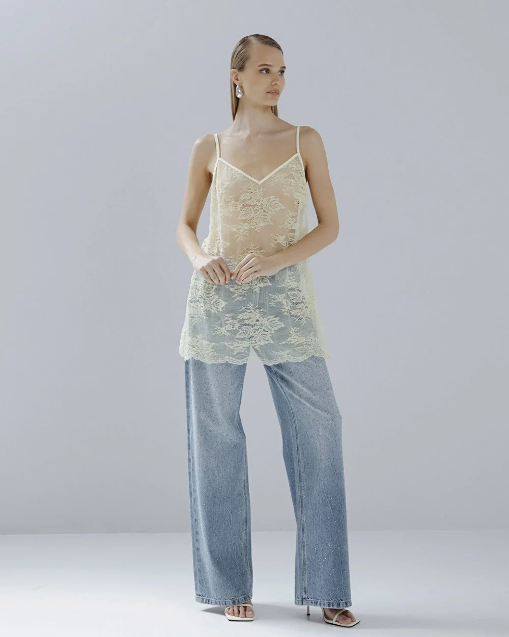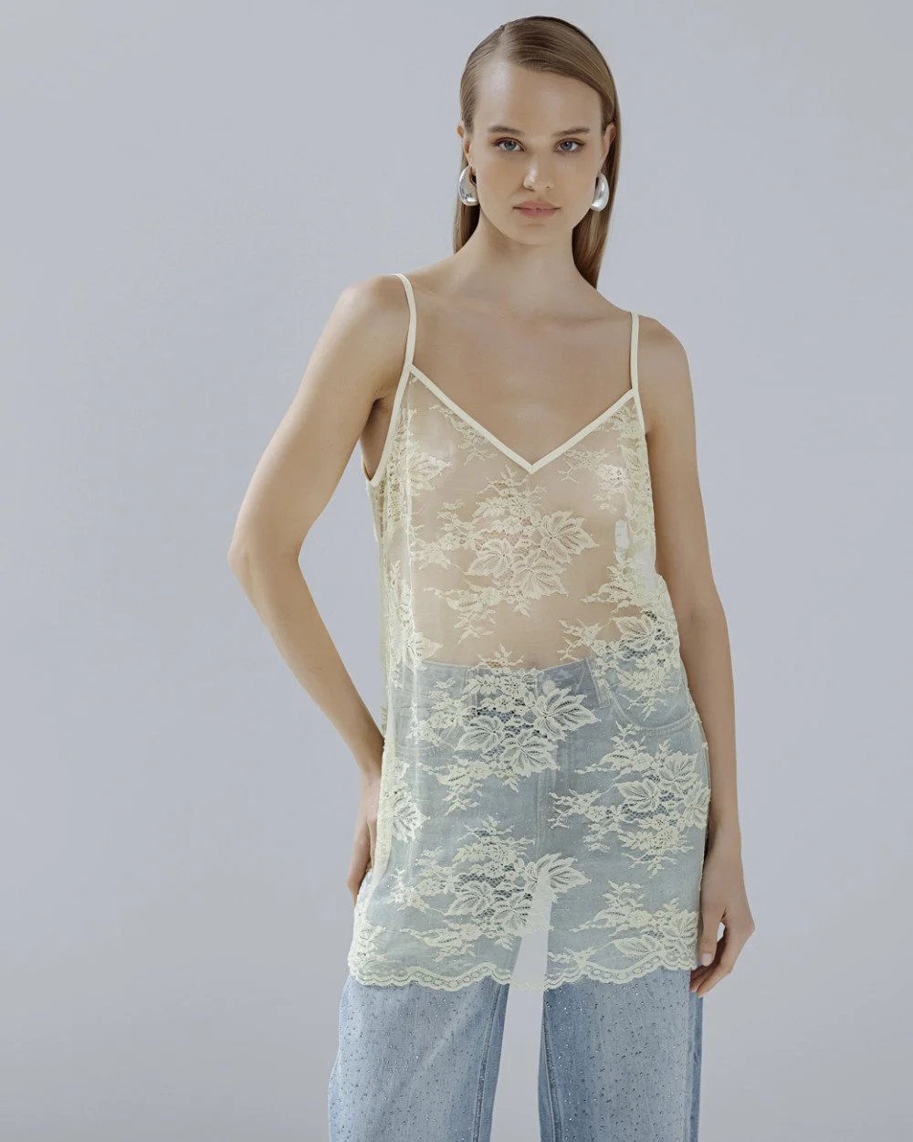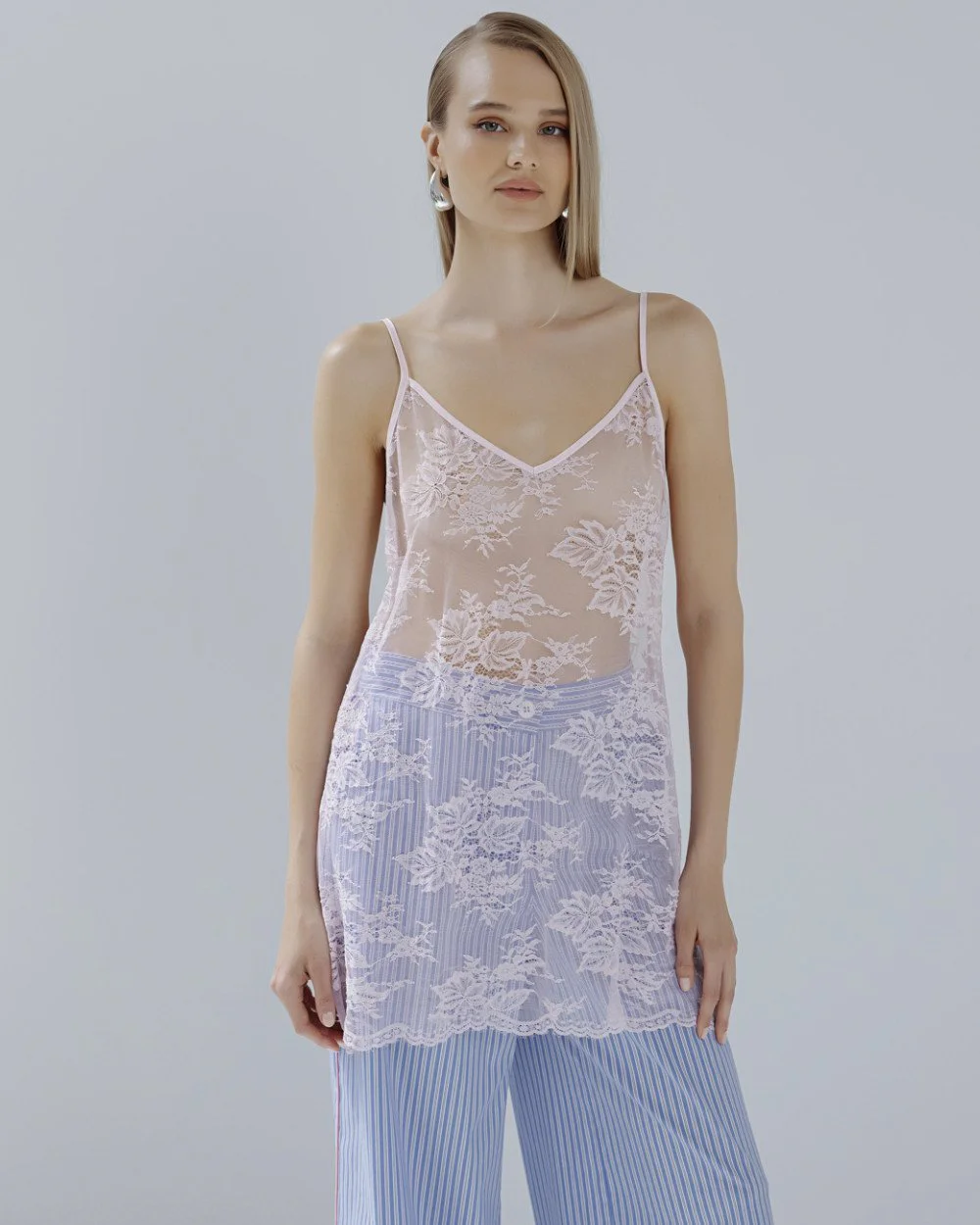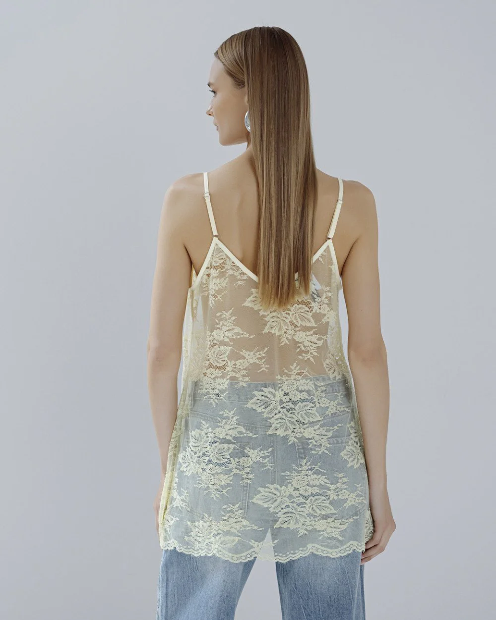 Long lace top with a v-neckline, v-back and thin adjustable straps.