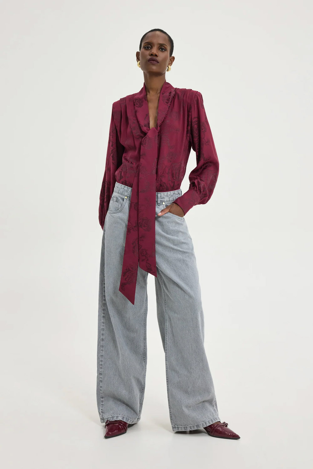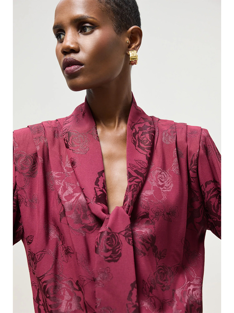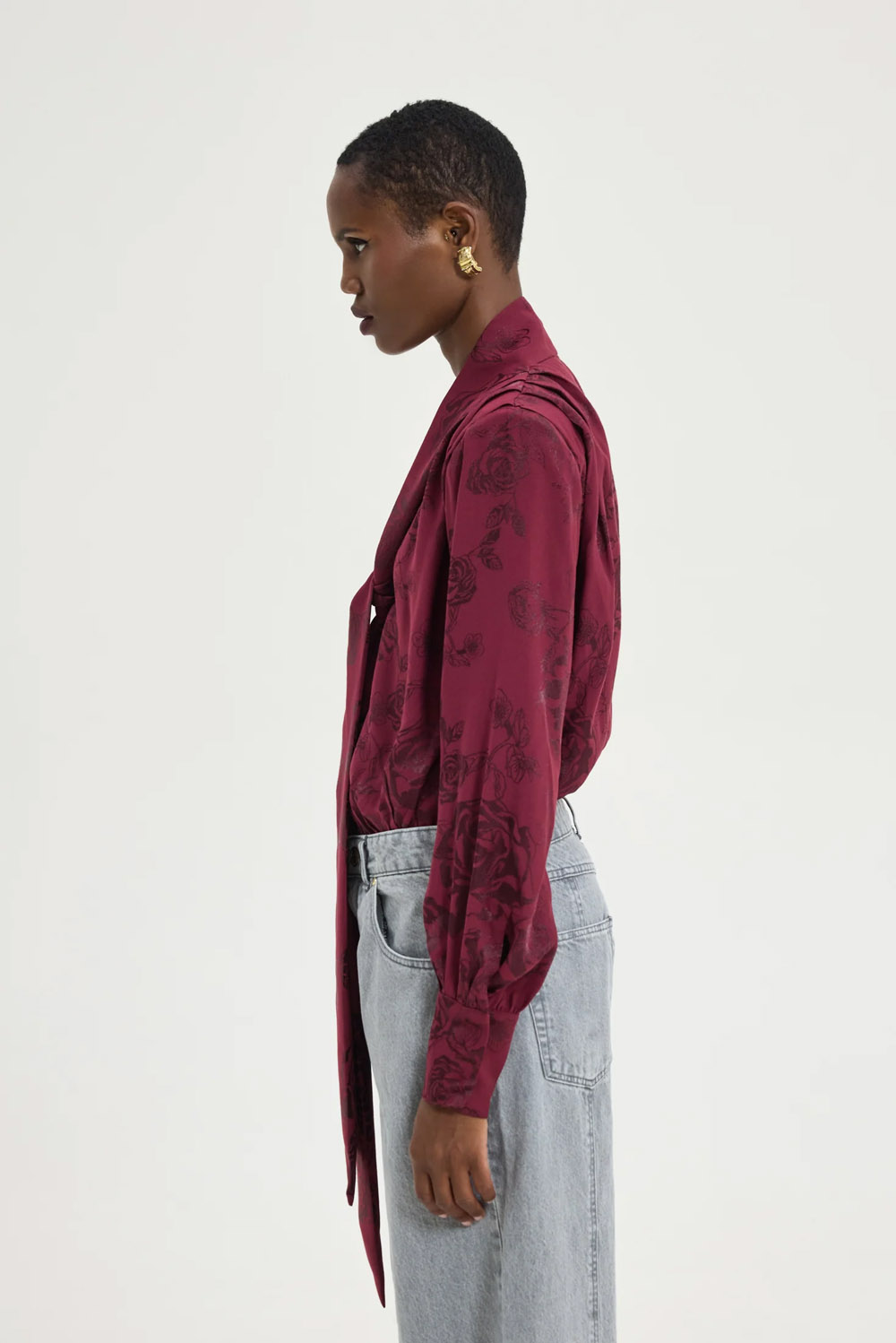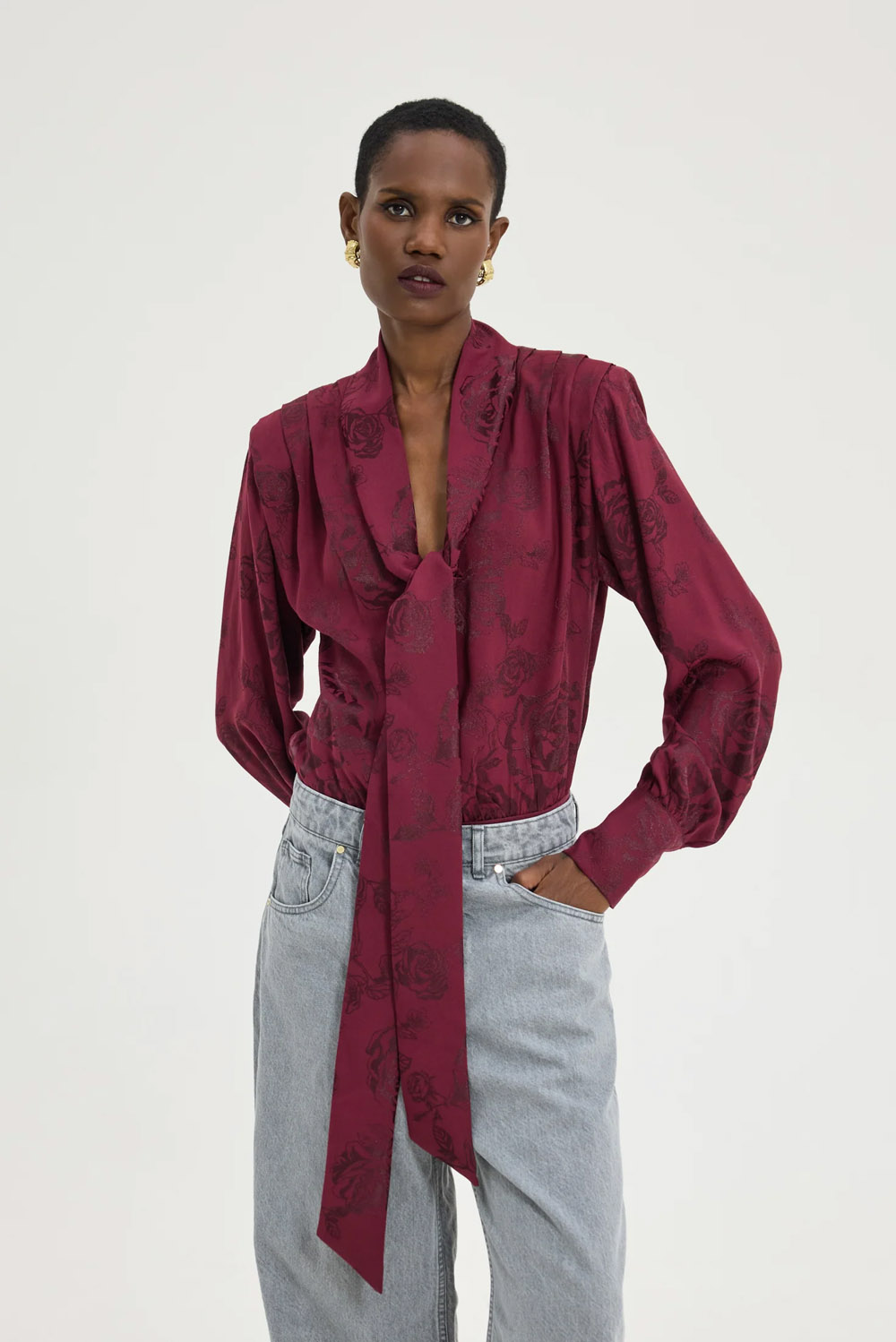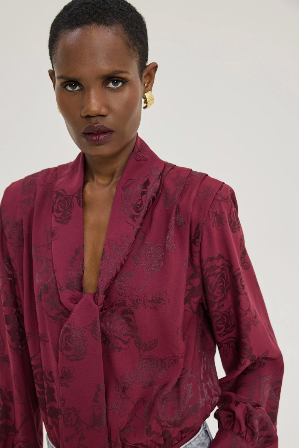 The Liquer body from Hemithea is a jacquard satin viscose body crafted with tone-on-tone floral detailing. Featuring bold shoulder pads, subtle ruching, long sleeves, decorative fabric-covered buttons, and a V-neck with a delicate scarf detail, it combines structure with elegance. The soft, breathable fabric was carefully developed with a custom Bordeaux print to achieve the perfect color and balance.