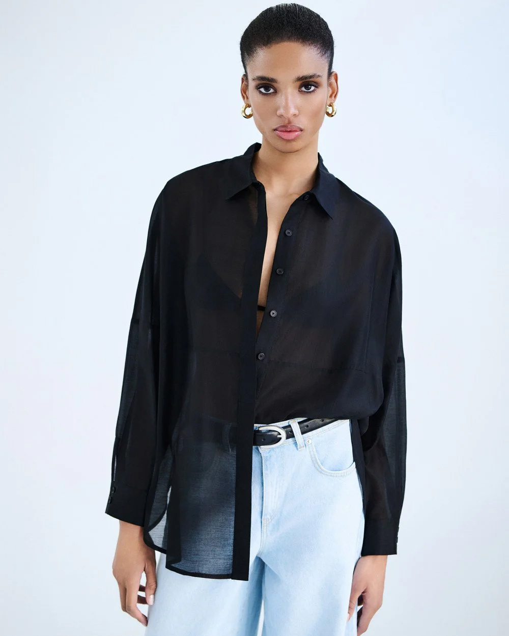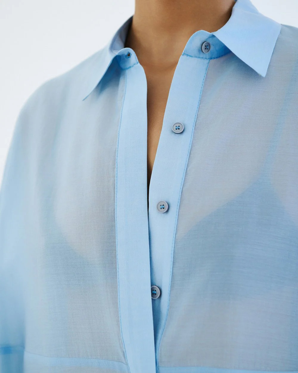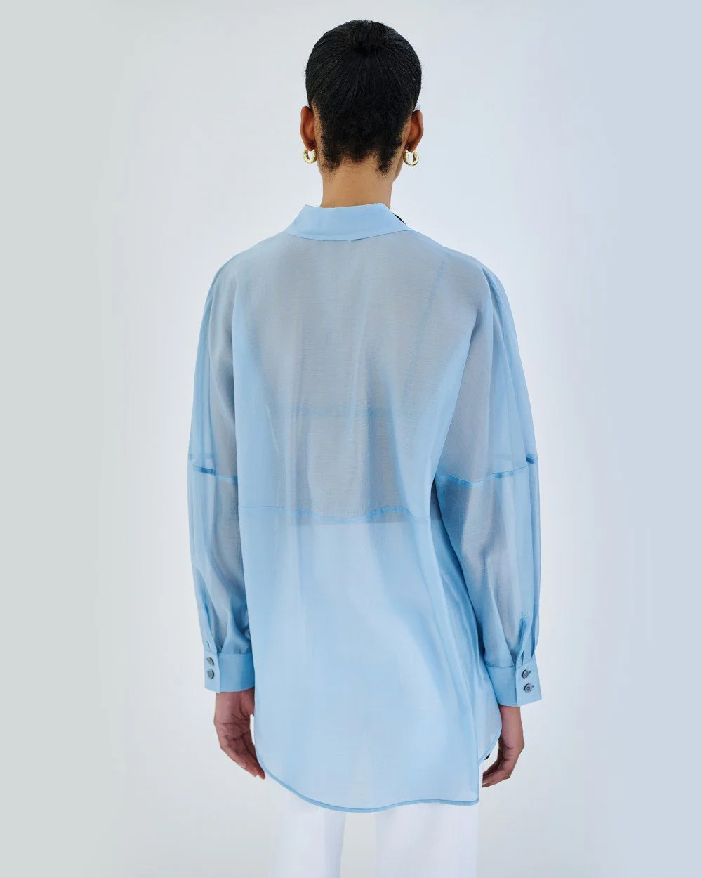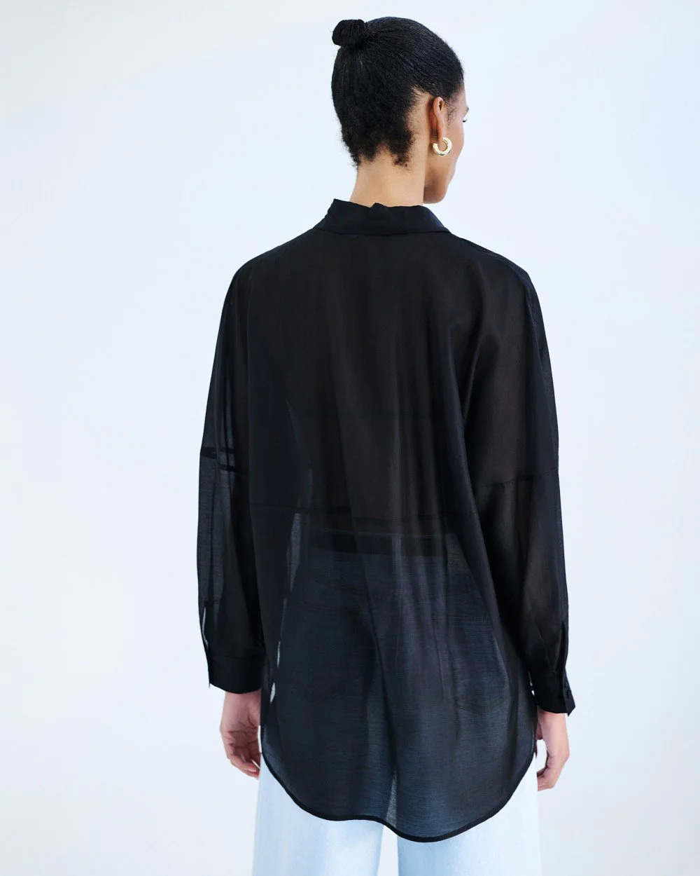 Oversized semi-sheer shirt with long sleeves, a collar, and a curved hem. Featuring decorative stitching, a front closure with hidden buttons, and buttoned cuffs.