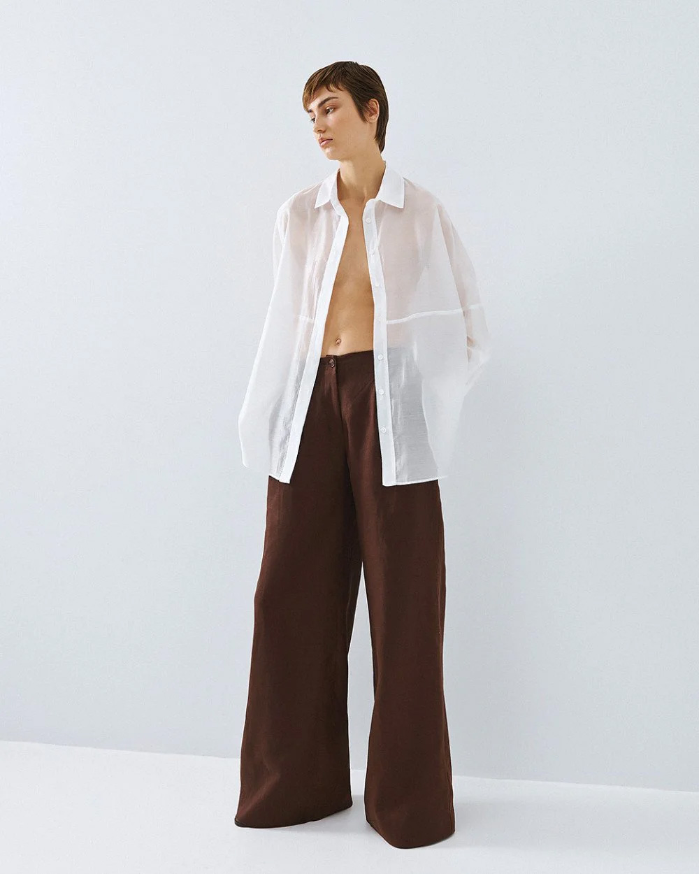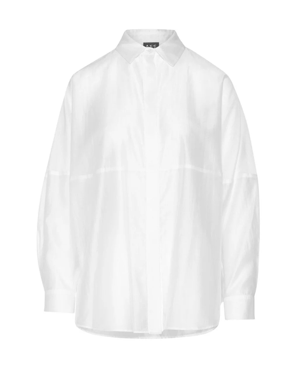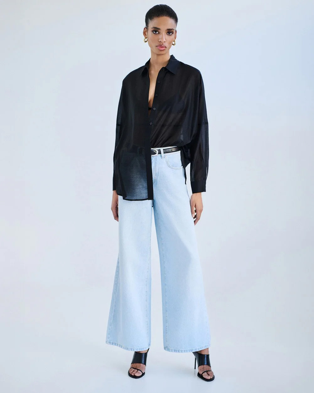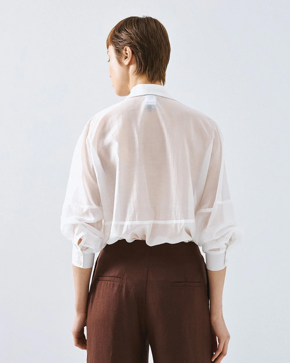 Oversized semi-sheer shirt with long sleeves, a collar, and a curved hem. Featuring decorative stitching, a front closure with hidden buttons, and buttoned cuffs.